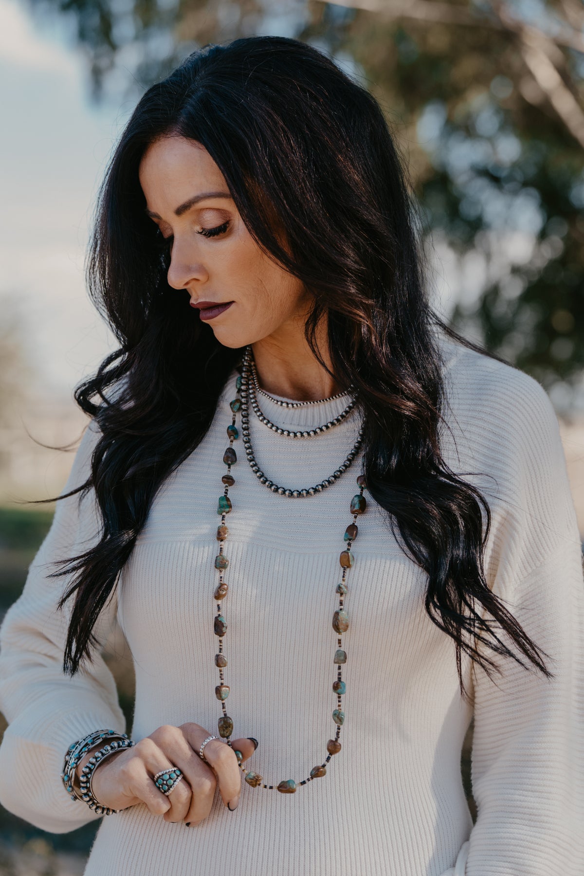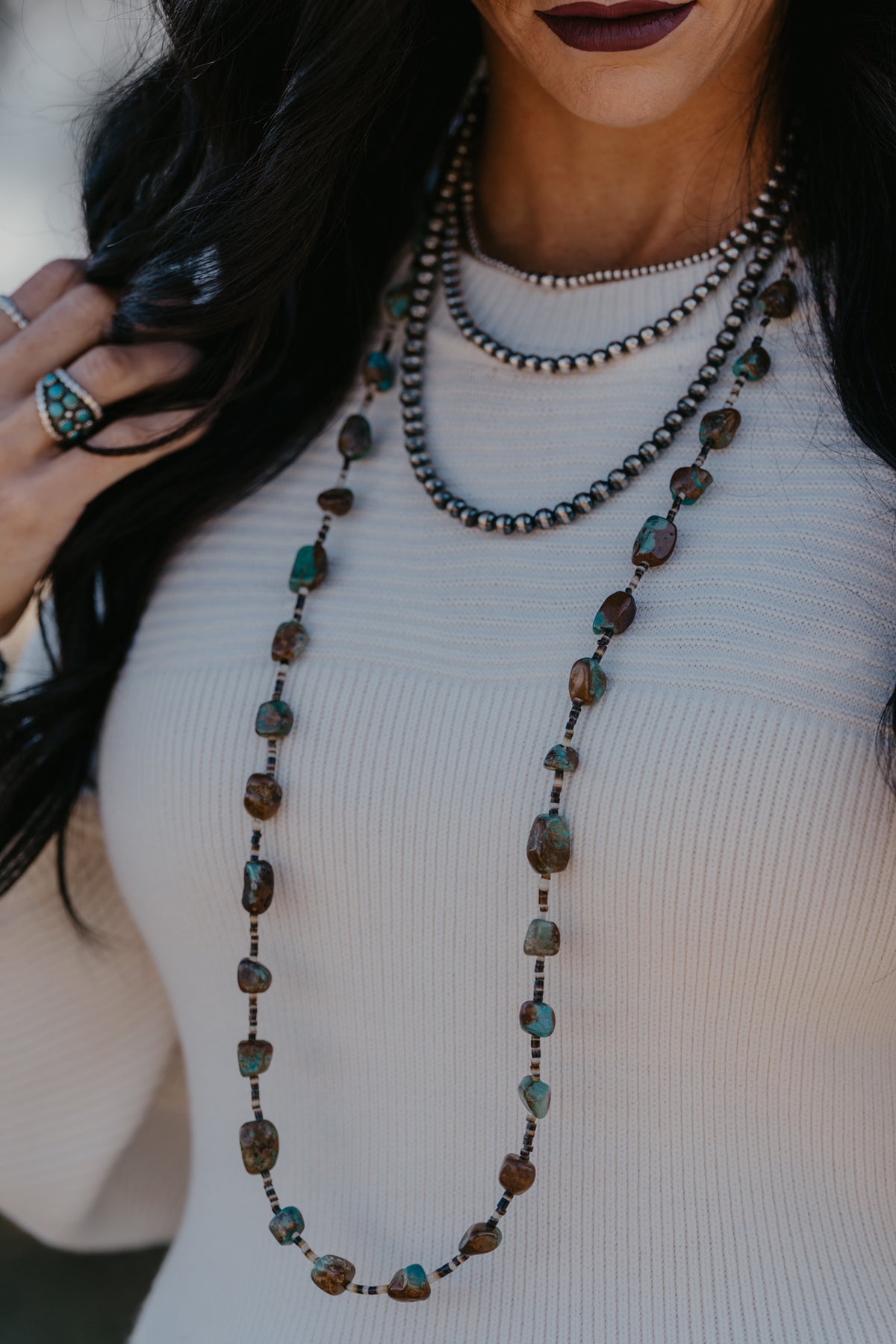 Make a statement with this gorgeous long turquoise nugget beads necklace with shell spacers. Hand beaded and truly each are one of a kind.