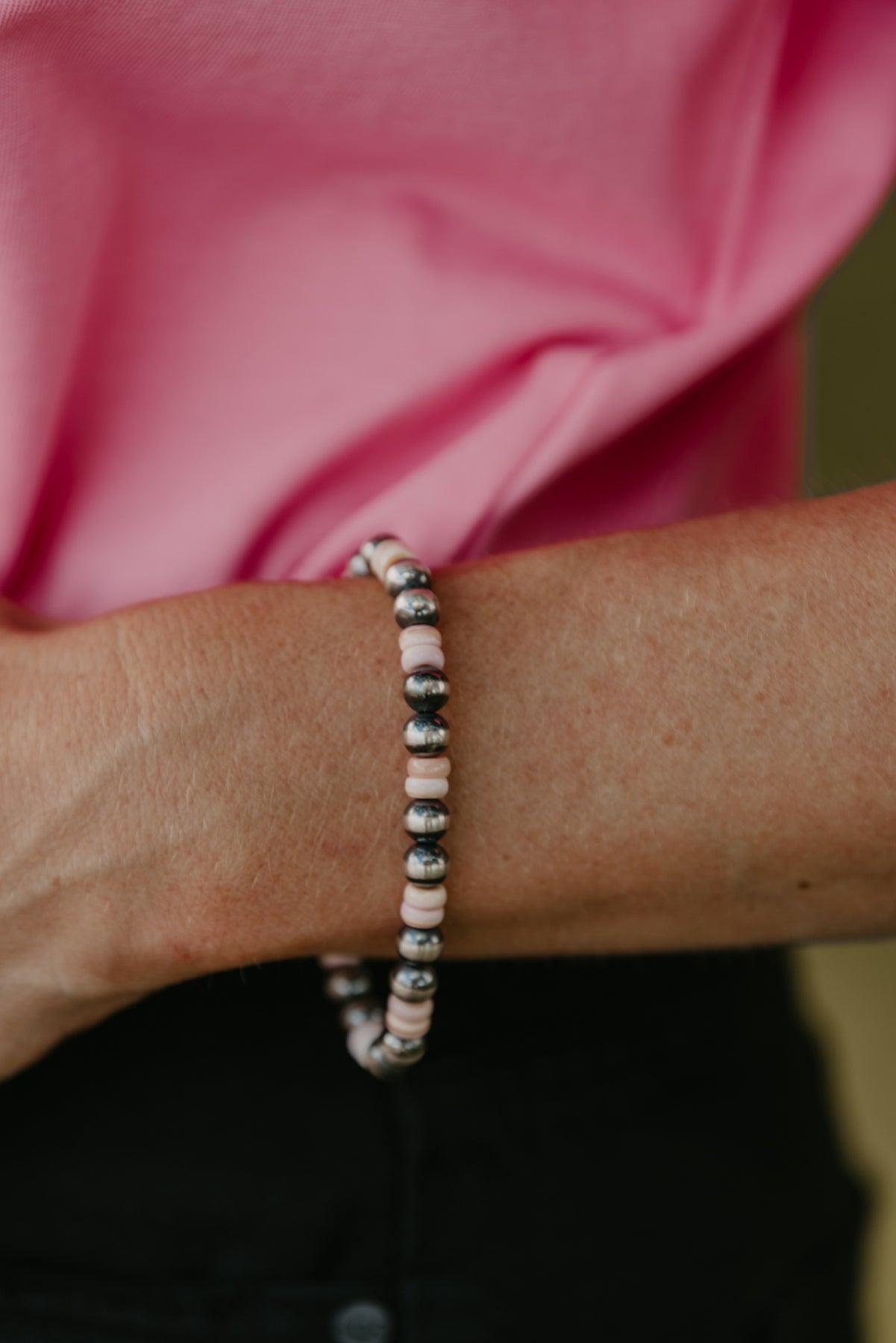 Pops of subtle pink to add to your arm candy. Elastic banded, stretchy, Navajo pearl bracelet.