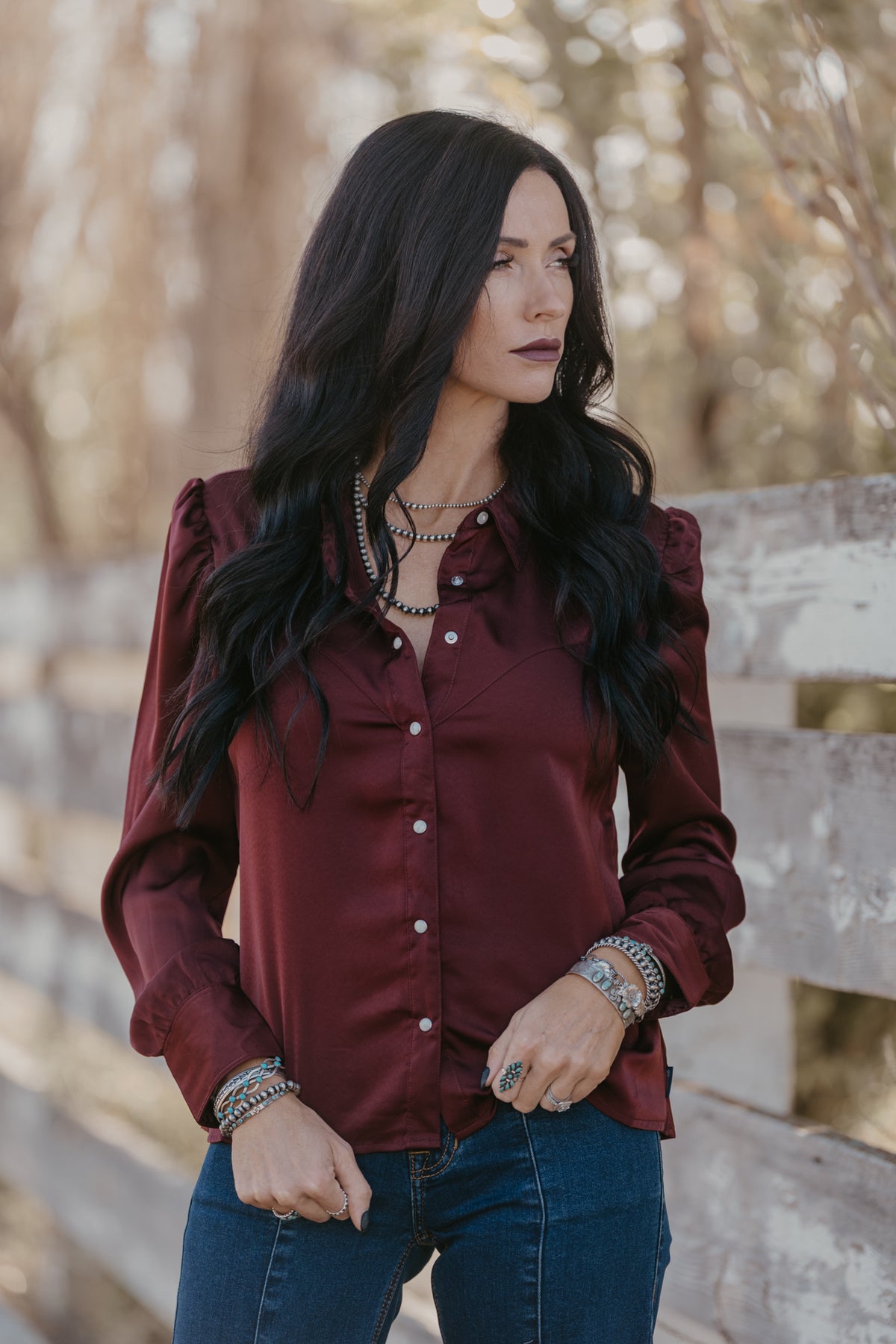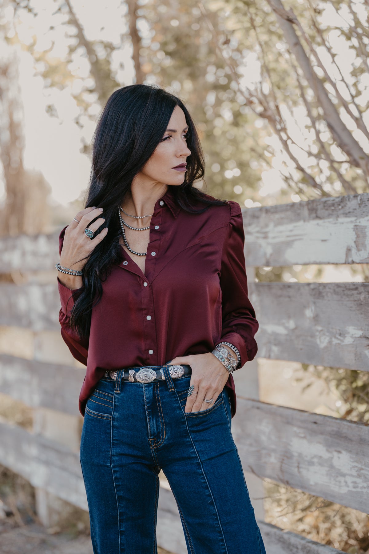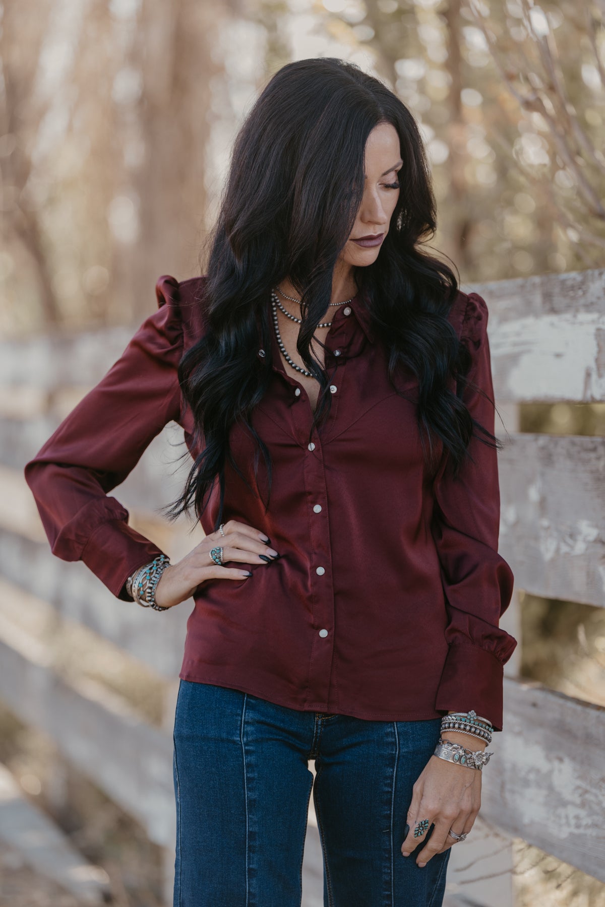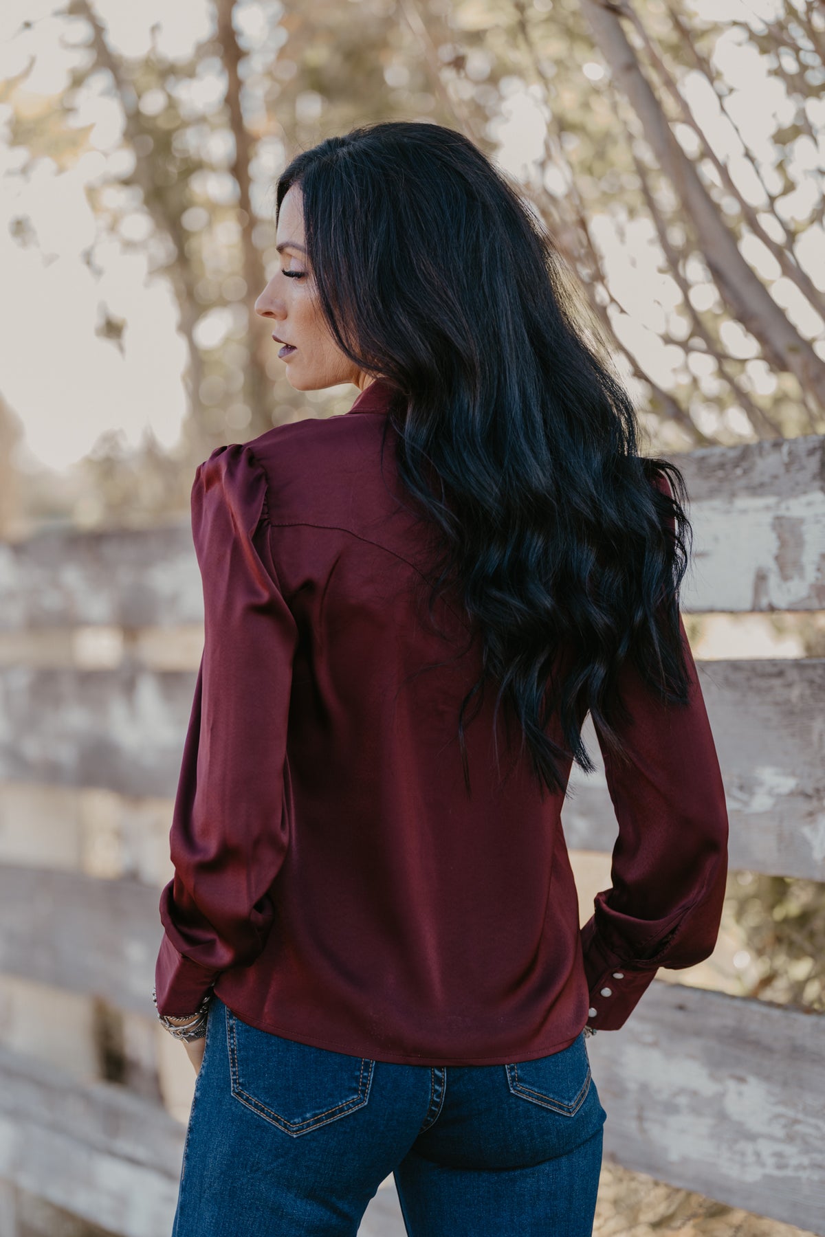 Add standout shimmer and shine to your look with this satin rodeo blouse with a retro vibe. Silky soft, the fabric caresses your skin. Pearlized buttons add even more polish. A fancy front yoke and spread collar combine for authentic Western beauty.