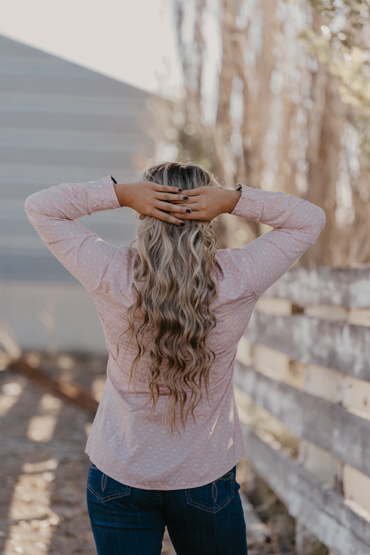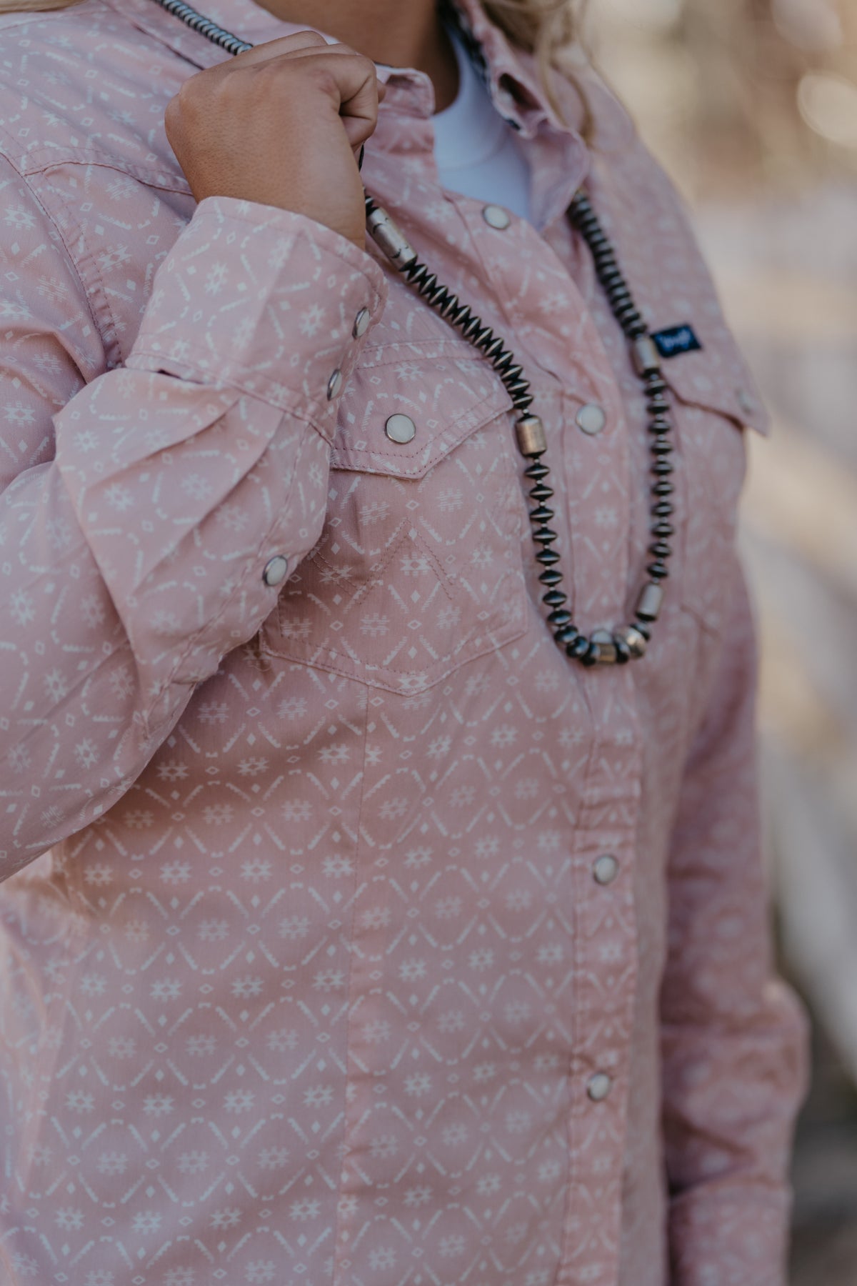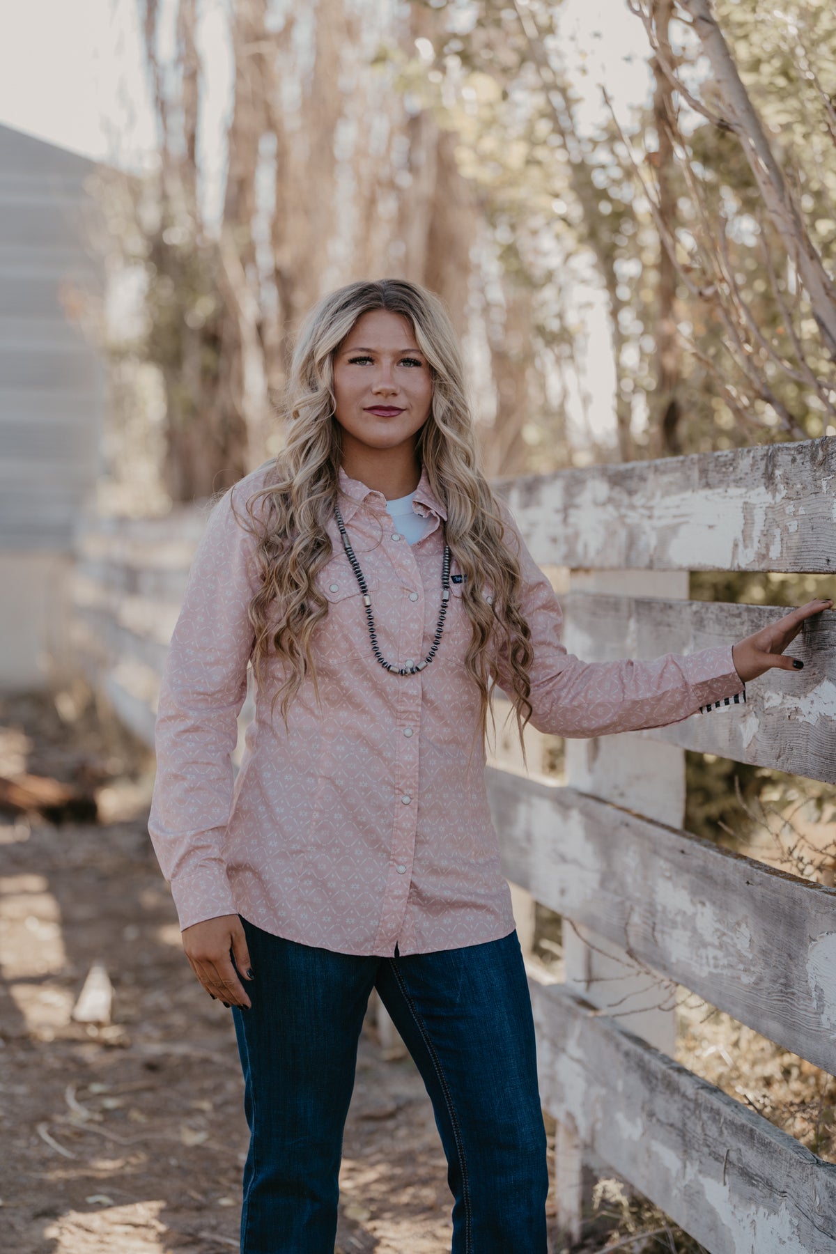 Pearl snaps never go out of style. Light pink in color and full snap front. Ladies cut.