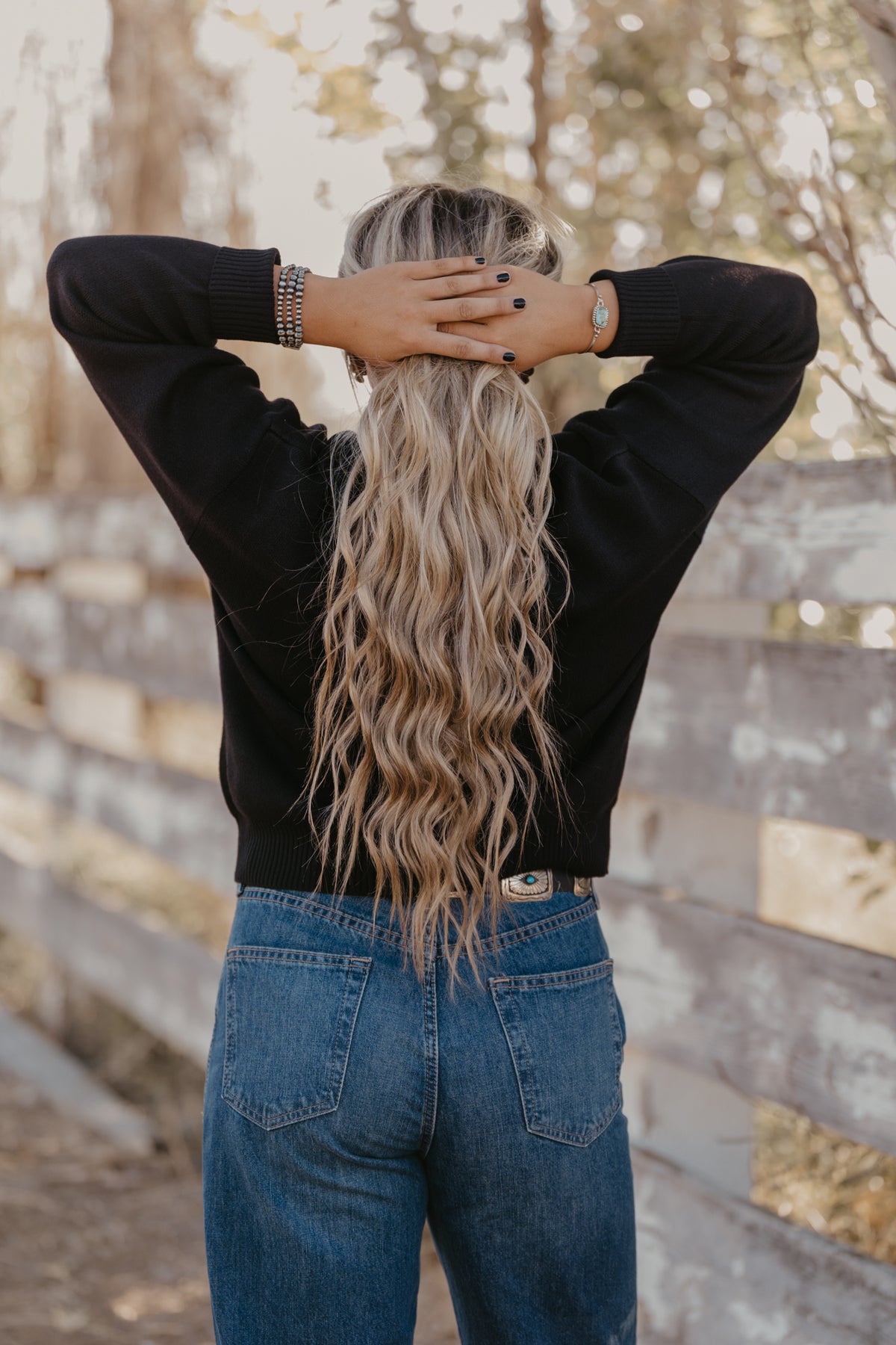 Where western charm meets coziness, you’ll find the horses running wild sweater. It comes with a unique jacquard design of horses running  across the front, delivering a pop of color and some cowgirl flair to help any outfit stand out. Knitted for extra softness, this easy pullover will become an instant favorite on cooler days.