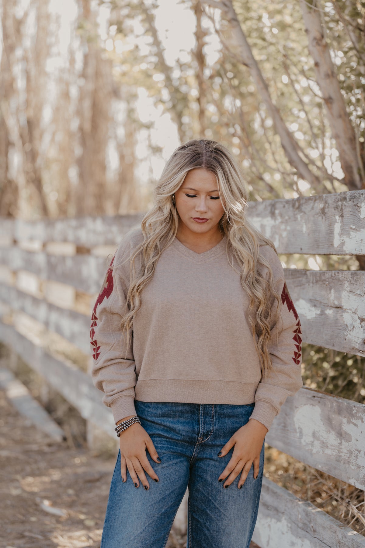 This soft, cozy sweatshirt can elevate even the most casual outfit. With a flattering V-neck and Southwestern accents on the sleeves, it makes an impact with very little effort.