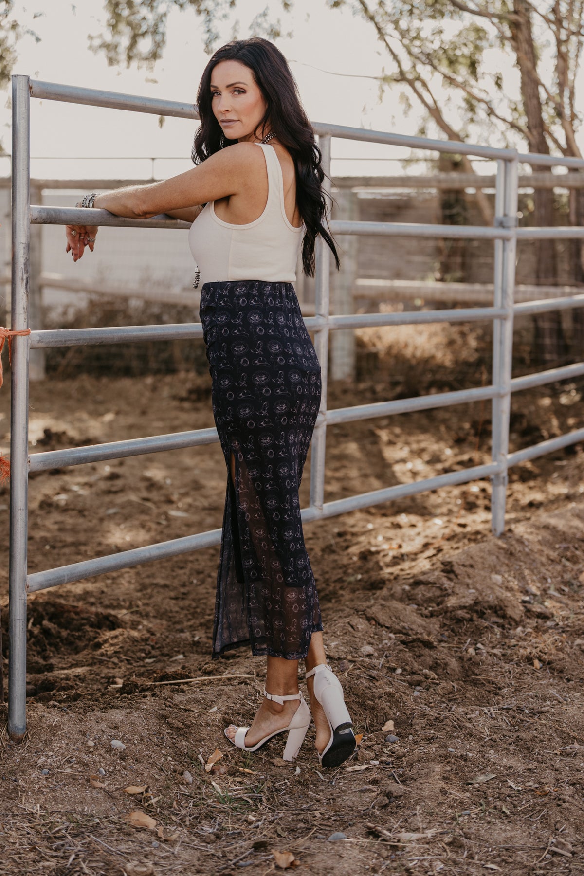 Hey Babes! Mesh midi skirt with the best stretch and fit. Wear it as is, belt it, either way she has great stretch and is fully lined.