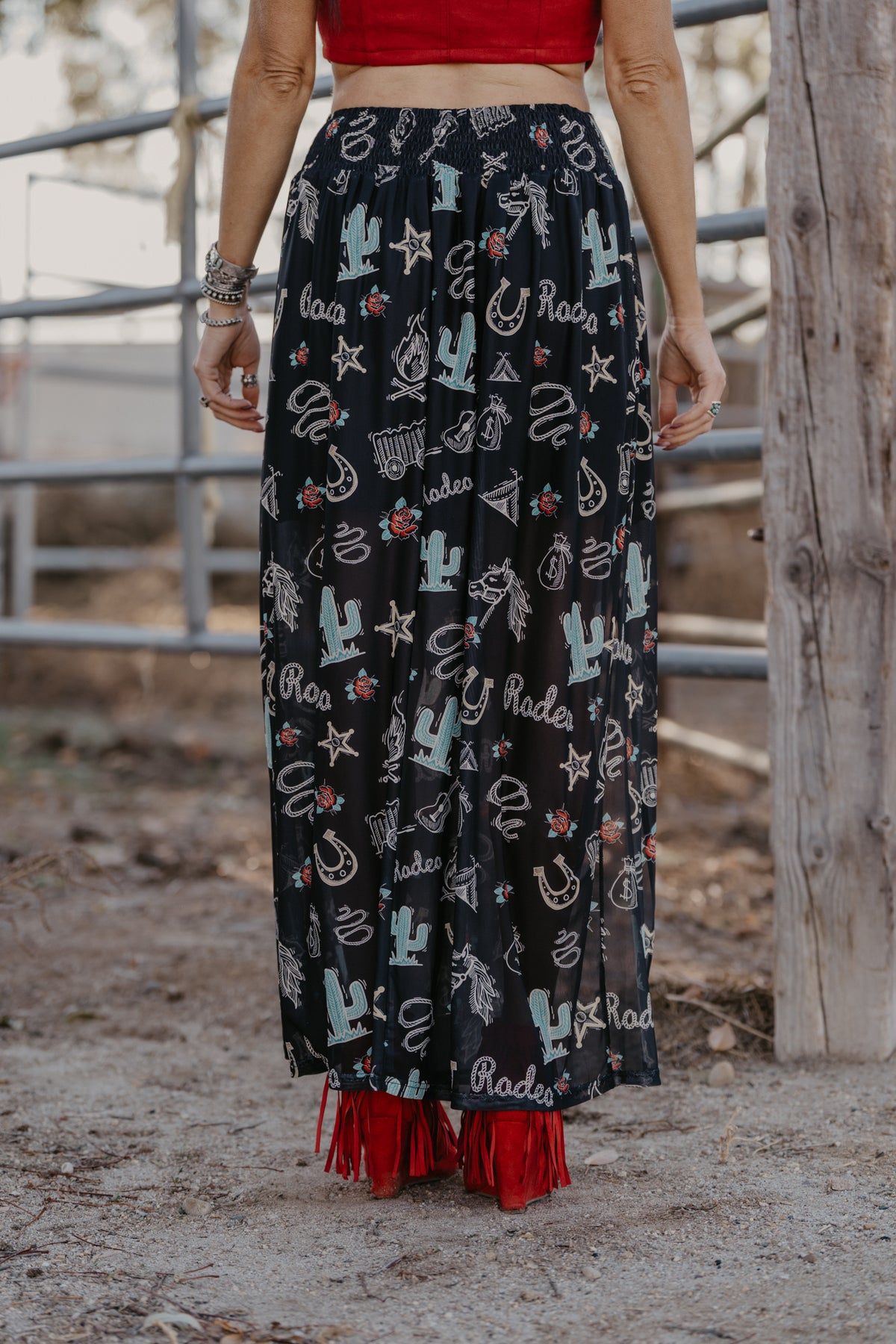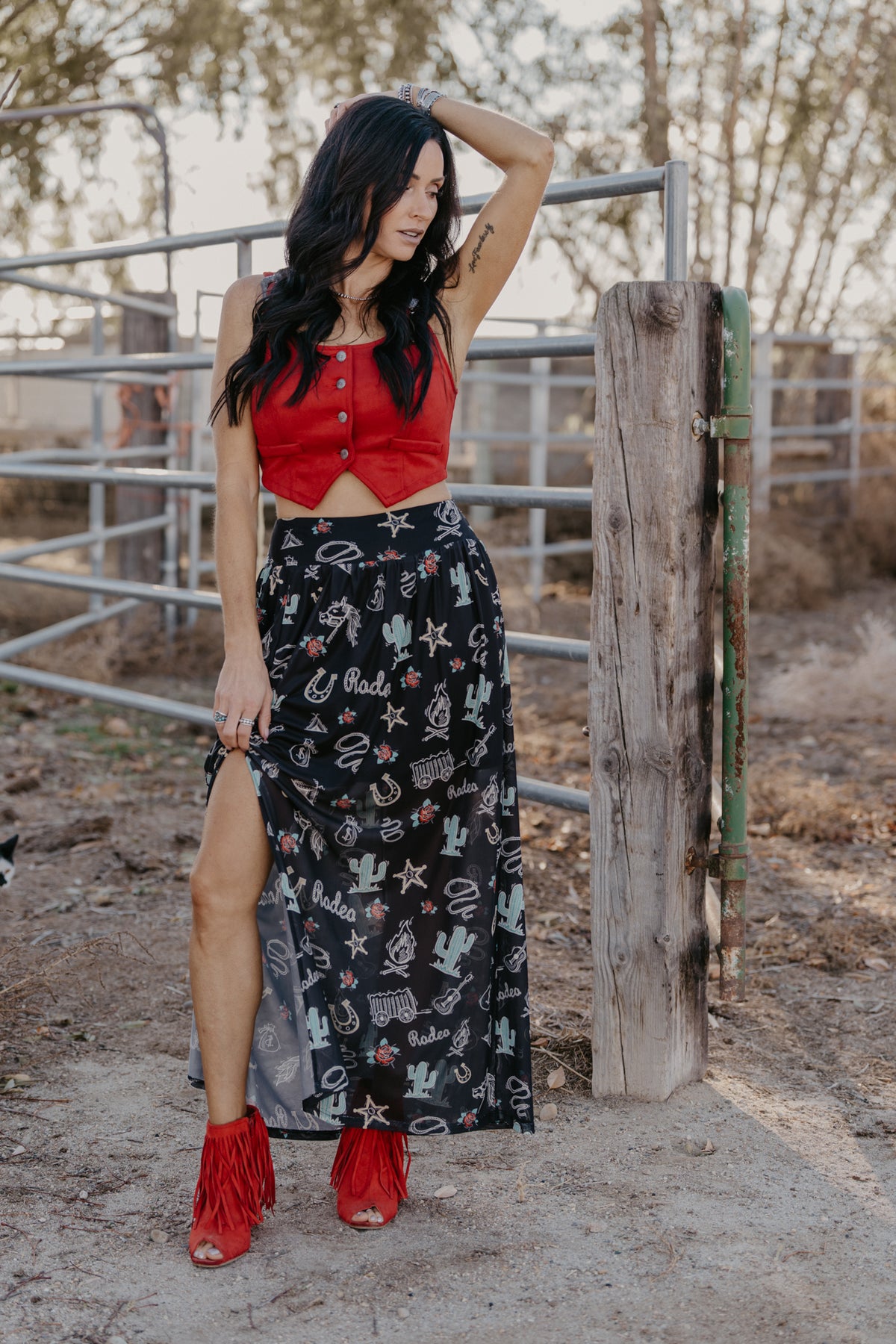 A skirt for a girl who is loving western designs and small pops of color. Reds, creams, yellows, and greens. Elastic waistband with lots of stretch.