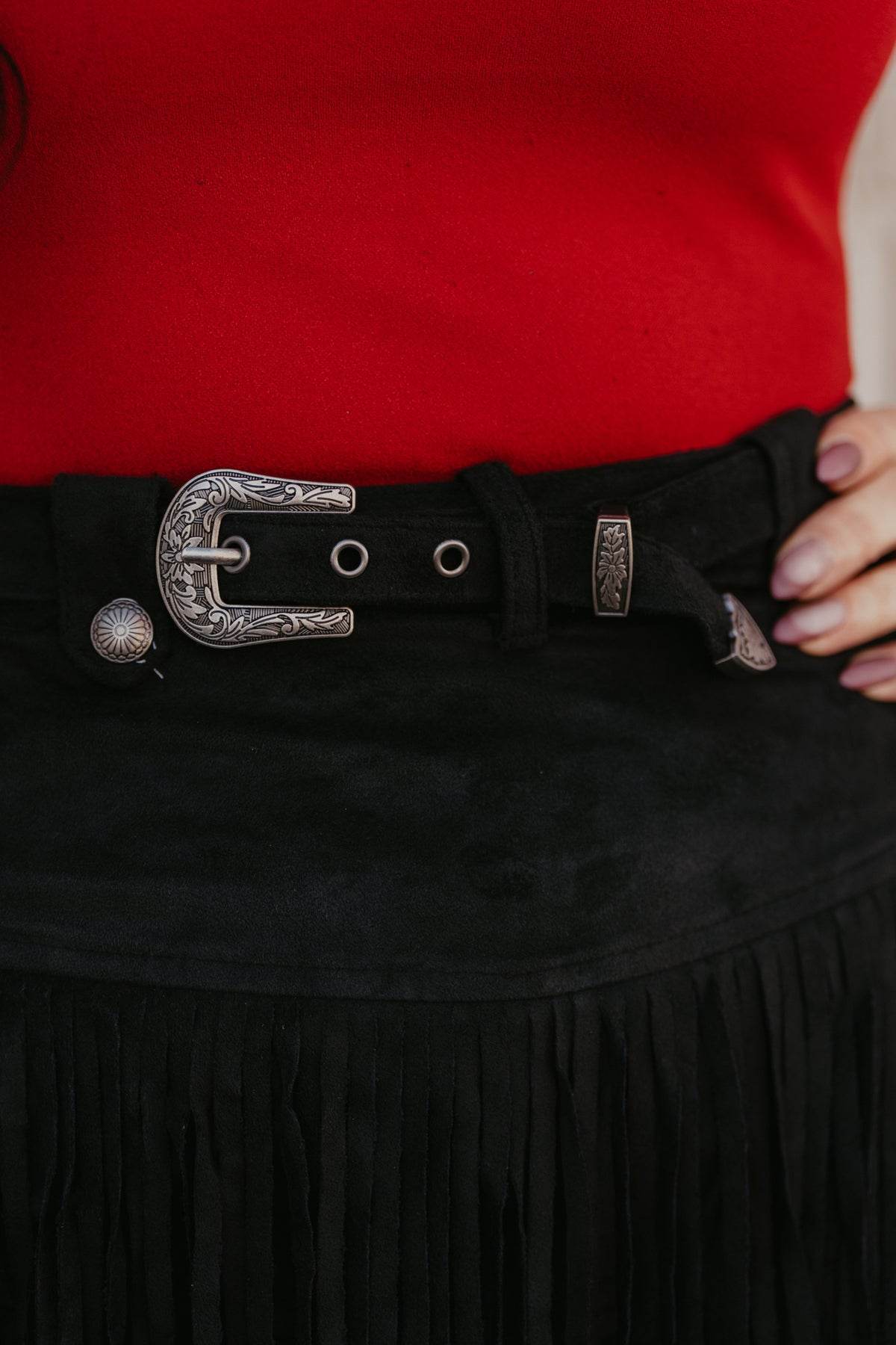 A basic and classic staple - every girl needs a black fringe skirt.Zipper side closure.