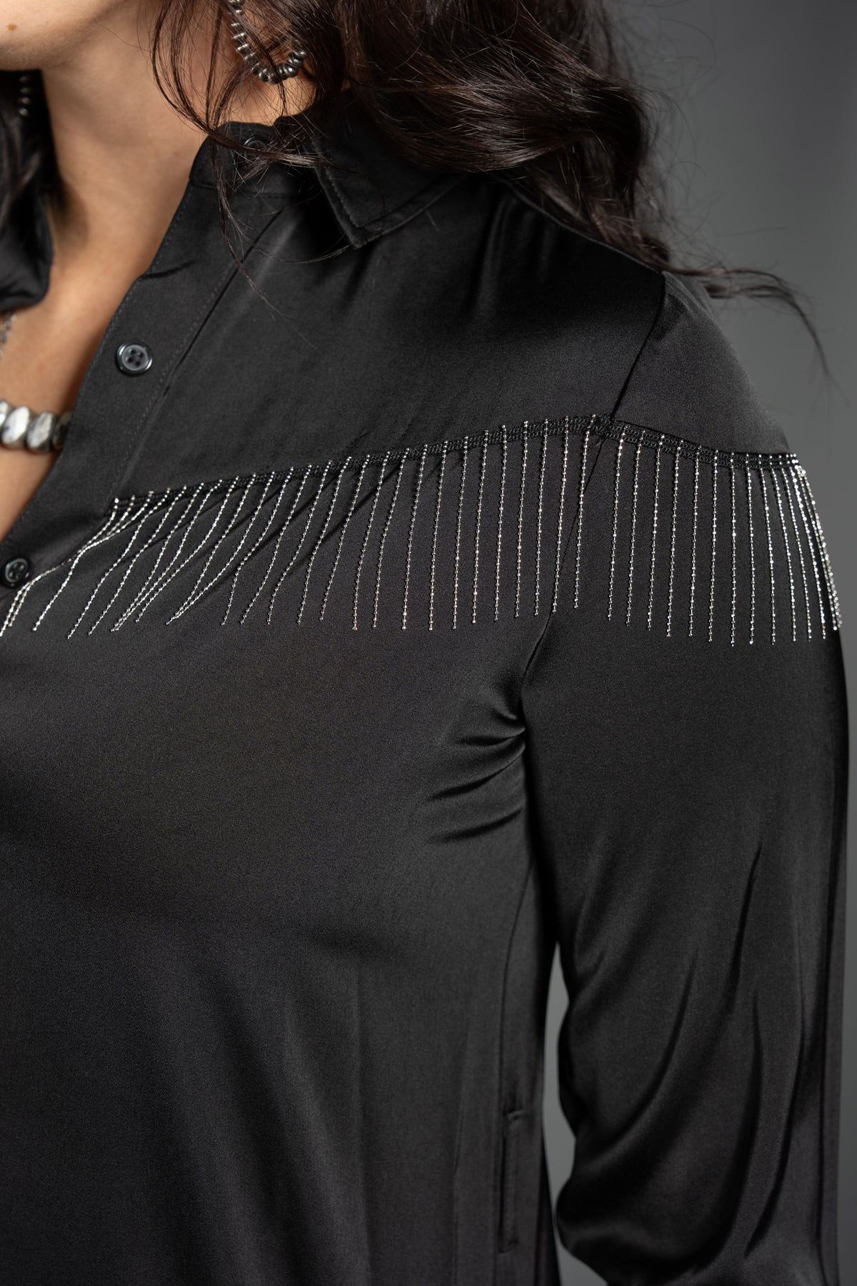 Tunic that can be worn open as a duster or closed as a dress. Full button front with chain fringe.