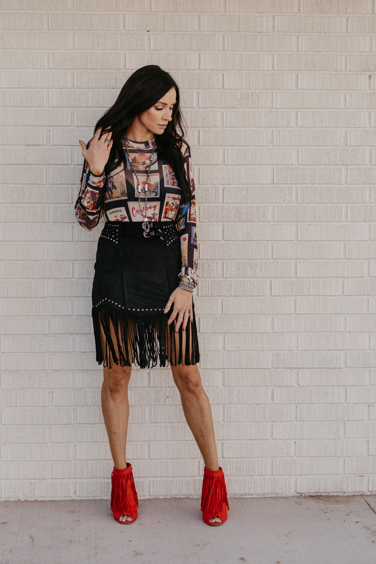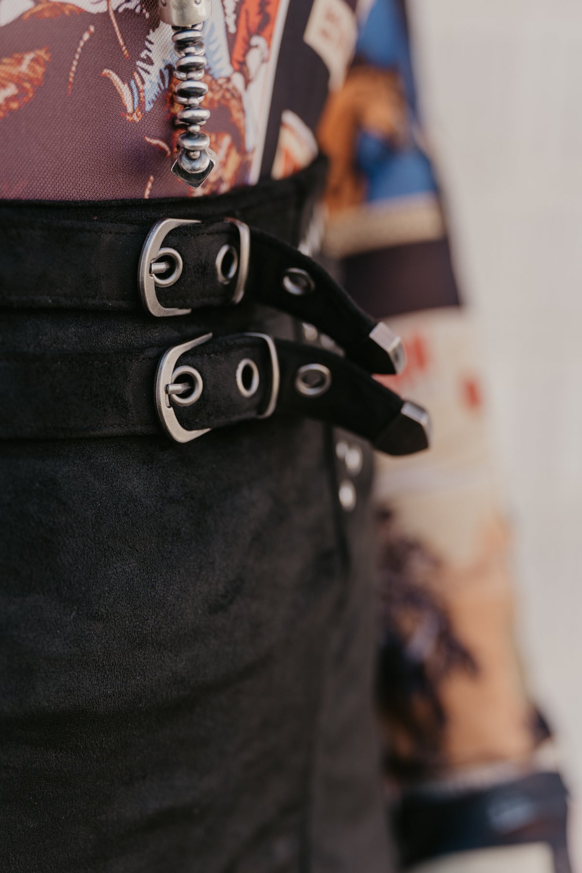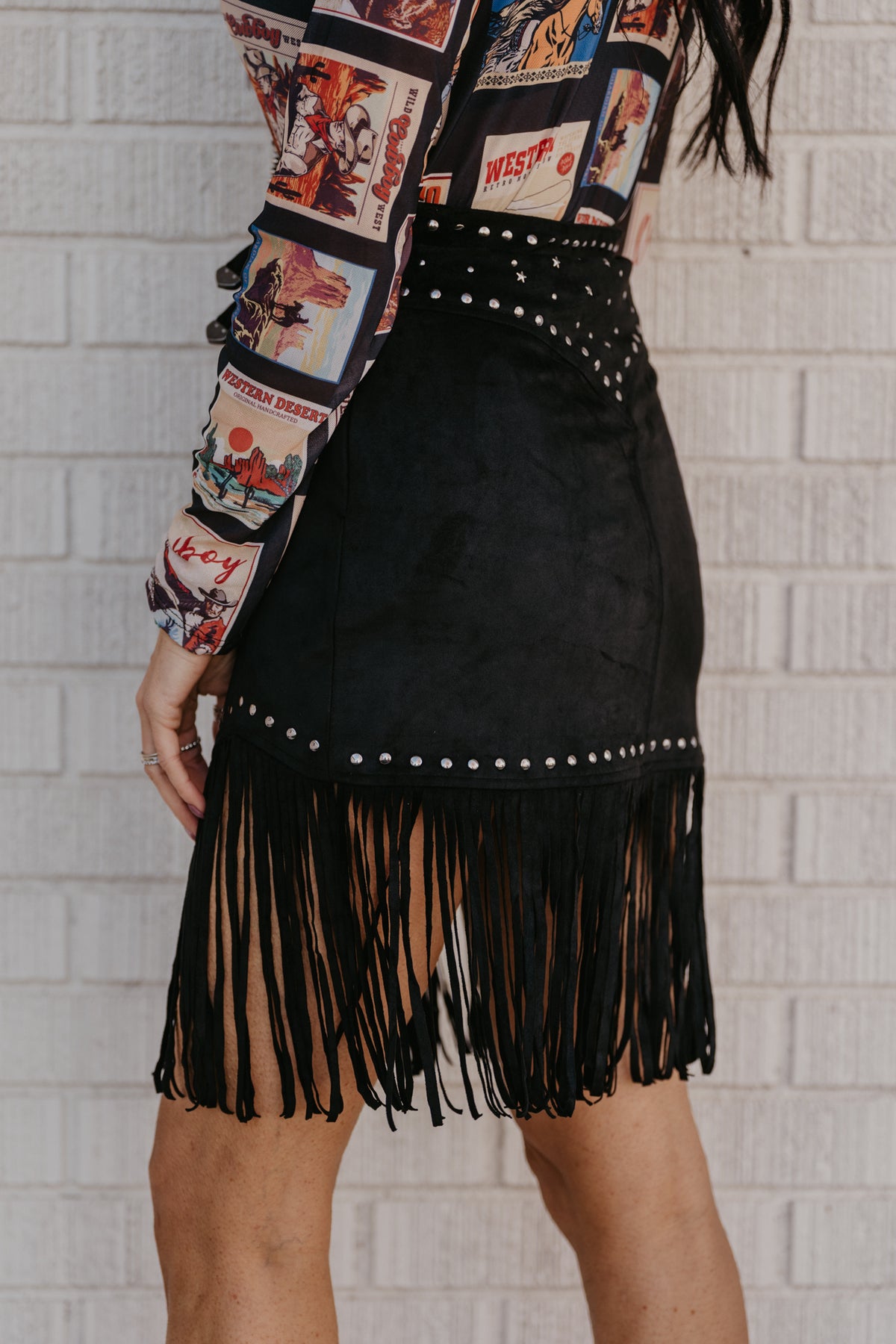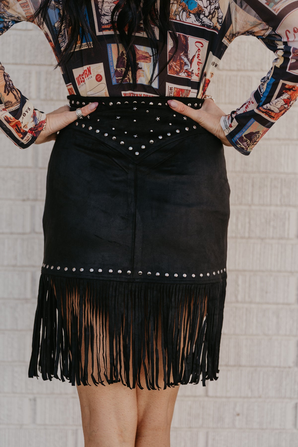 Fringe skirt with studs detail and double buckle belt. Soft and comfortable.