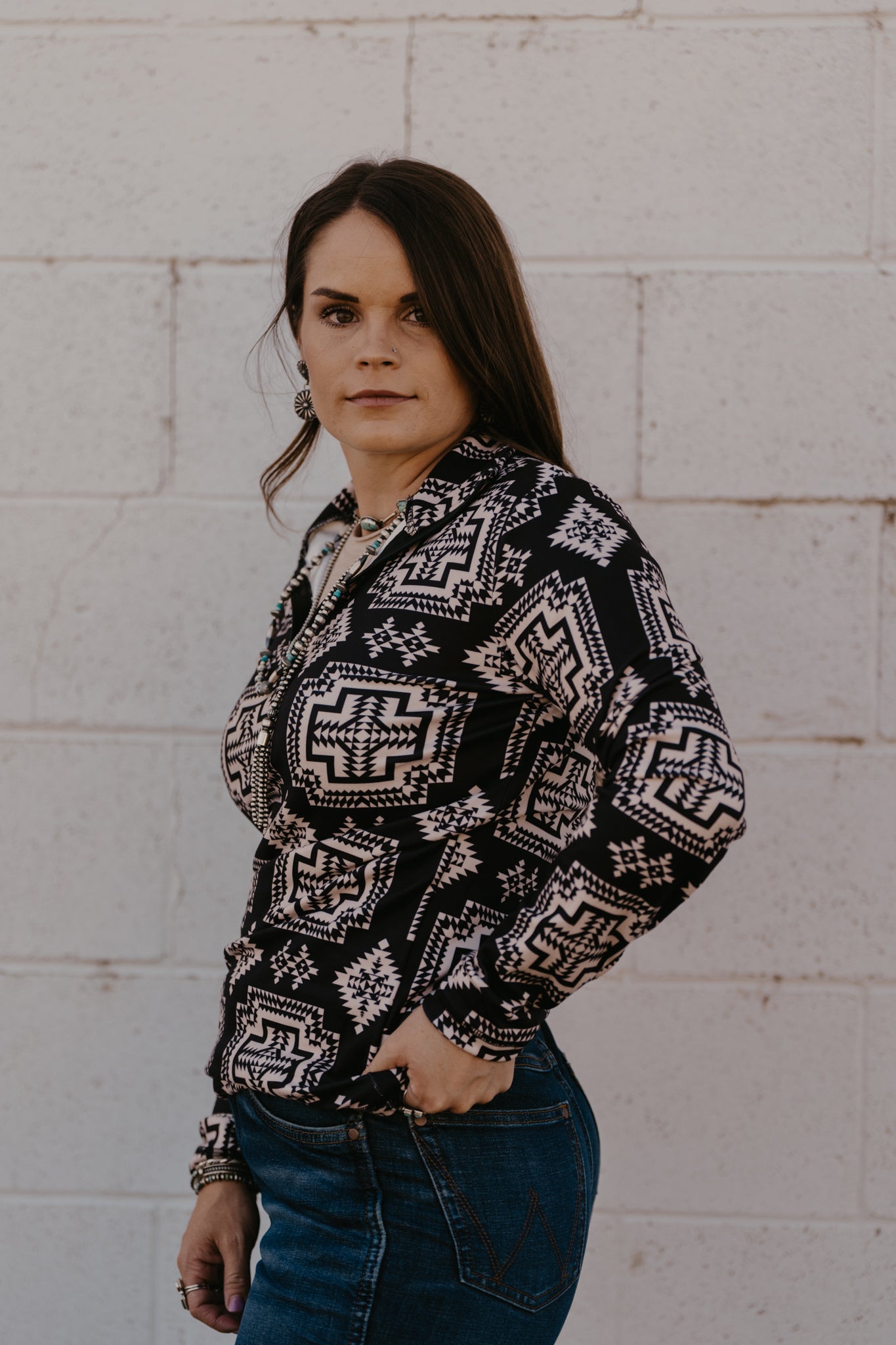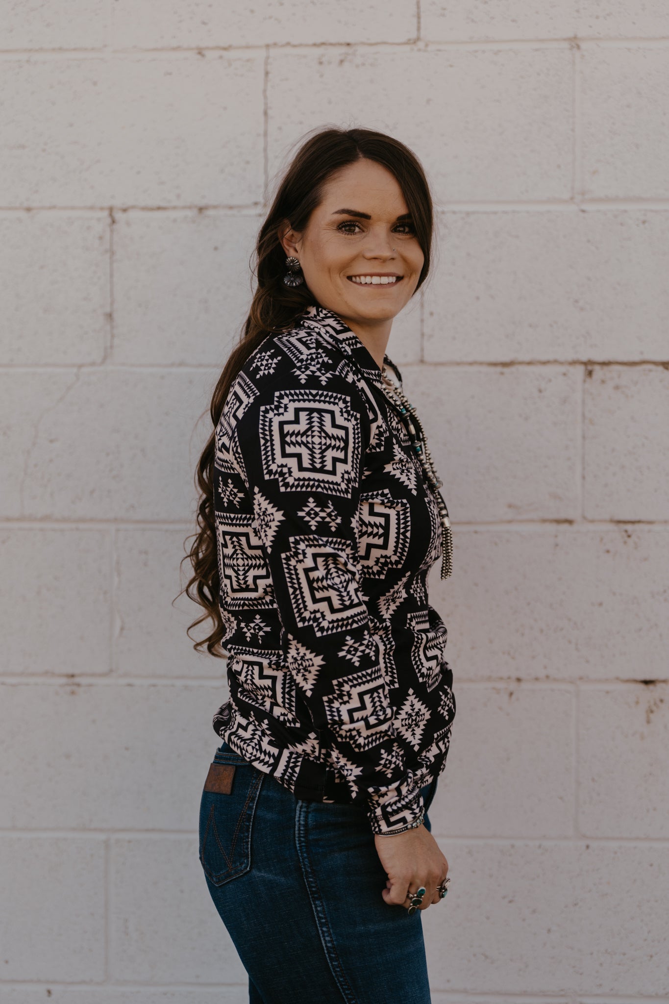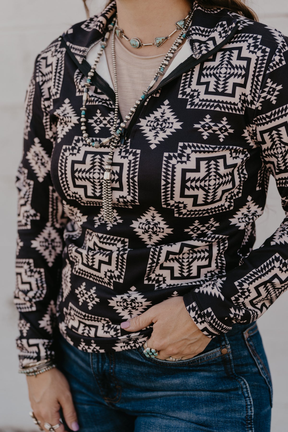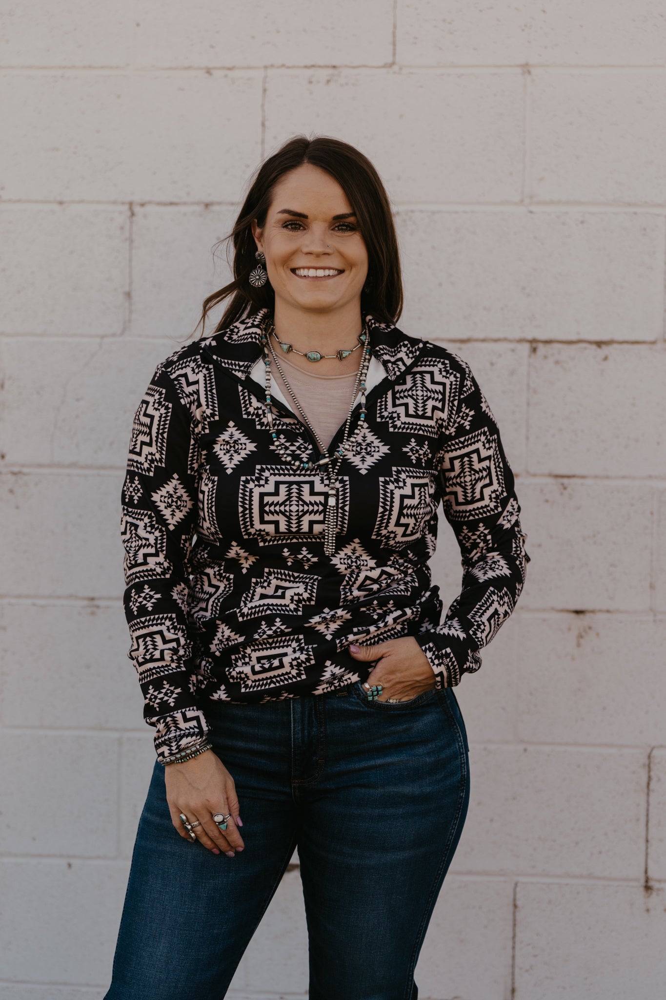 This was a fan favorite in Pendleton. Quarter zip style pullover with a nude/tan and black aztec pattern. Has great stretch and runs true to size.
