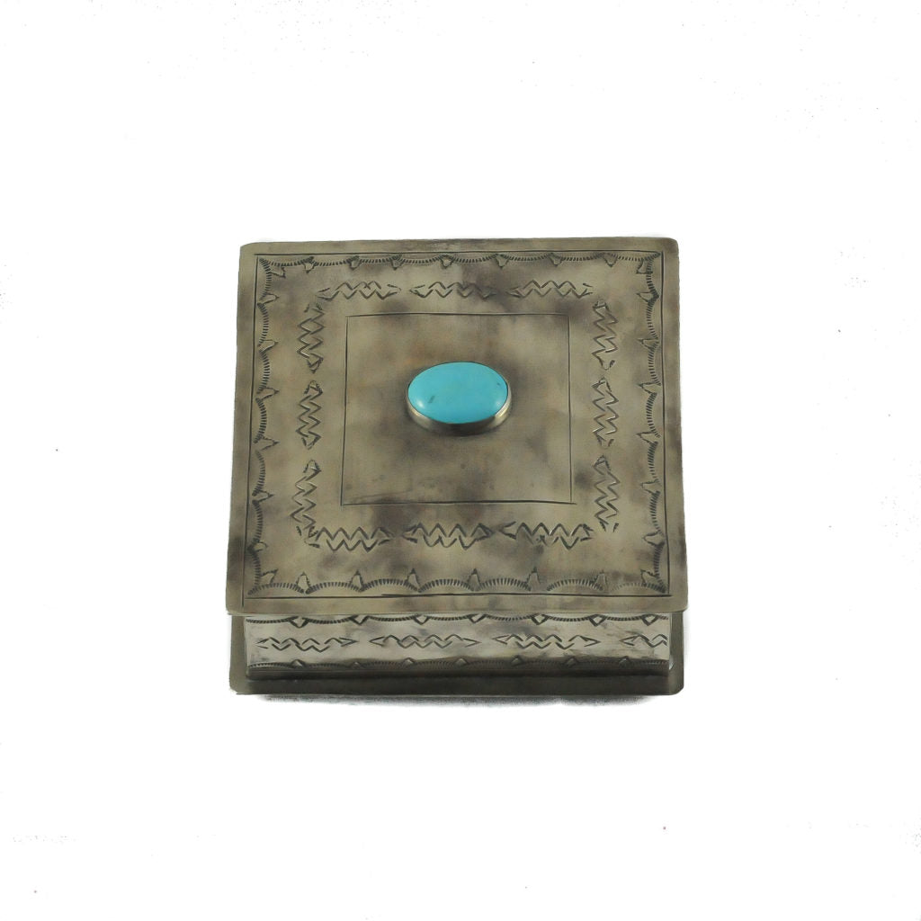 This square stamped box is the perfect “catch all” for your treasures. It’s lined with velvet and adorned with a natural turquoise stone. It would make a great gift and would stand out in any room in the house. Embellished with rustic design and a natural turquoise stone. Add in your favorite jewelry for safe keeping.