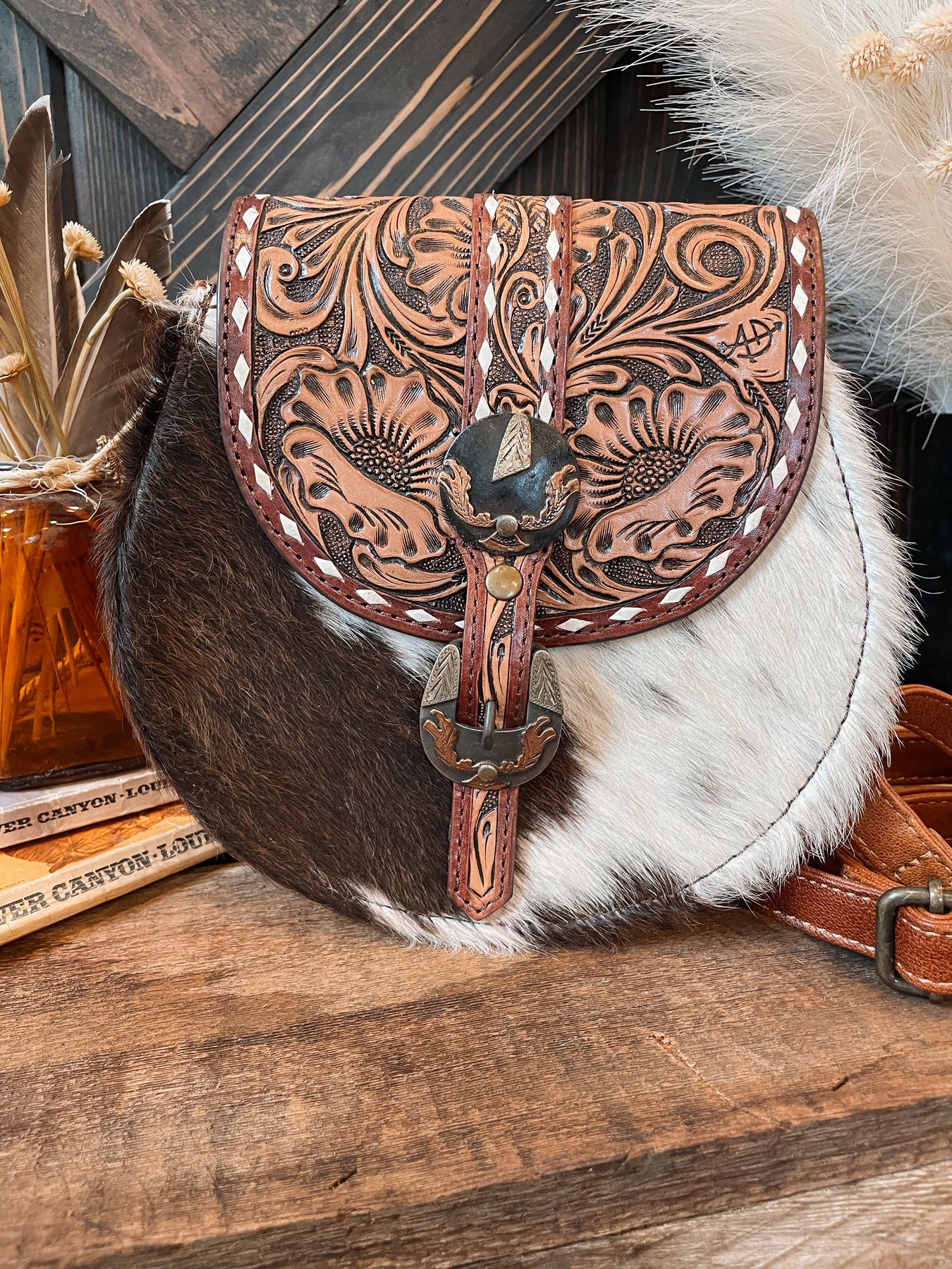 Round style cowhide purse with tooled leather and concho fold over magnetic top closure. Fully lined, inner side slide pocket, and side zipper pocket.