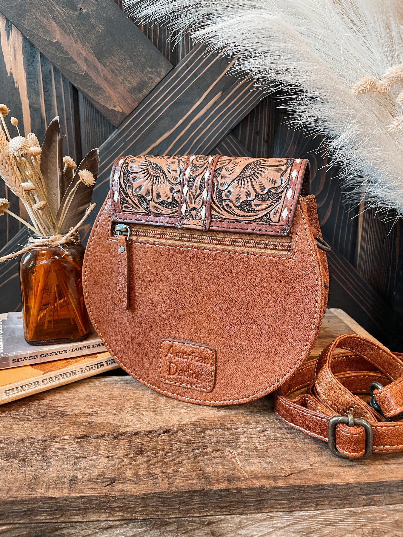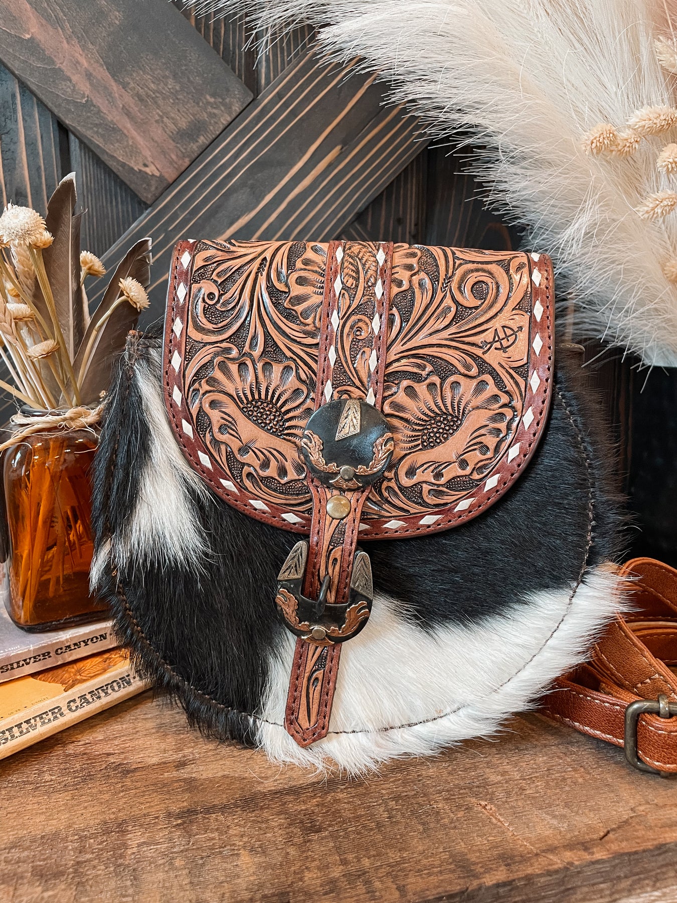 Round style cowhide purse with tooled leather and concho fold over magnetic top closure. Fully lined, inner side slide pocket, and side zipper pocket.