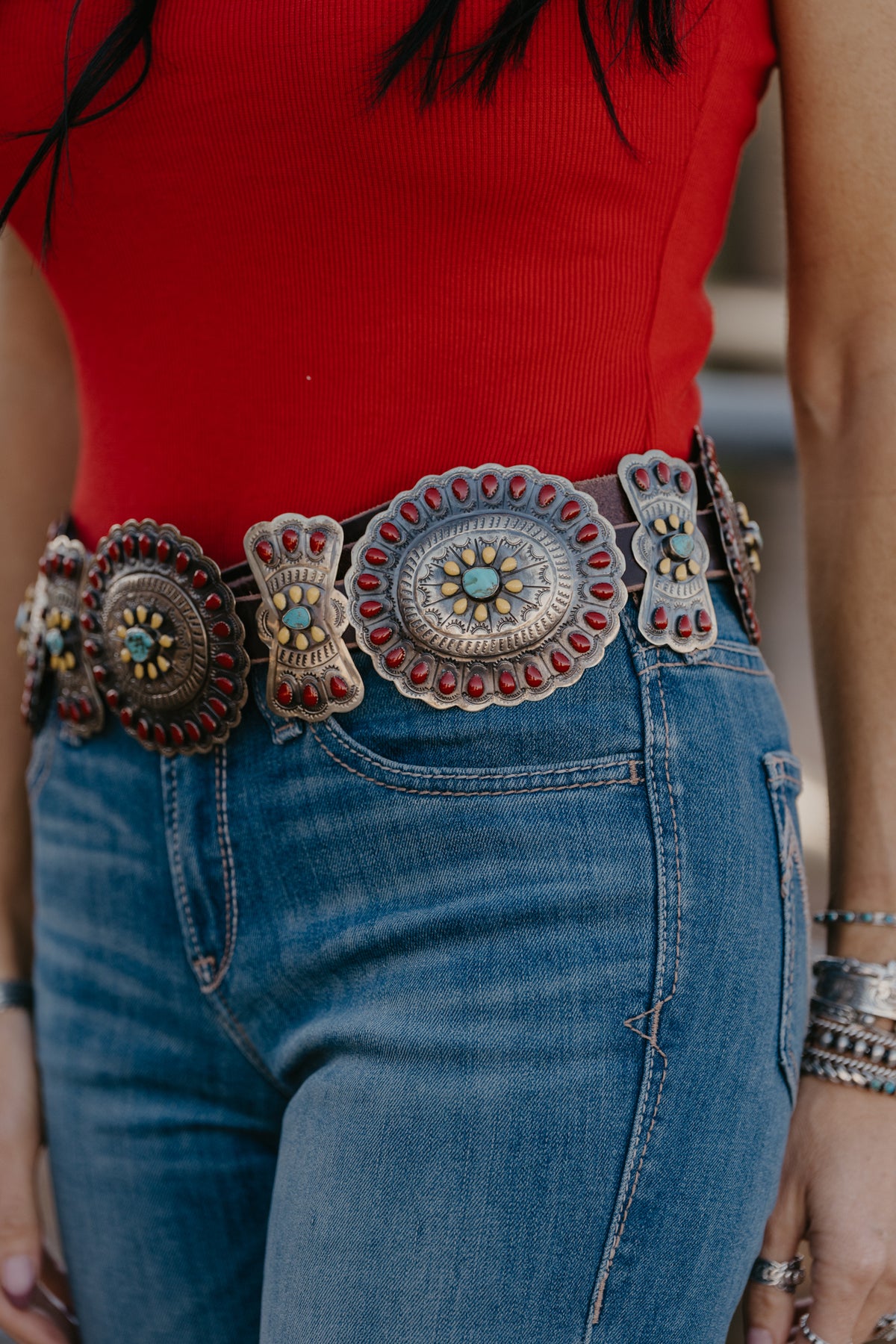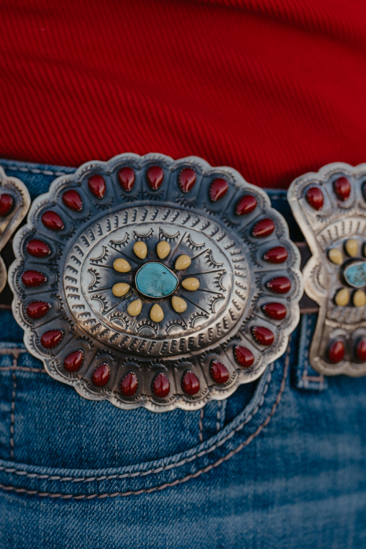 A gorgeous hand crafted belt by Barbosa Creations. Engraved oval with bows with center and border stones. Belt can be adjusted easily to fit a variety of sizes!