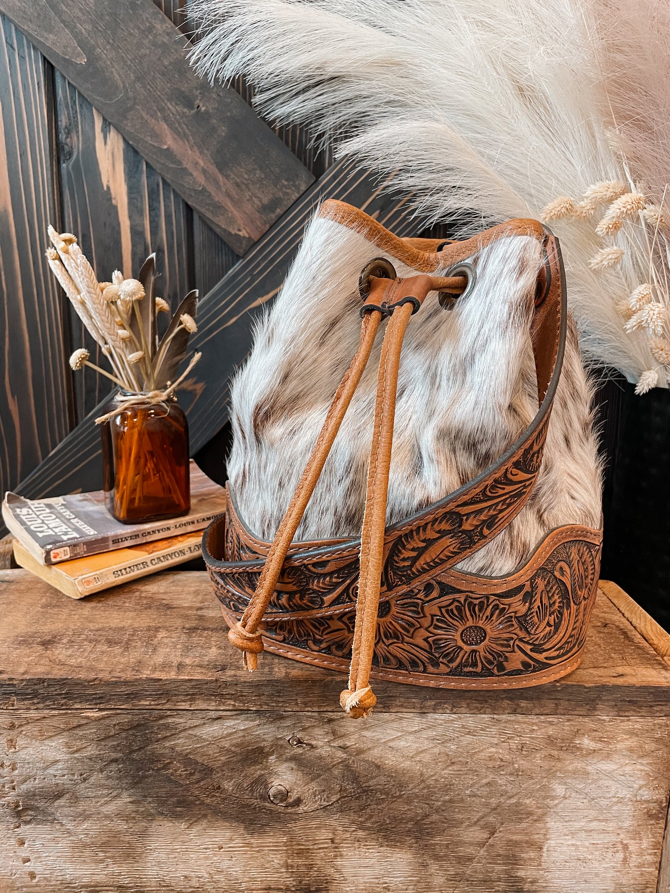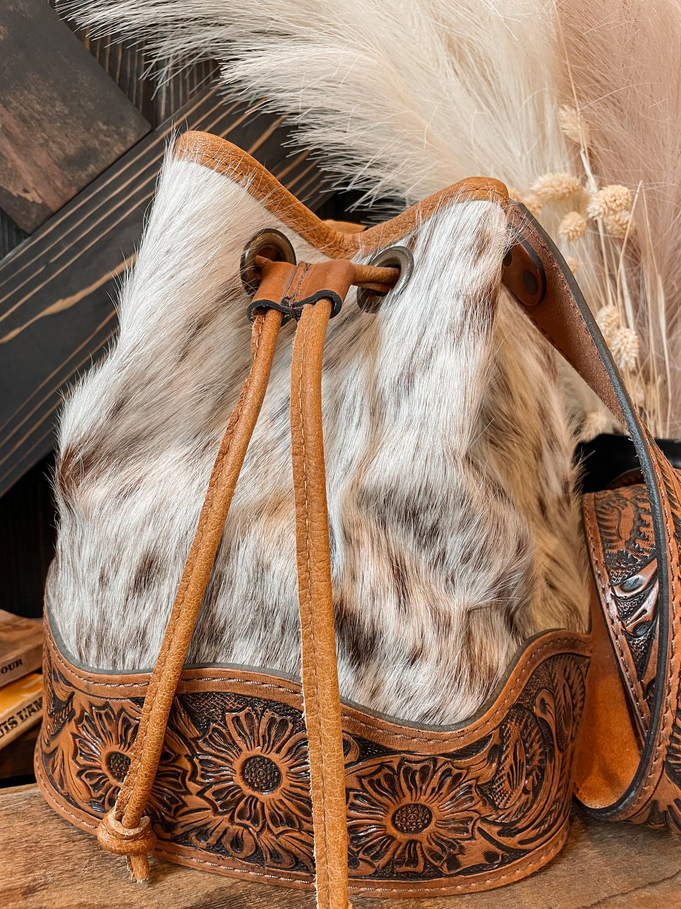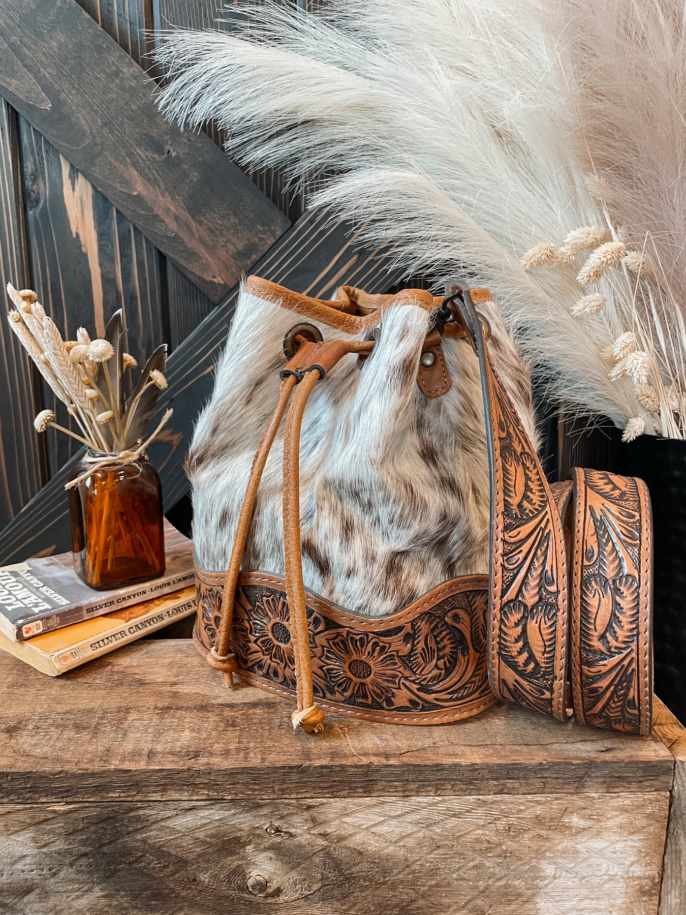 Hello beautiful. A gorgeous cowhide drawstring style purse. Top has drawstring closure, fully lined, inner side pocket, and inner zipper privacy pocket. Bottom has a tooled leather patch that wraps around with buck stitch edging. Comes with tooled leather crossbody strap.