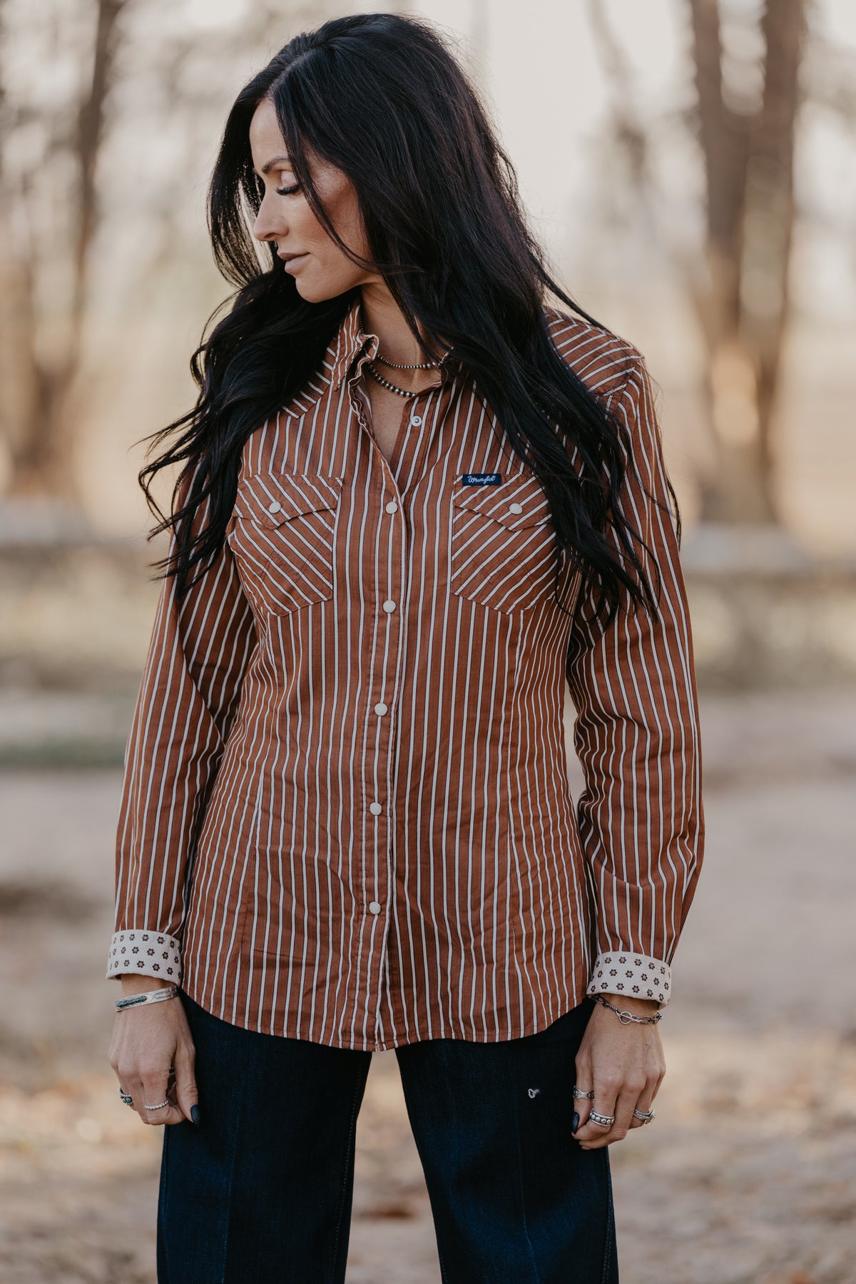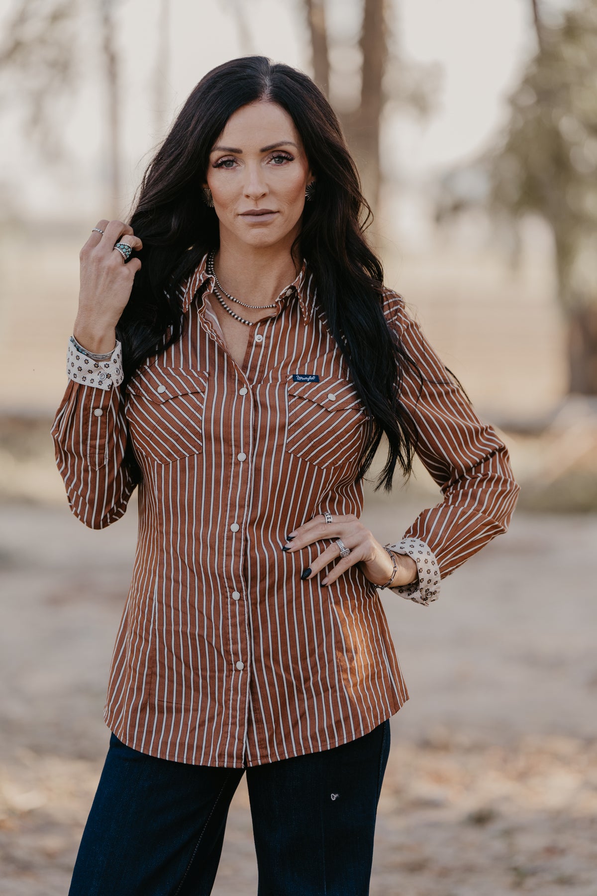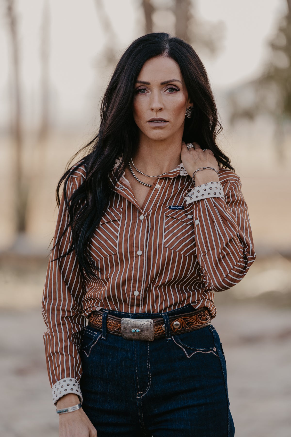 A cowgirl can never have too many collared shirts for competition and daily life. Our Ridley Pearl Snap Top is crafted a lightweight cotton and recycled materials blend that will keep you comfortable in everything you do. It comes with pointed yokes, pearl snaps, two chest pockets with the signature "W" stitching, and a contrast print at the cuffs.