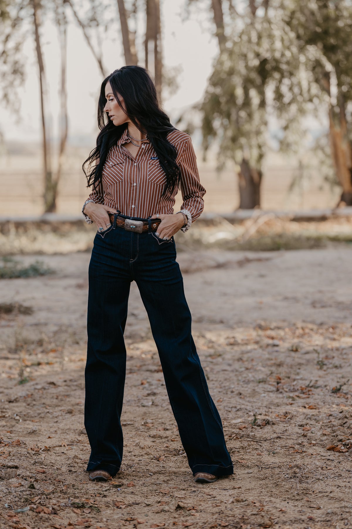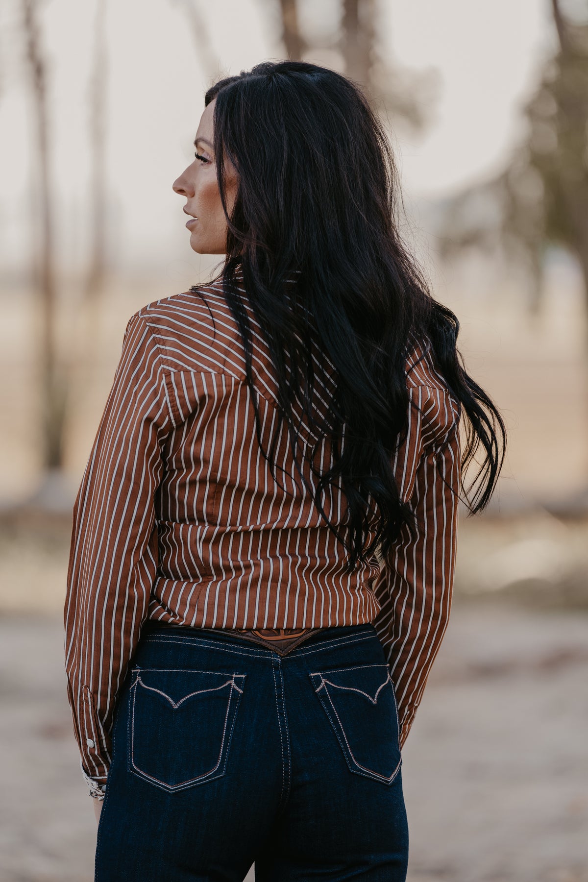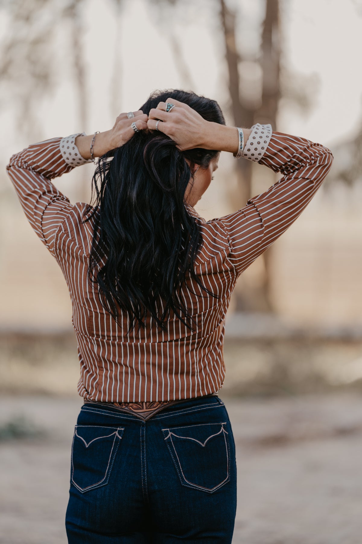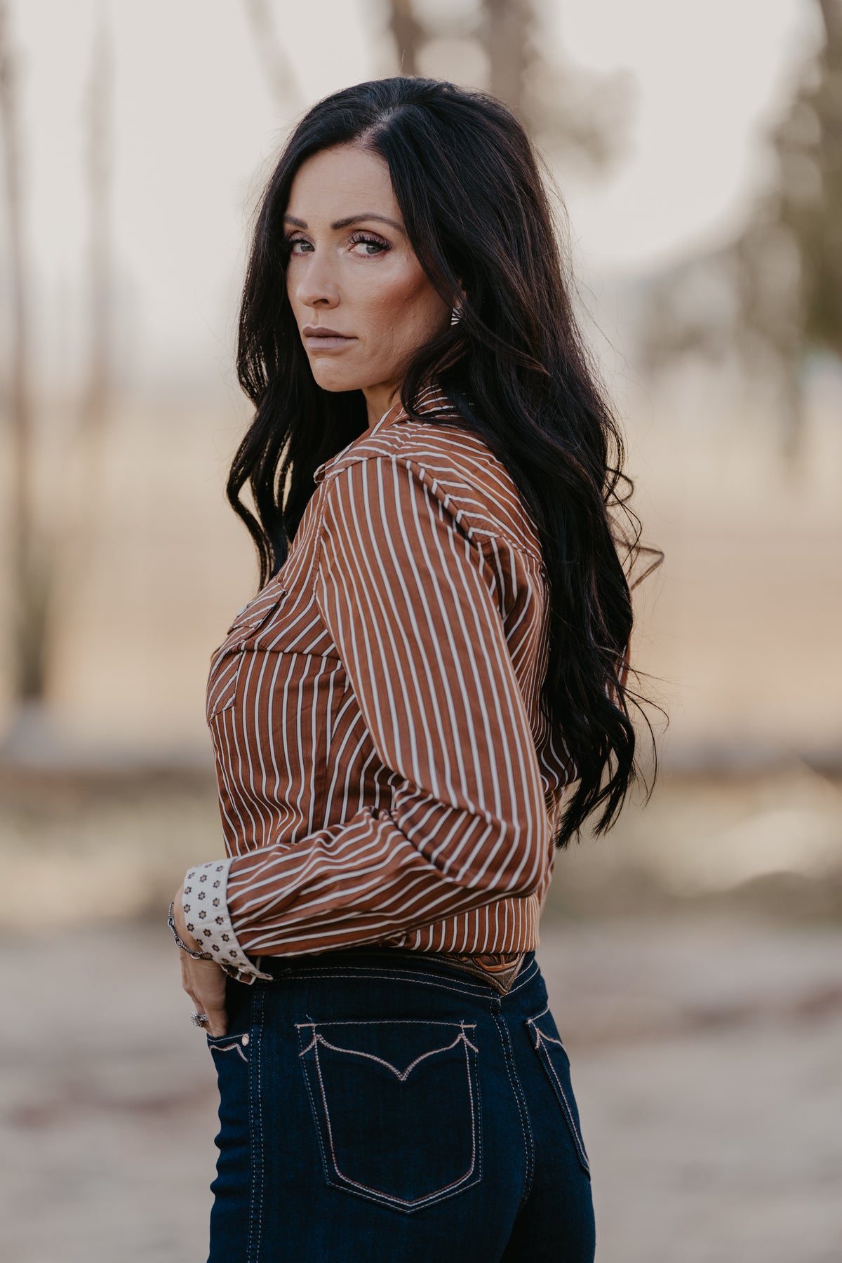 A cowgirl can never have too many collared shirts for competition and daily life. Our Ridley Pearl Snap Top is crafted a lightweight cotton and recycled materials blend that will keep you comfortable in everything you do. It comes with pointed yokes, pearl snaps, two chest pockets with the signature "W" stitching, and a contrast print at the cuffs.