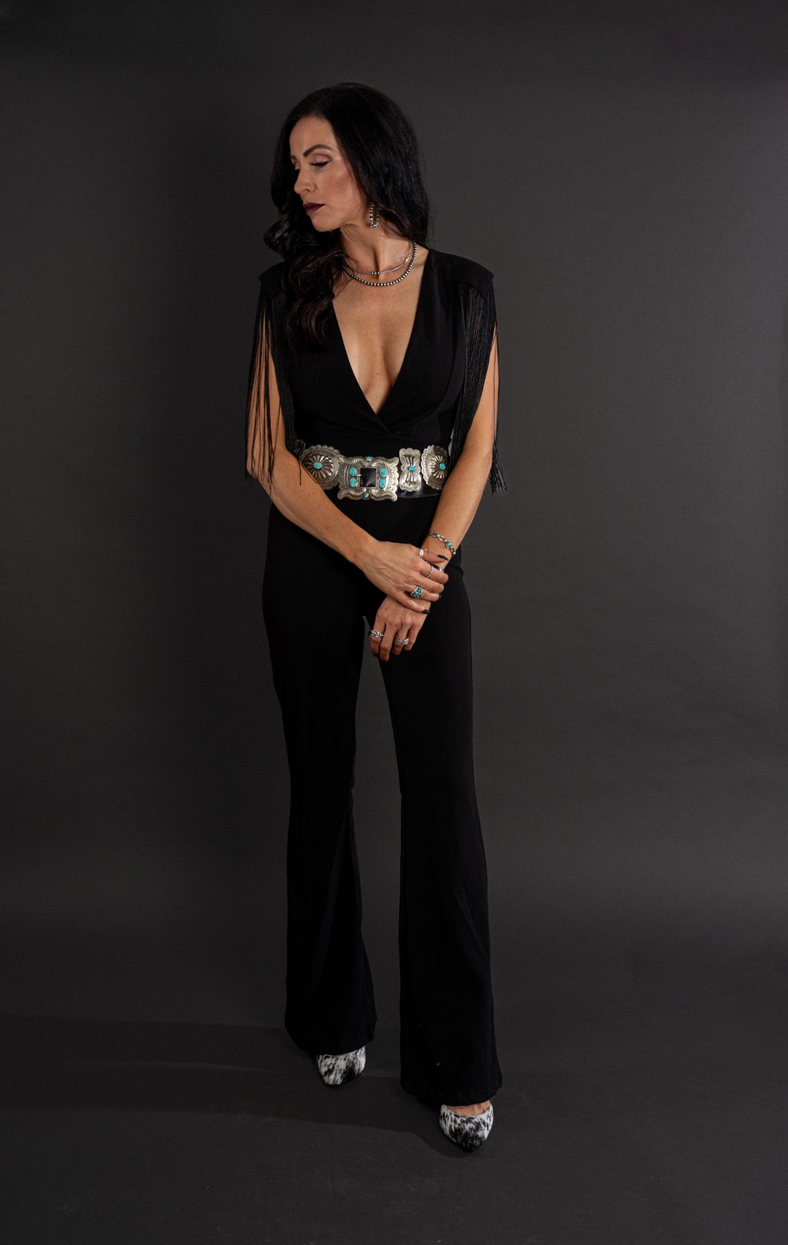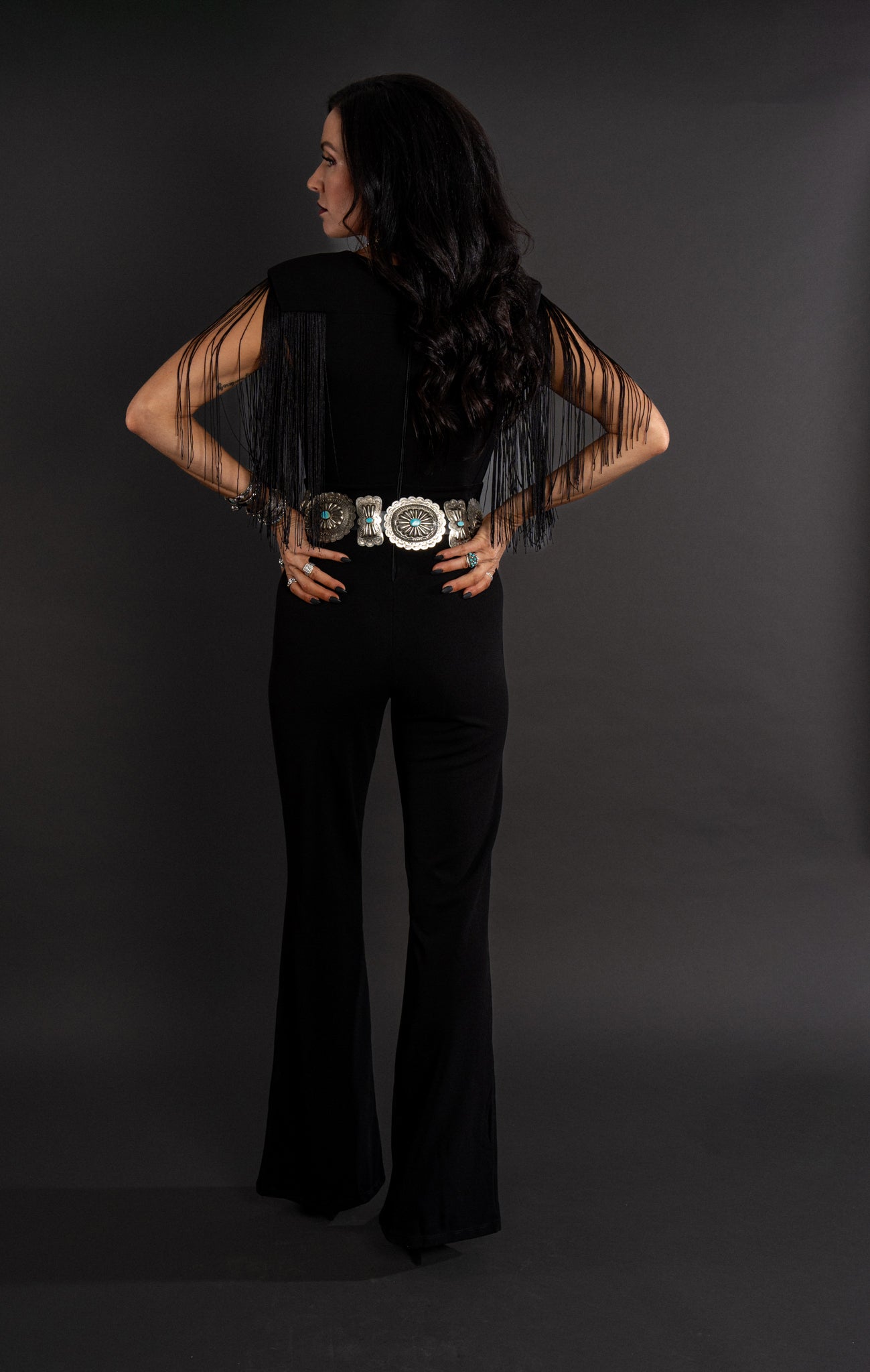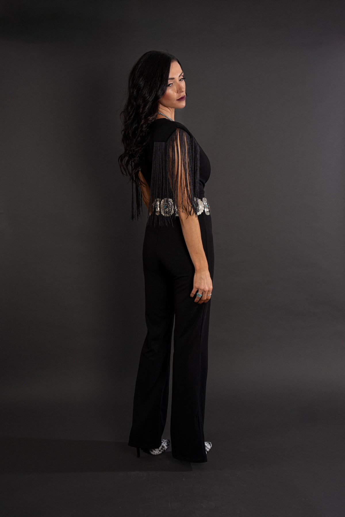 Make a statement in this jumpsuit. Deep plunge front with fringe shoulder detail. Its a knockout! Zipper back closure and has stretch.