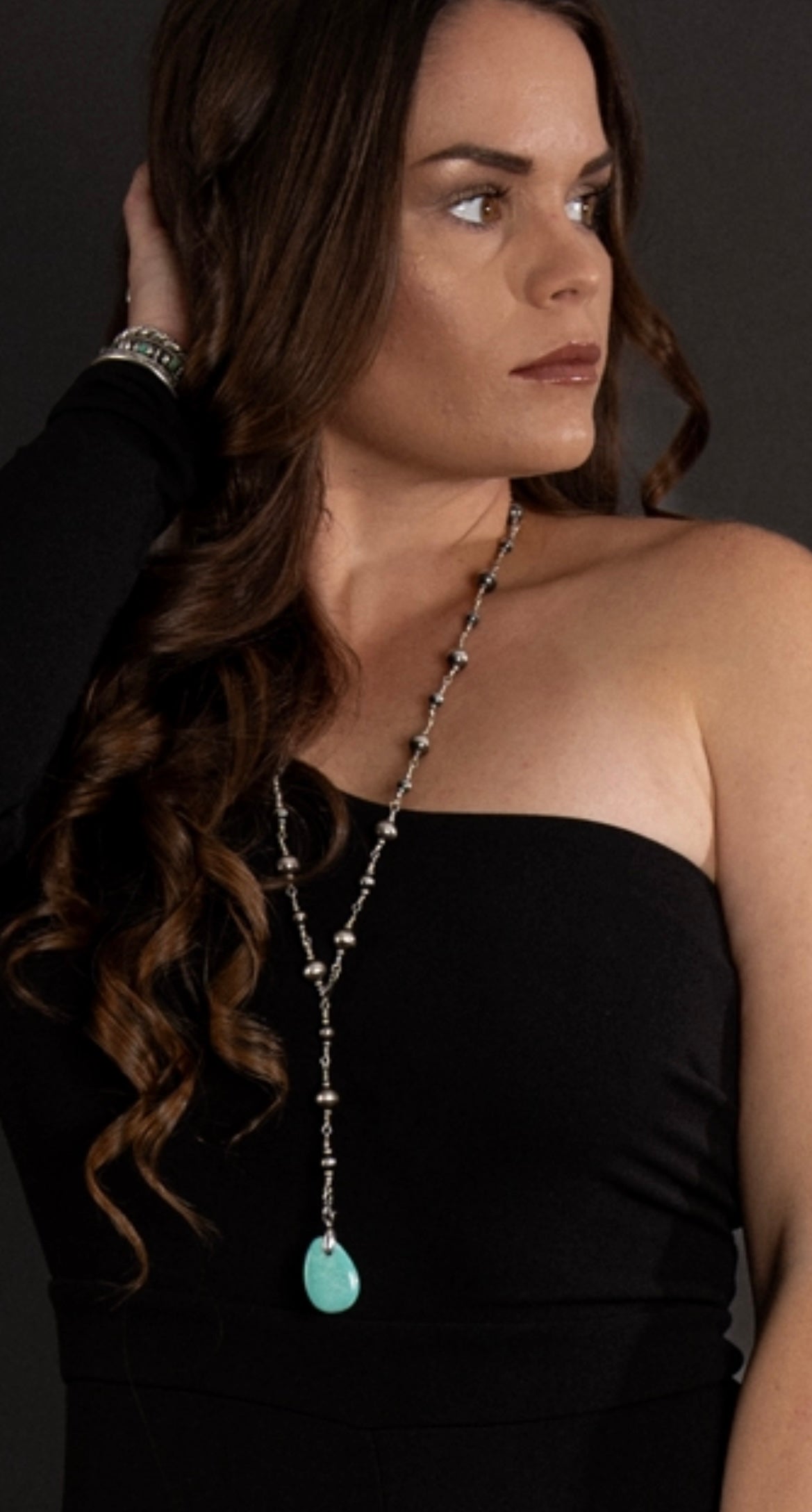 This is a multi sized chain Navajo pearl necklace that can be adjusted and worn lariat style or necklace style. Pendant can also clip off and be moved up, down, or removed.