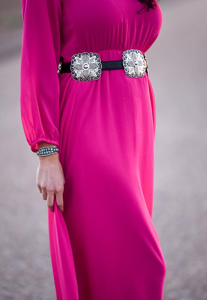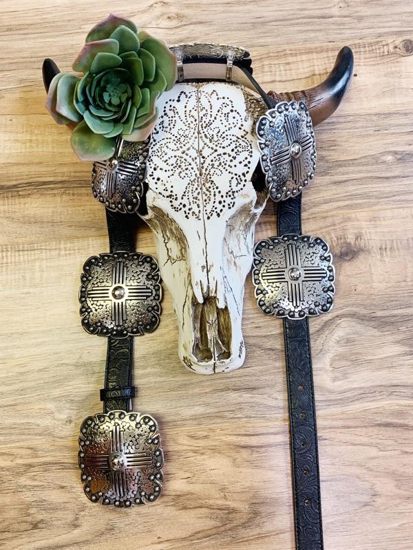 100% genuine leather belt with slide conchos. Zia pattern on the concho. Conchos measure 3.25" x 3.25"