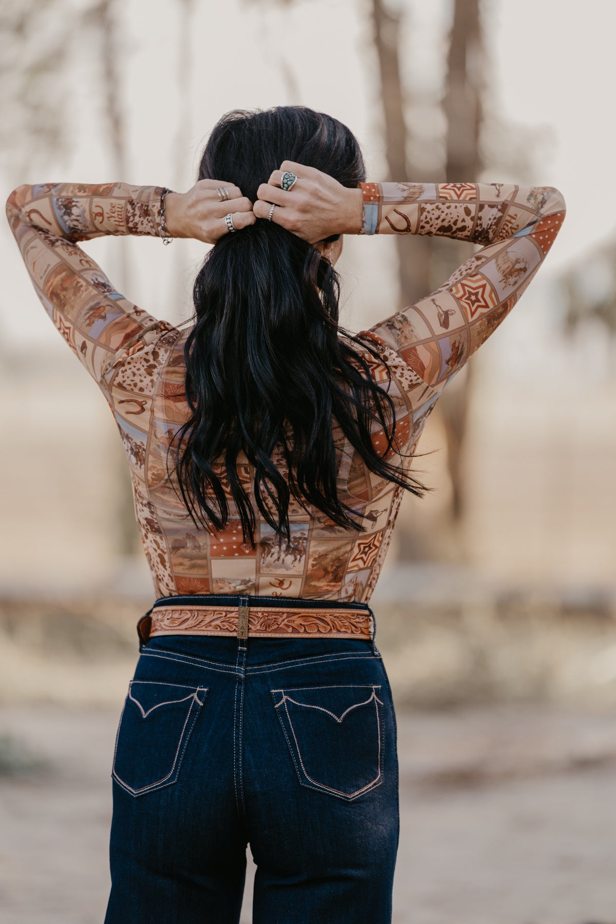 Literally obsessed with this style. Mesh printed top (semi-see thru) with a fun western pattern. Has good stretch and runs true to size.