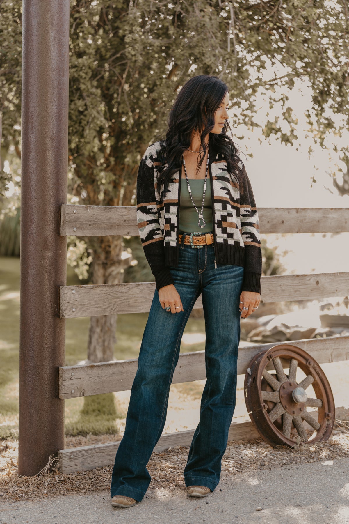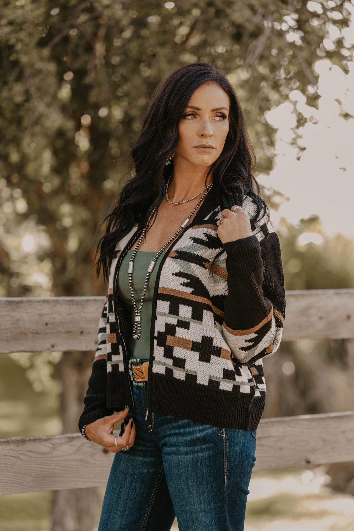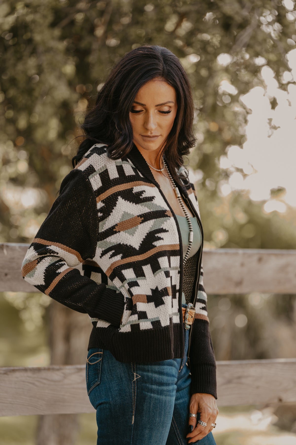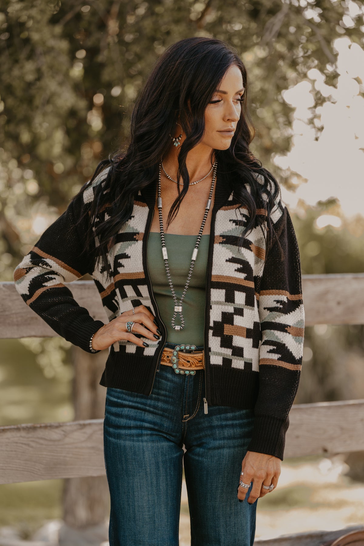 Cozy up the cowgirl way this season with our Women’s Southwestern Full Zip Cardigan. This lightweight sweater is crafted for comfort and softness, complete with ribbed trim at the hem and cuffs and a flat shawl collar design with a fit similar to a bomber jacket. It’s finished with a colorful geometric print throughout and a full-zip closure for easy layering on cooler days.