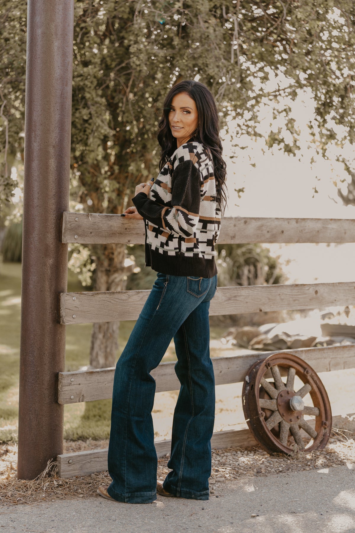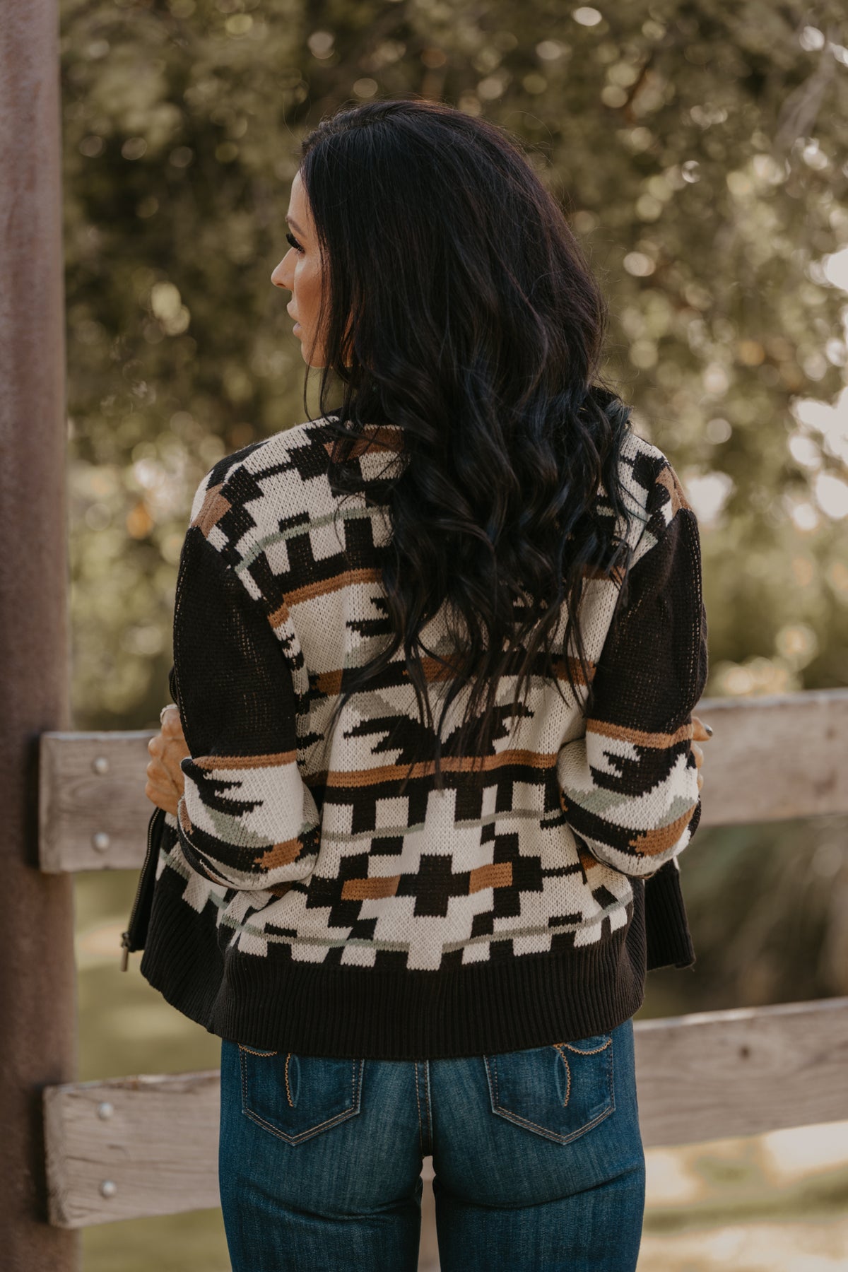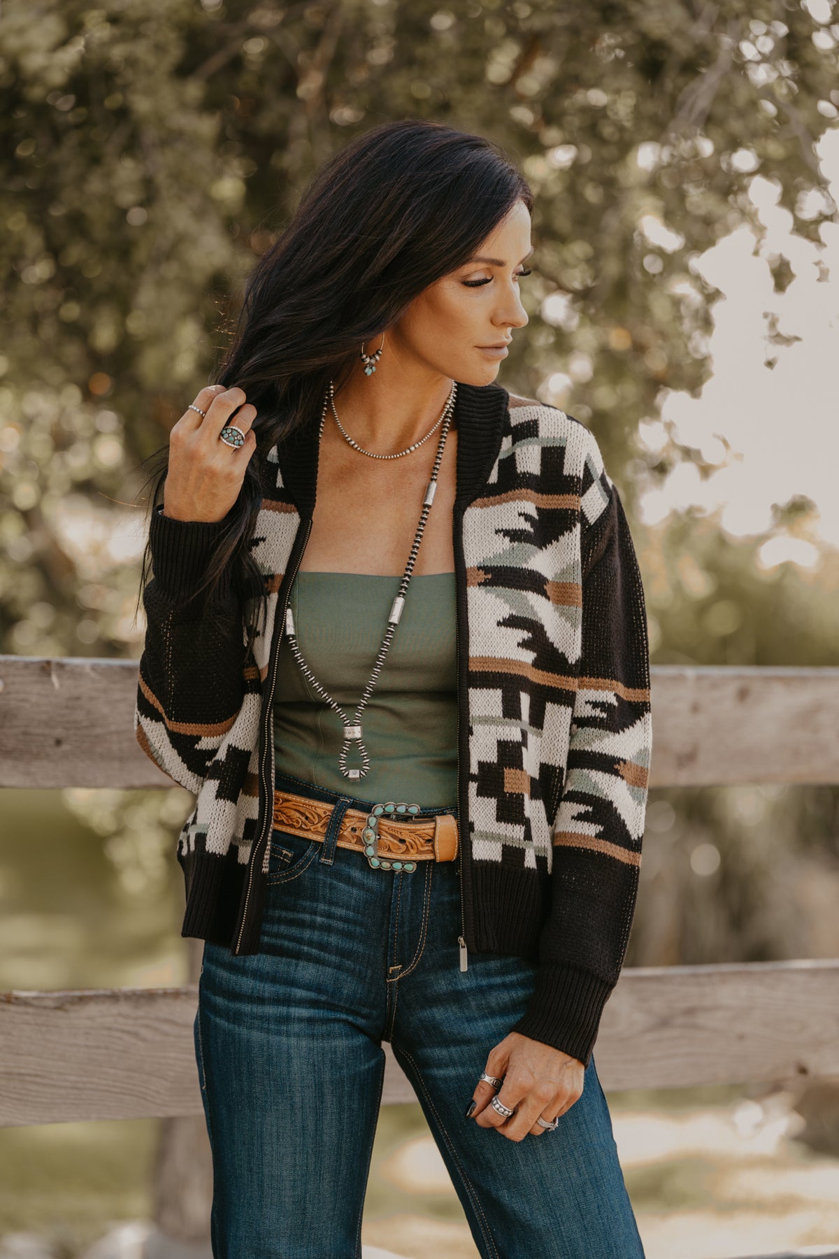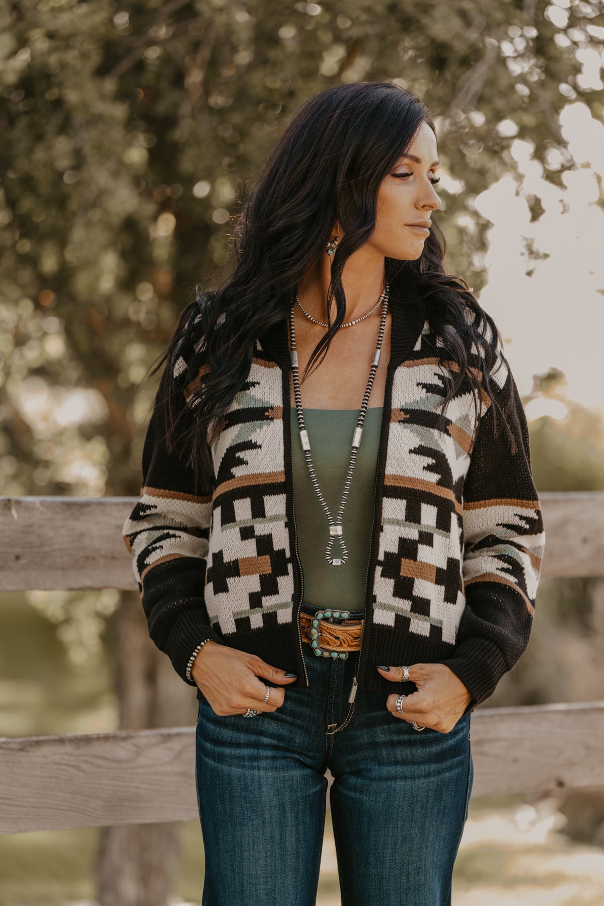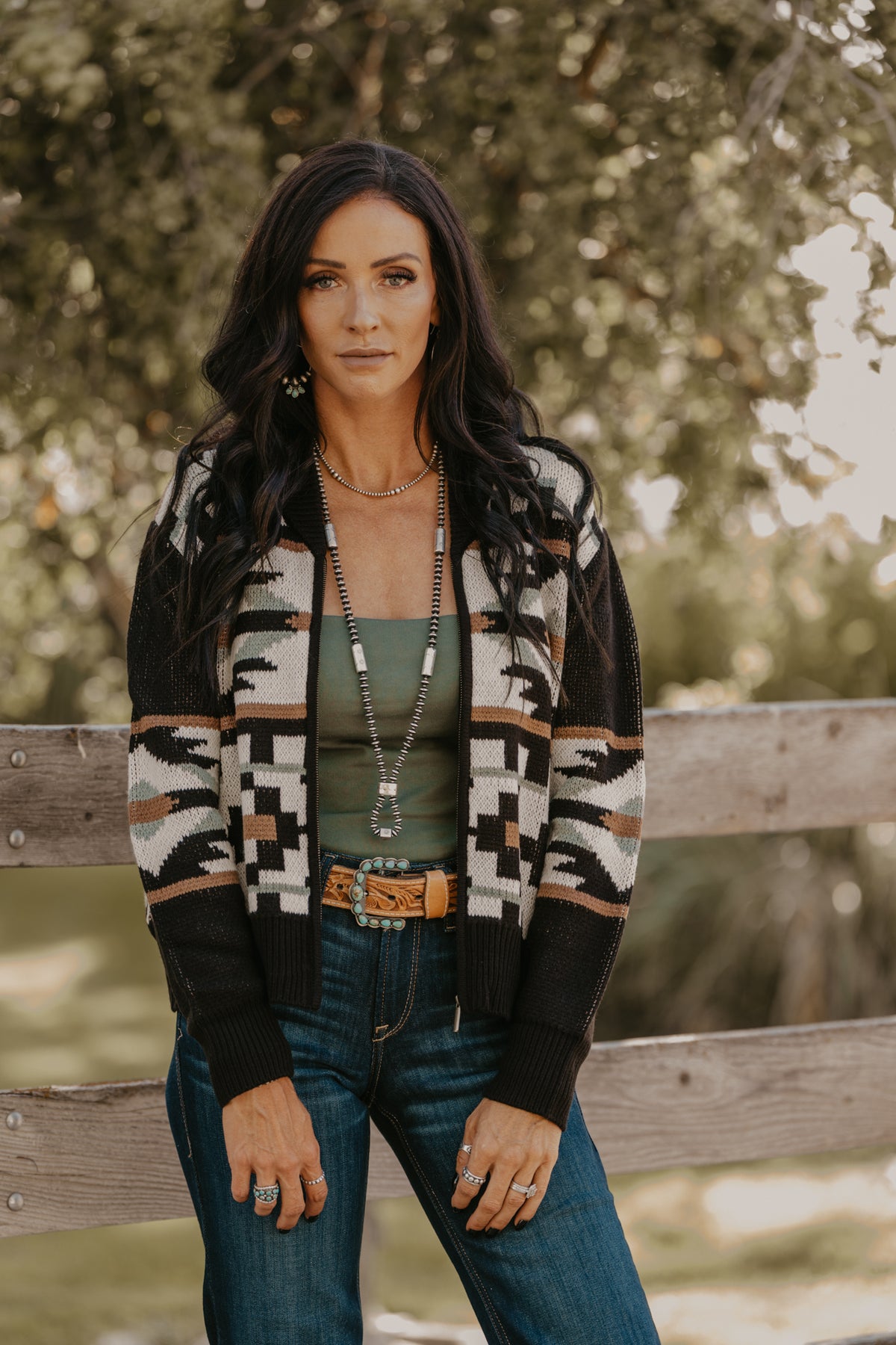 Cozy up the cowgirl way this season with our Women’s Southwestern Full Zip Cardigan. This lightweight sweater is crafted for comfort and softness, complete with ribbed trim at the hem and cuffs and a flat shawl collar design with a fit similar to a bomber jacket. It’s finished with a colorful geometric print throughout and a full-zip closure for easy layering on cooler days.