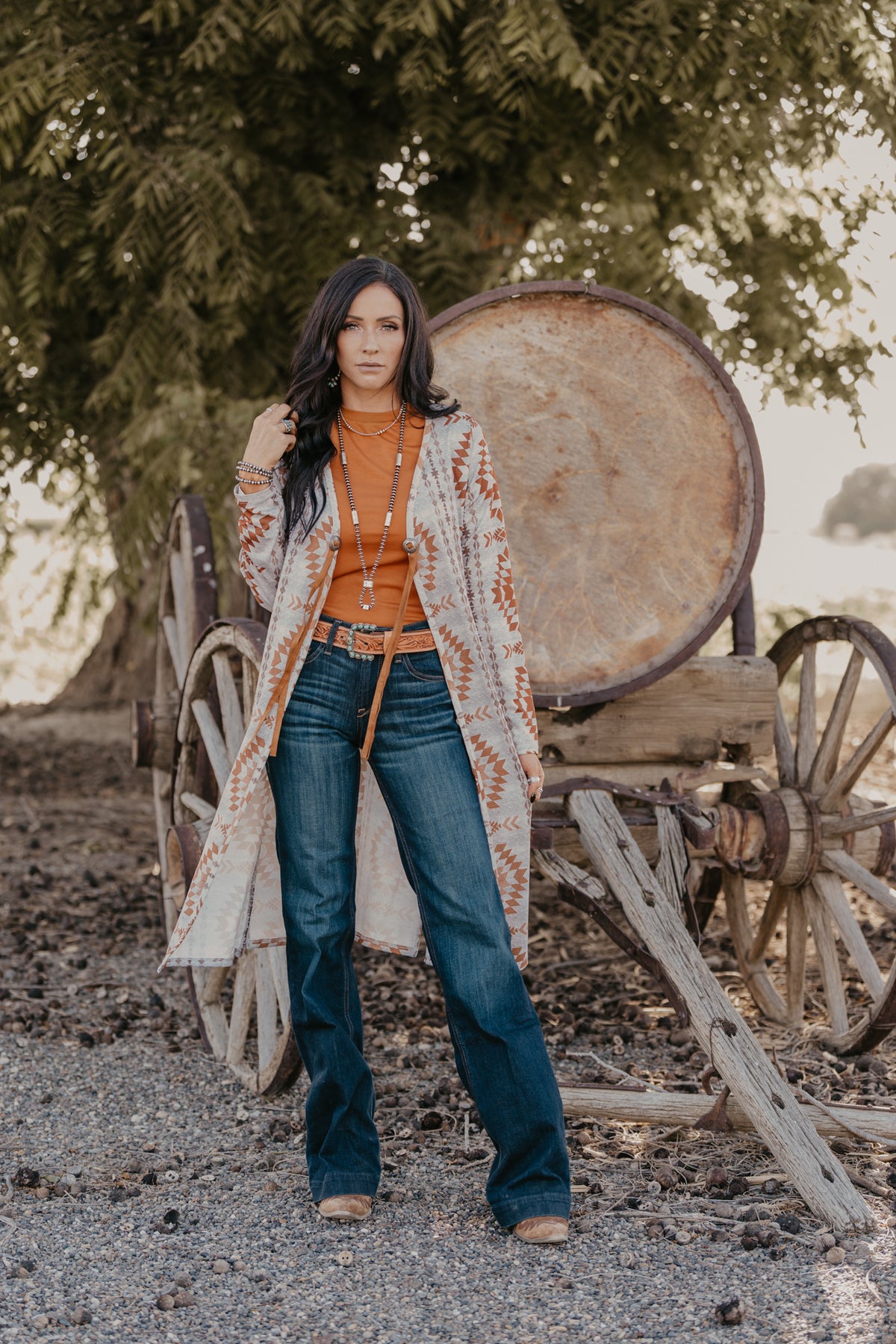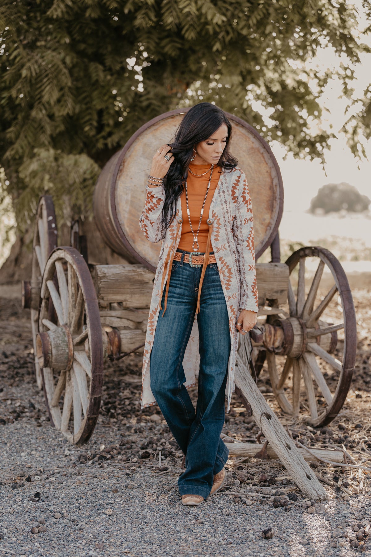 Hello fall...this duster has all the fall vibes with a western flair. Two concho front details with fringe. Runs true to size with some room.