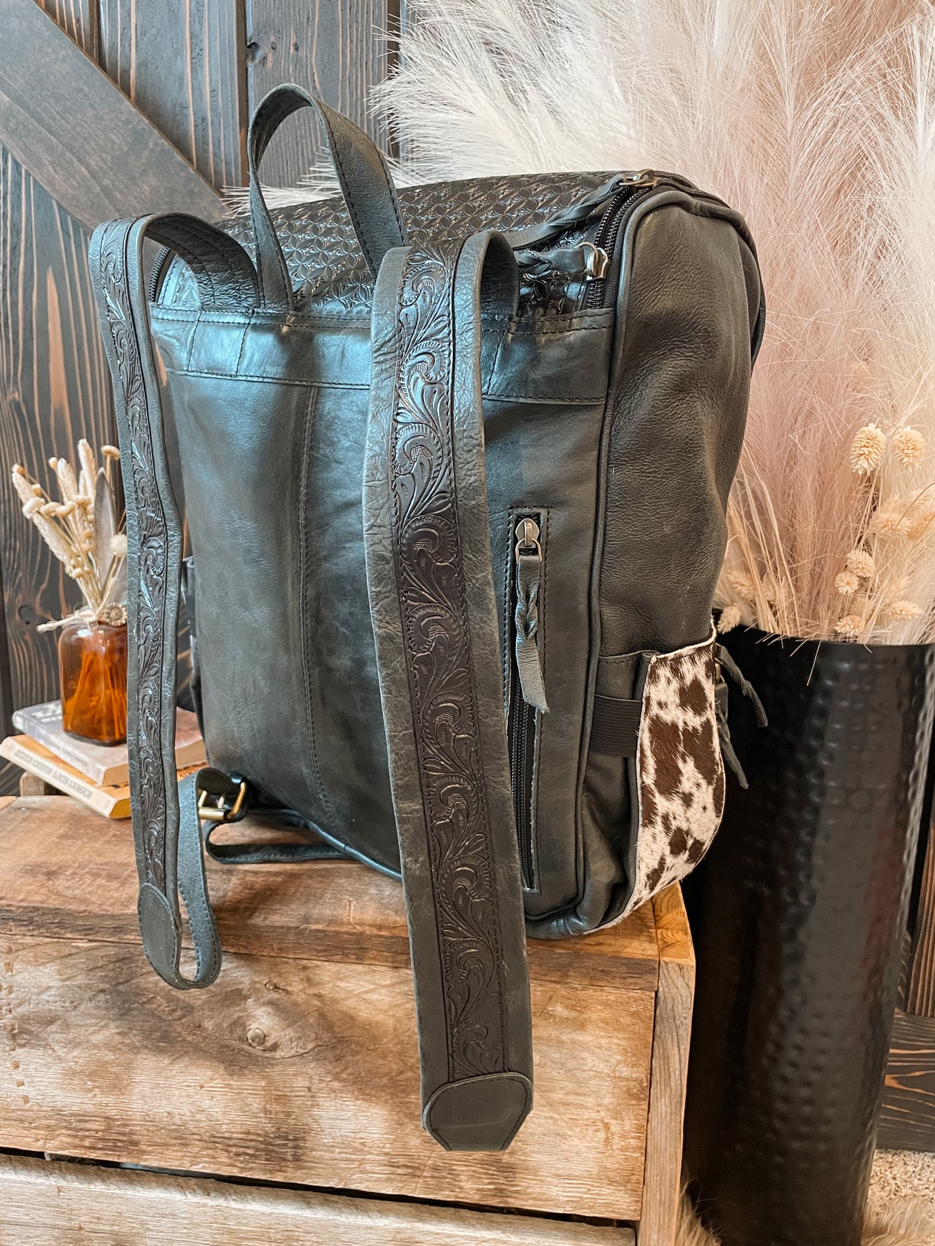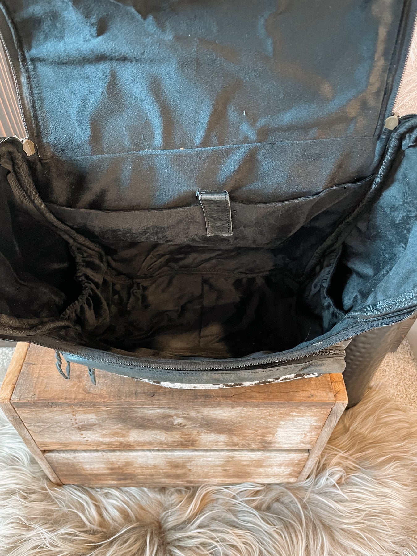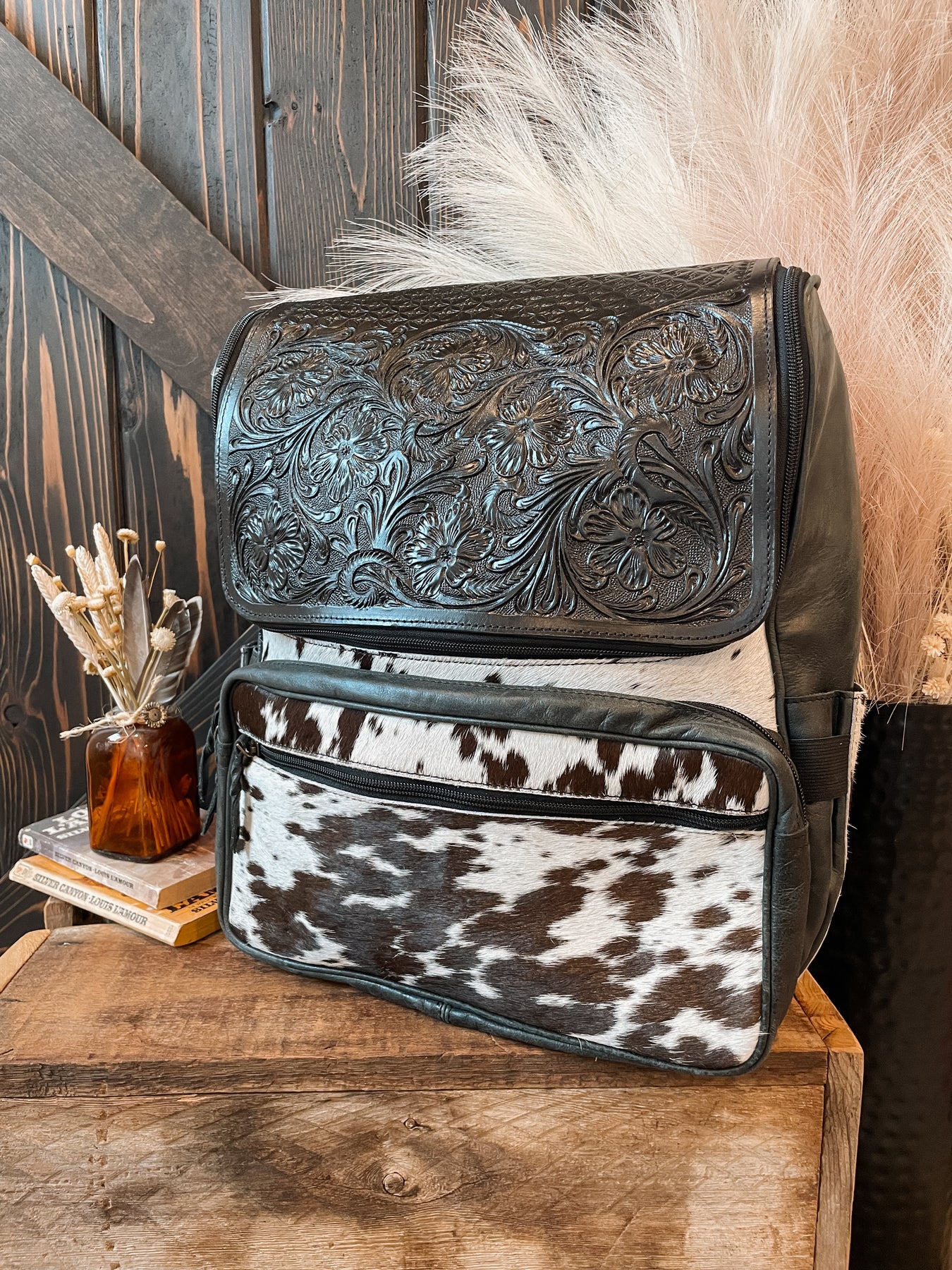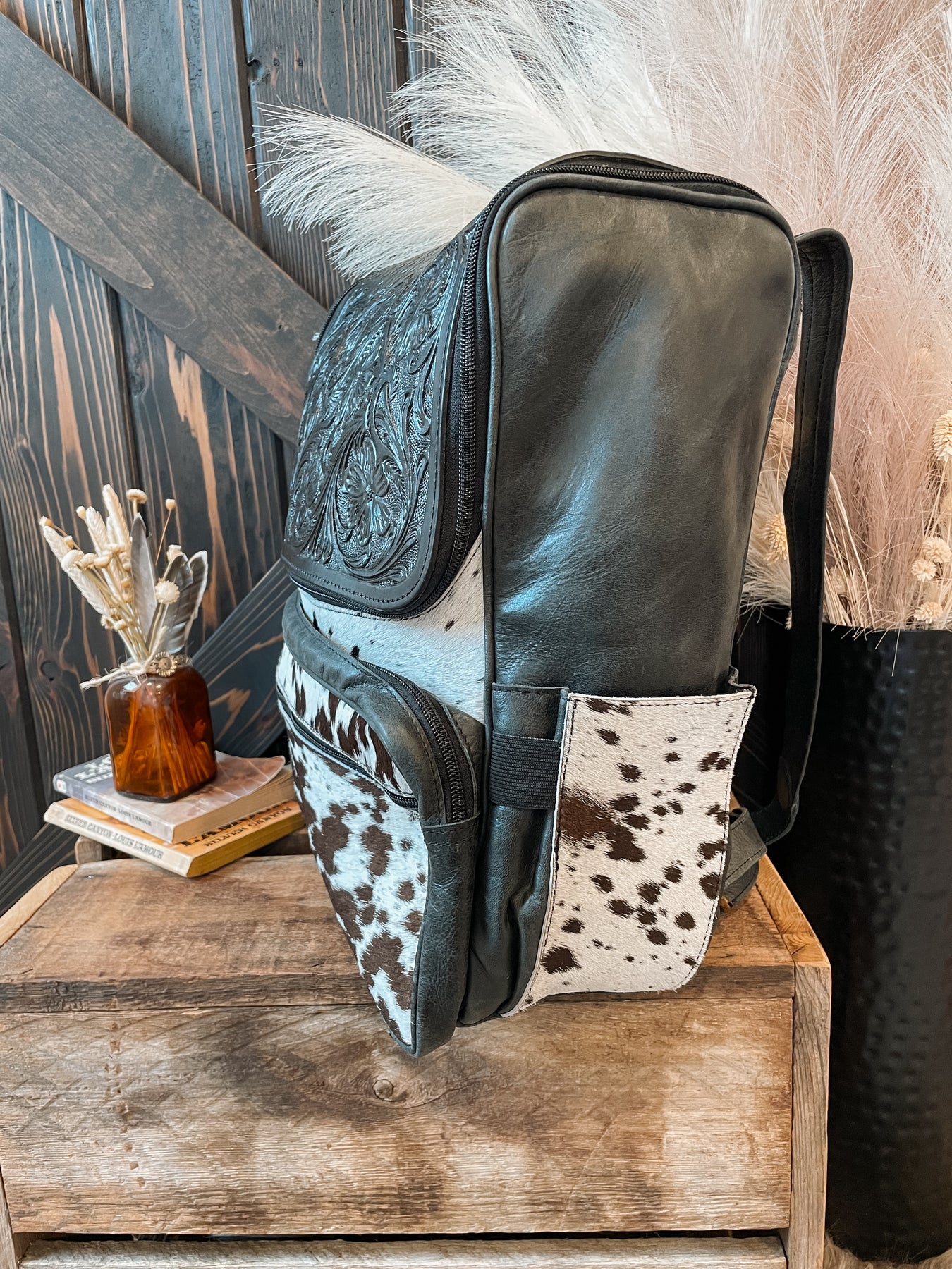 All over cowhide backpack with front fold over leather patch top, a back leather panel, adjustable straps with leather runner detail, and fully lined. The inside has a two elastic side bottle holders, electronic slide pocket, and is fully lined. . Front has a big front pocket with a smaller front pocket on this compartment as well as two side cinched pockets. Zipper top closure.