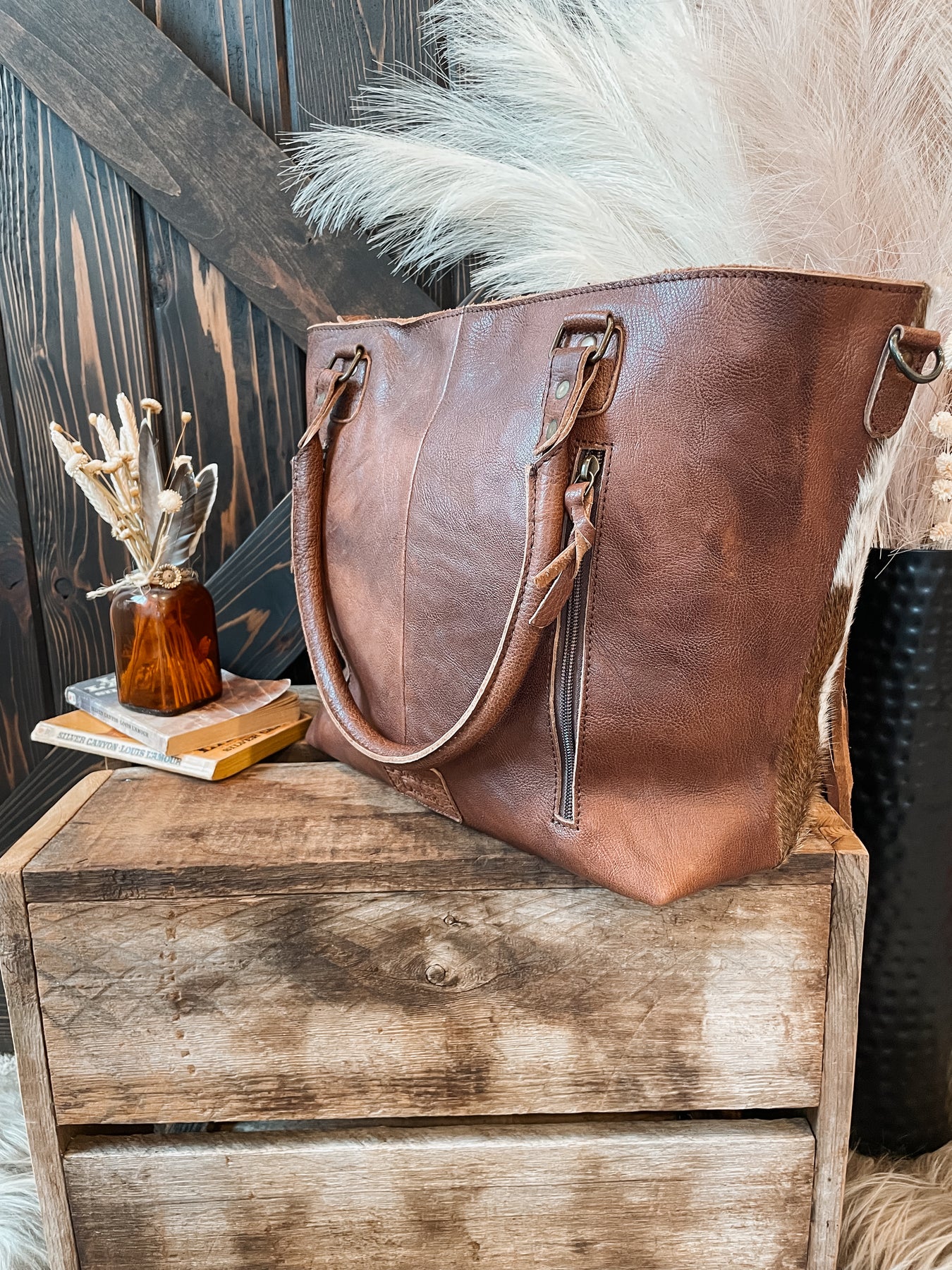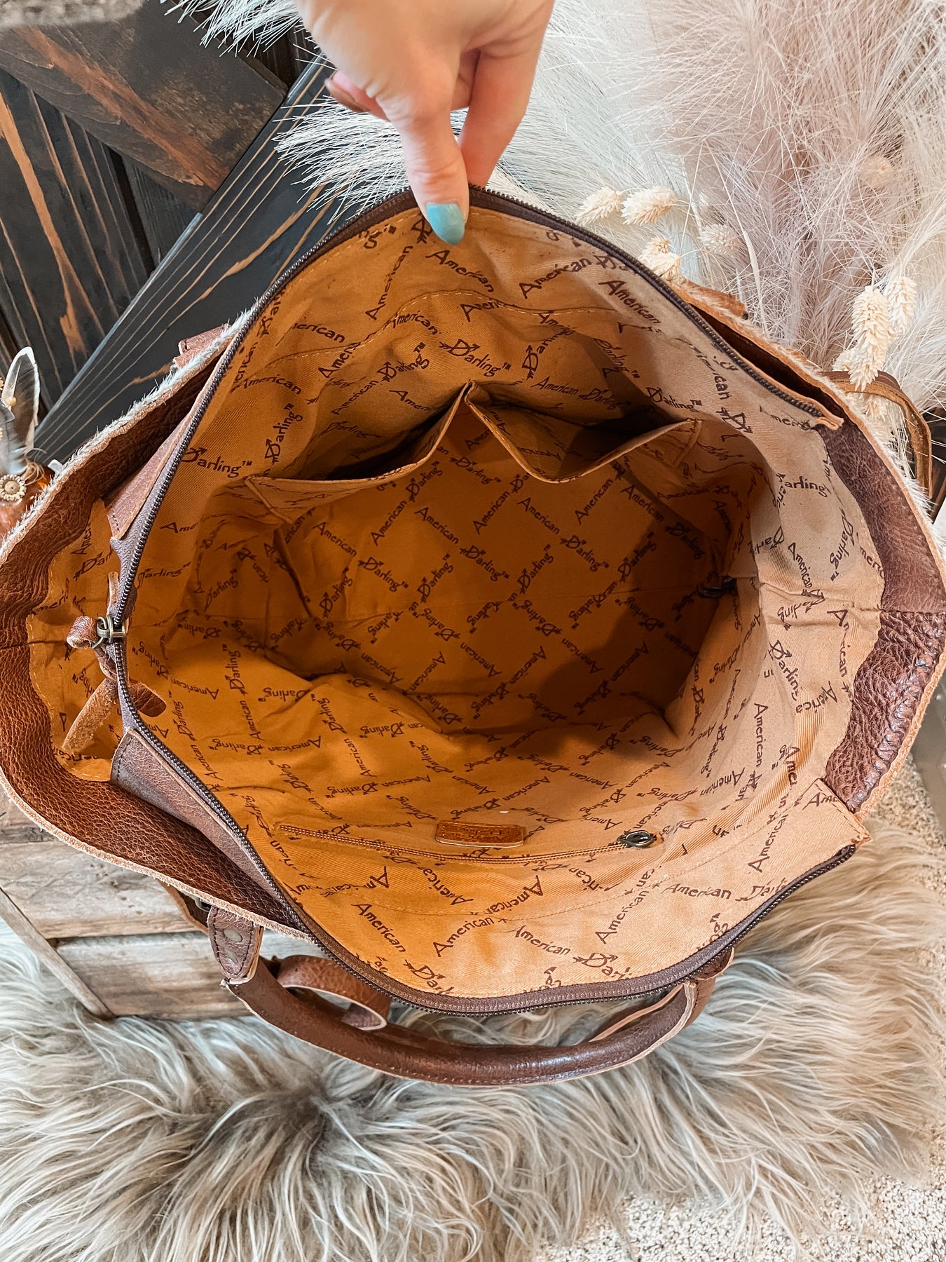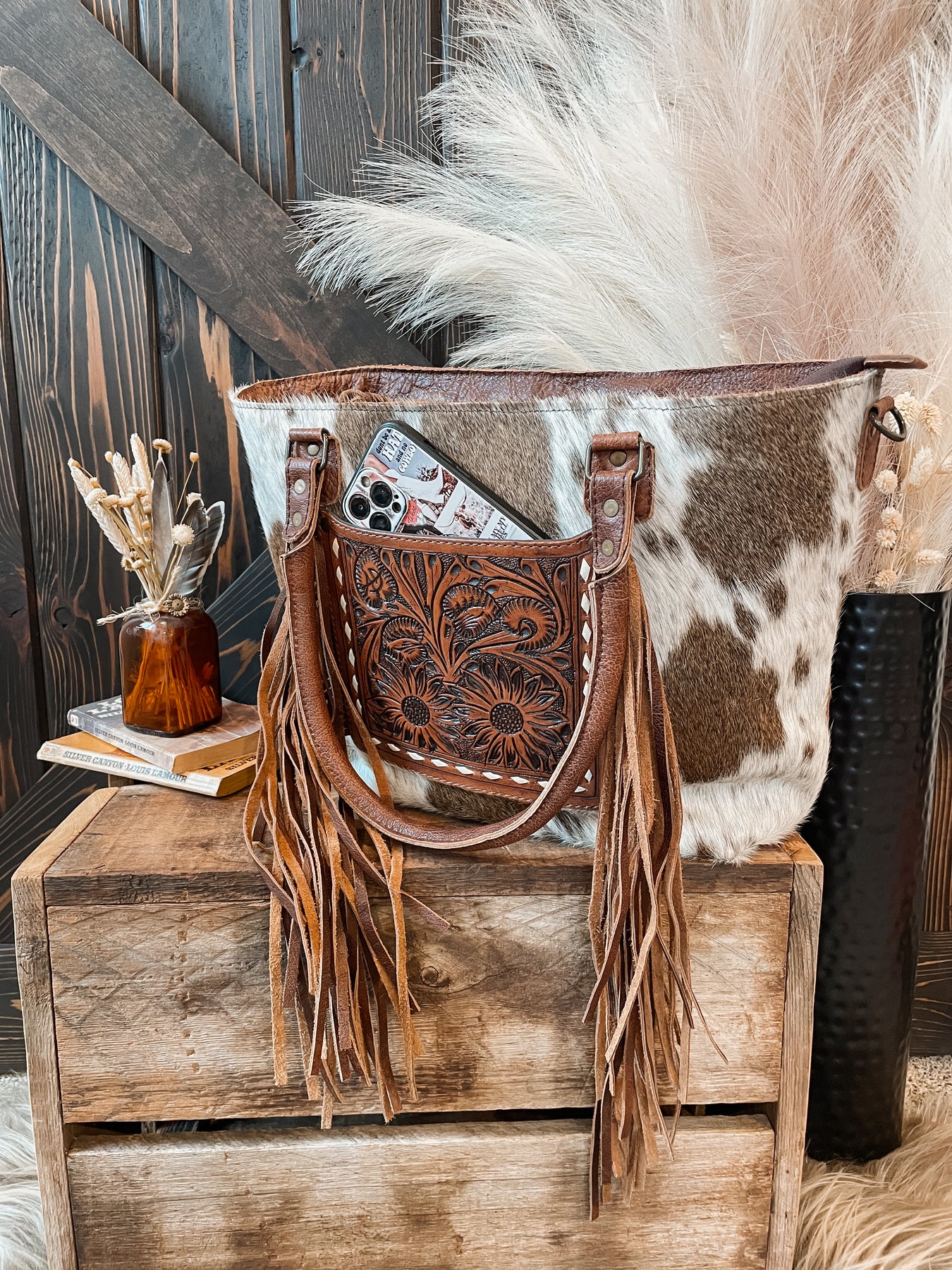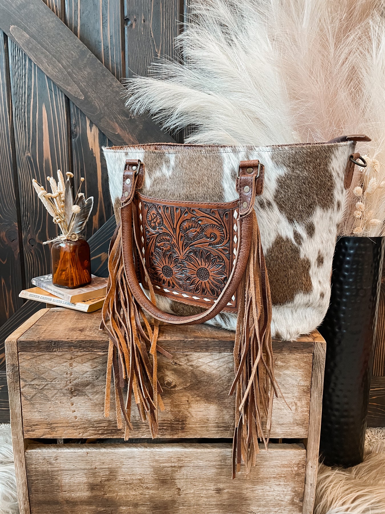 Cowhide travel bag with zipper top closure. Font slide pocket with tooled leather patch, white buckstitch, and fringe detail. Zipper top closure, fully lined, inner zipper privacy pocket, with two side slide pockets. Shoulder carrying straps. Comes with optional an adjustable crossbody carrying strap.