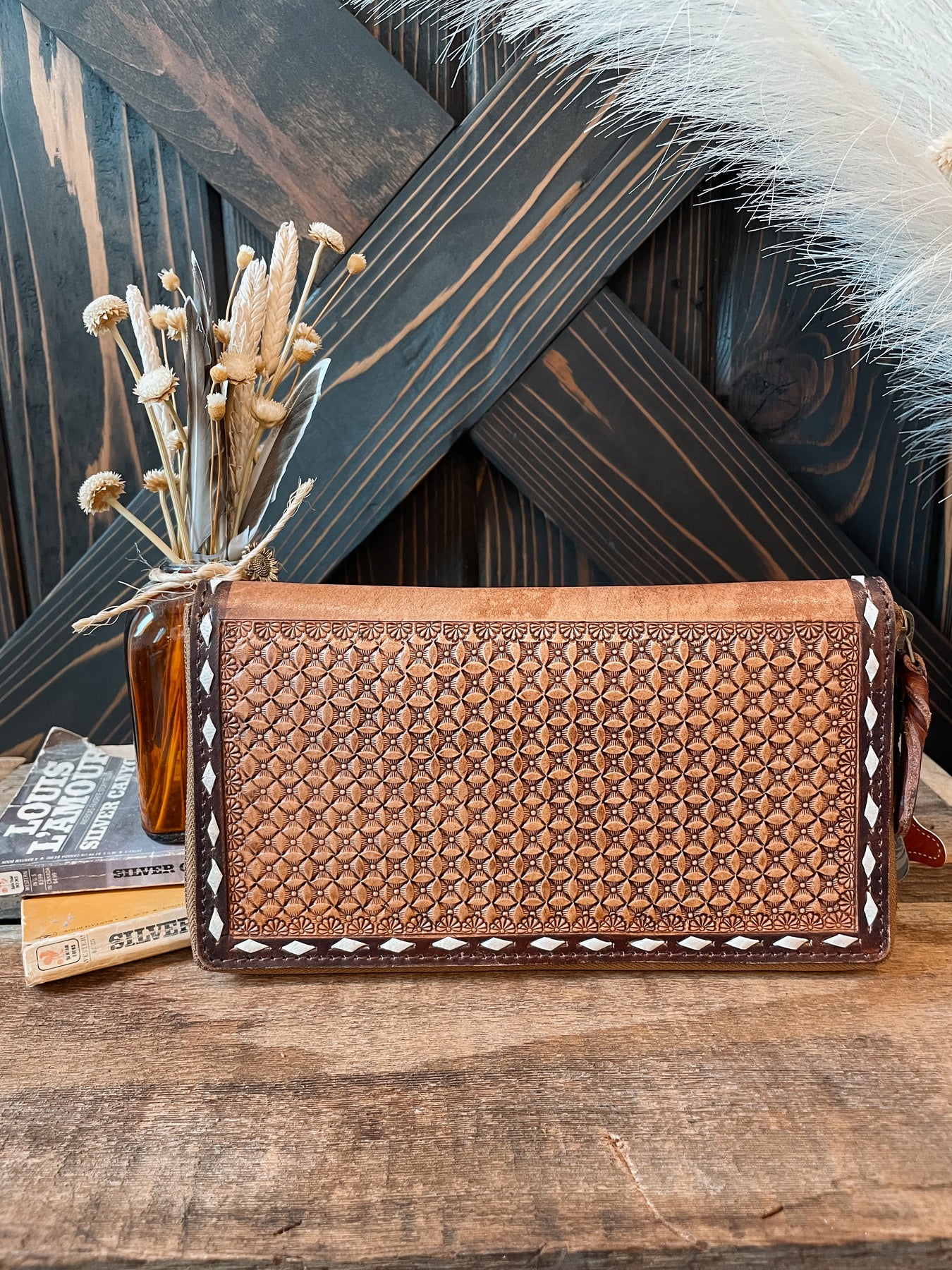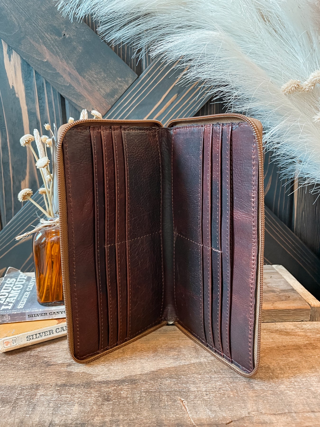 The cutest wallet ever! Peep that white buckstitch and tooled leather. Features zipper closure pocket, 4 wide money/checkbook slots, and 12 card slots.