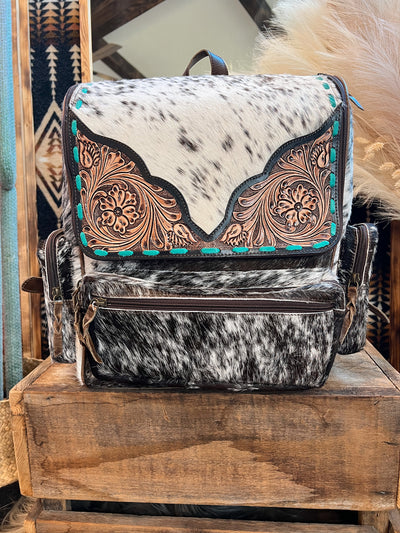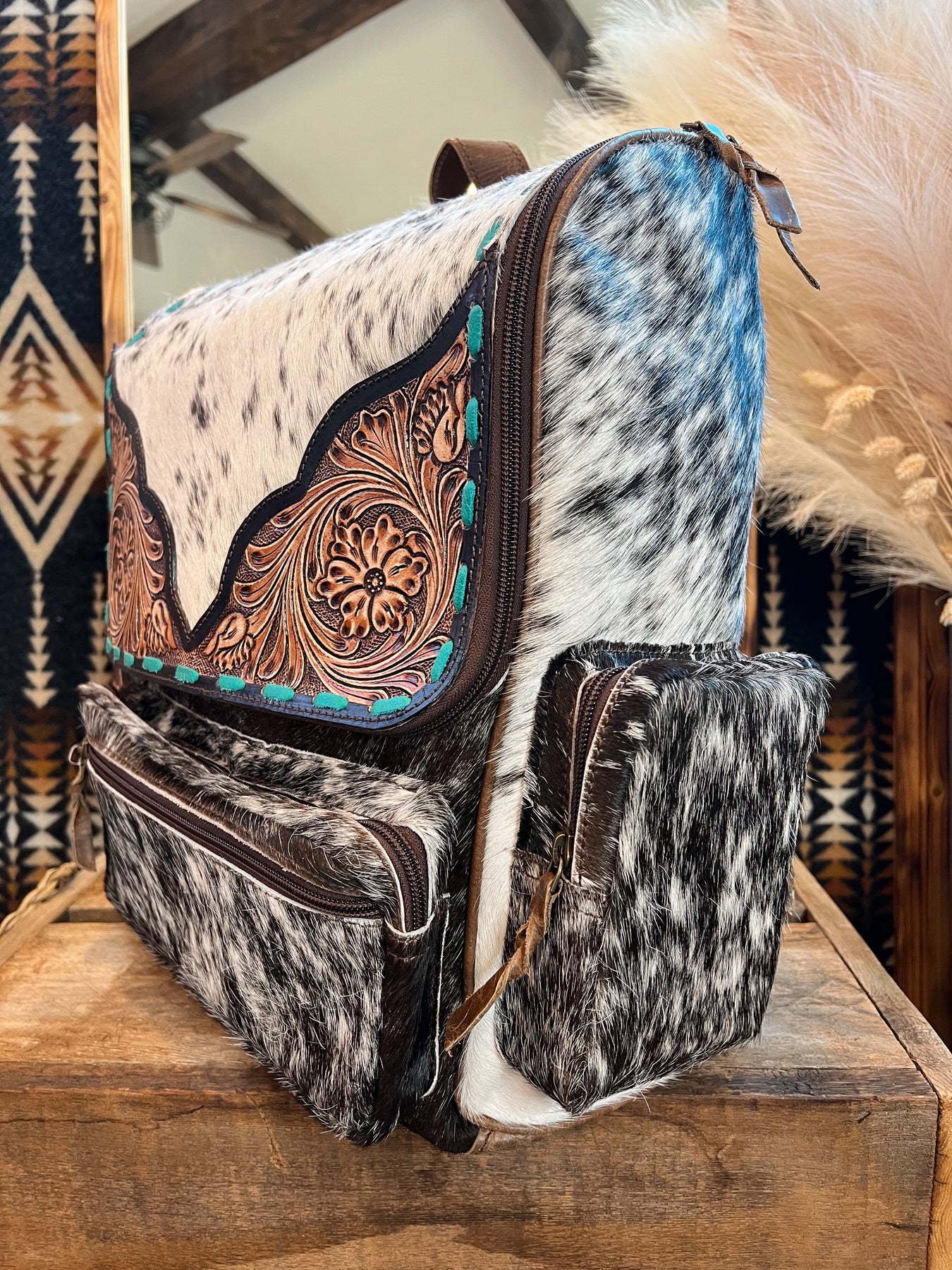 All over cowhide backpack with a back leather panel, adjustable straps, and fully lined. The inside has two side bottle holder pockets and padded tablet holder. Front has a big front pocket with a smaller front pocket on this compartment as well as two side zipper pockets. Two front tooled leather panel details. Zipper top closure. Adjustable strap length.