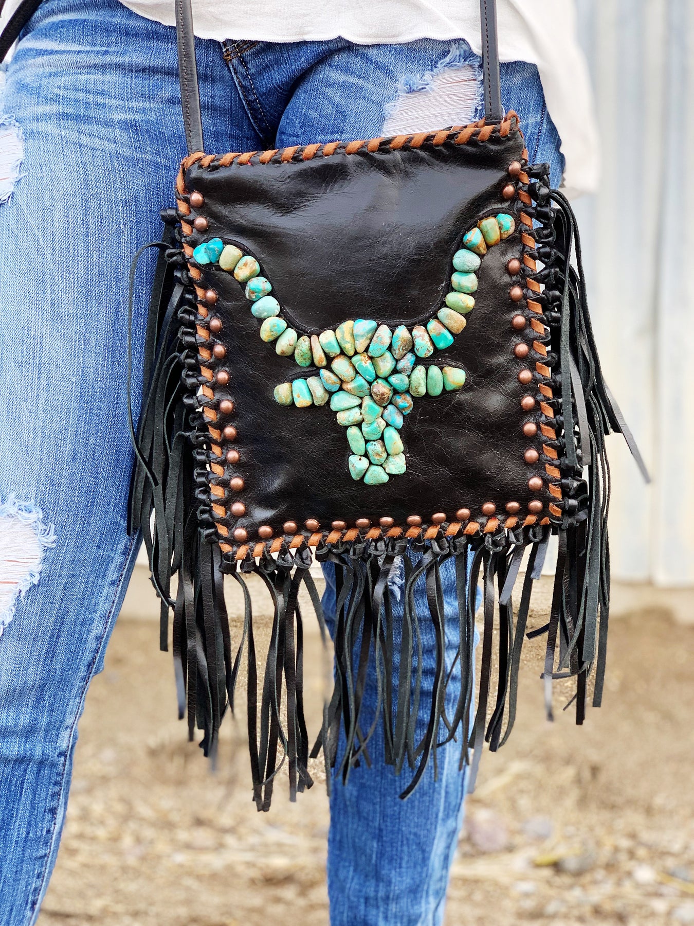 Handmade in the USA by Kurtmen Design. A crossbody purse with zipper closure top. Nugget turquoise longhorn on bag body. Patina 40 count stud accent. Fully lined inside.