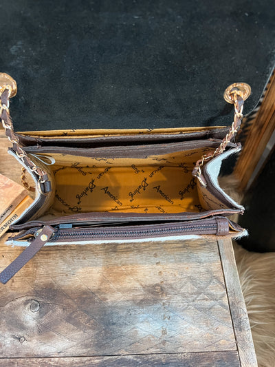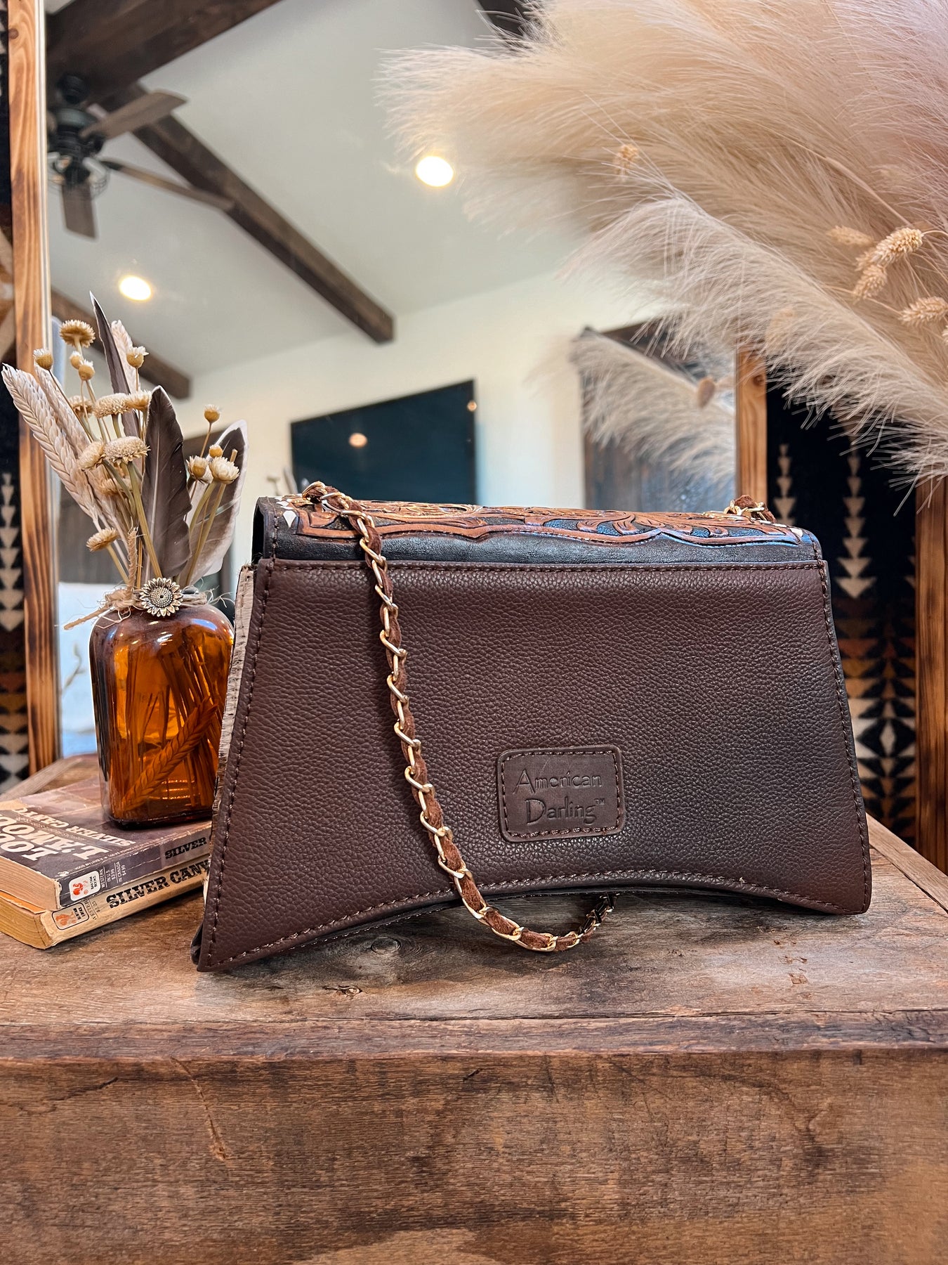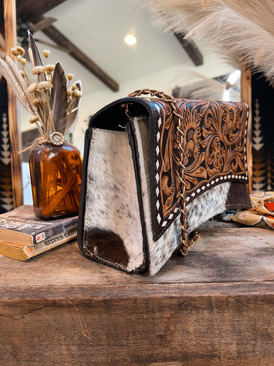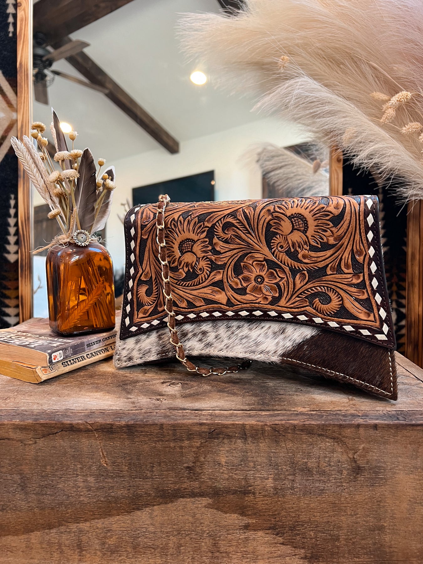 Western glam meets uptown chic...with a bit of punchy in there. This gorgeous handbag is a must for all you stylish western babes. Leather bag, fold over top closure with double magnetic closure. One main large compartment, inner slide compartment, and zipper closure compartment. Fully lined. Tooled leather front patch with white buckstitch.