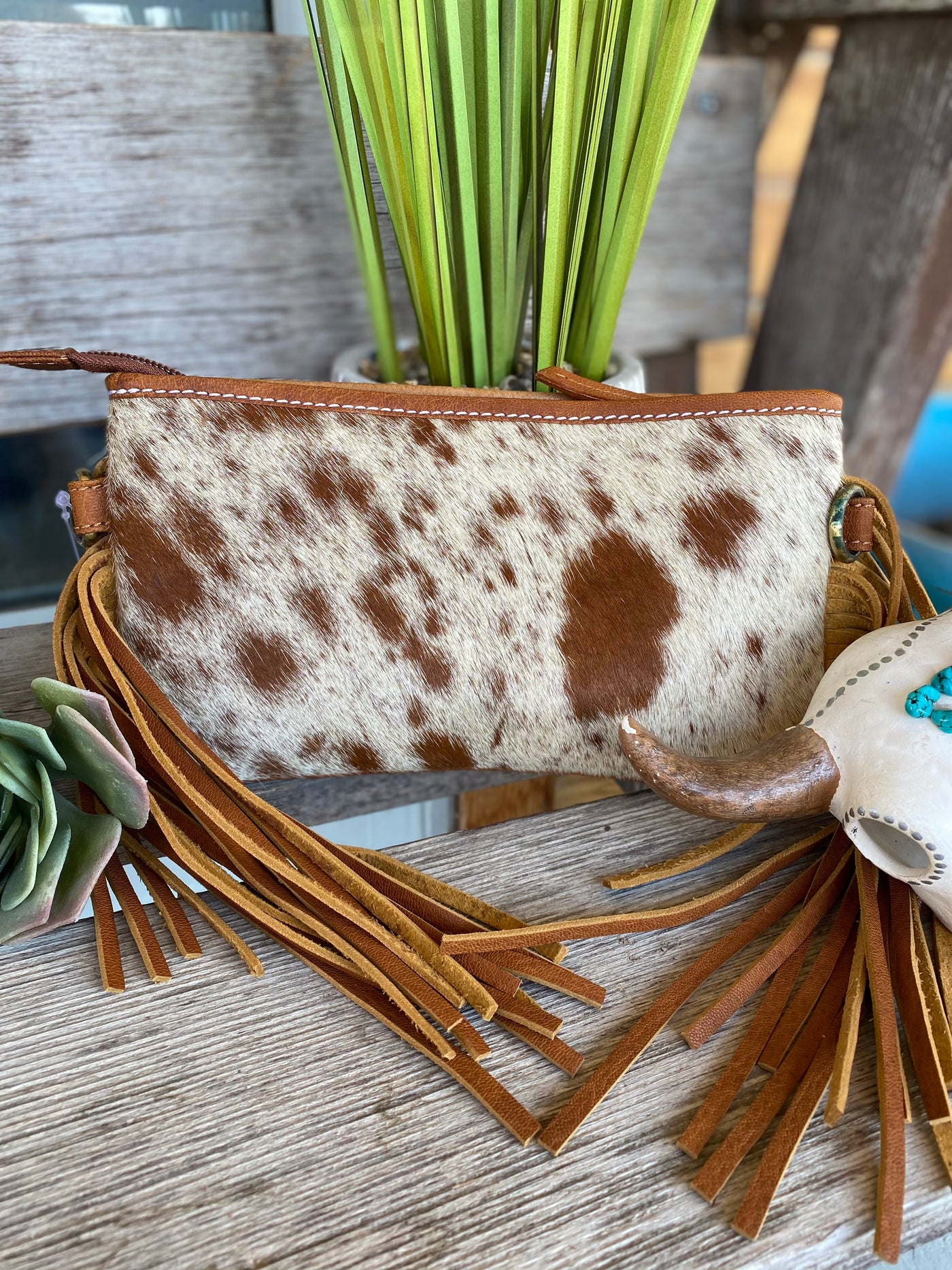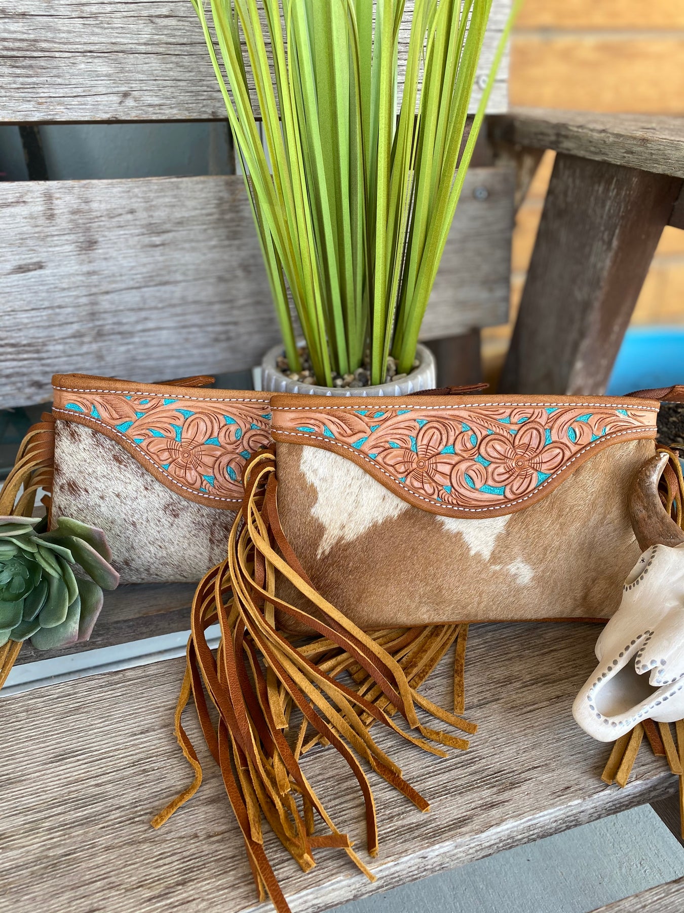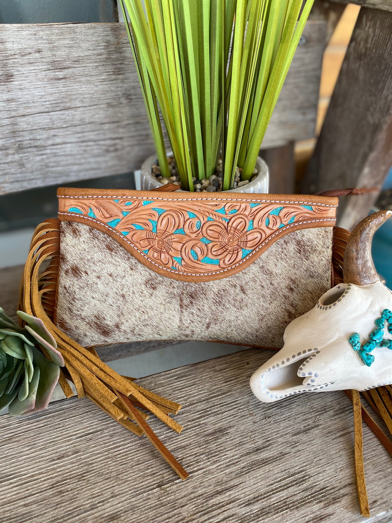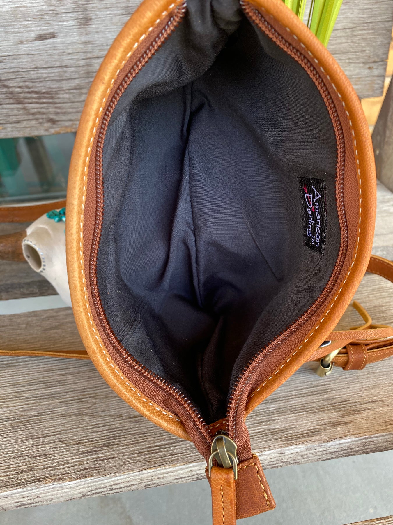Small crossbody style purse with adjustable strap. Has top zipper closer and is fully lined. Top tooled leather patch.