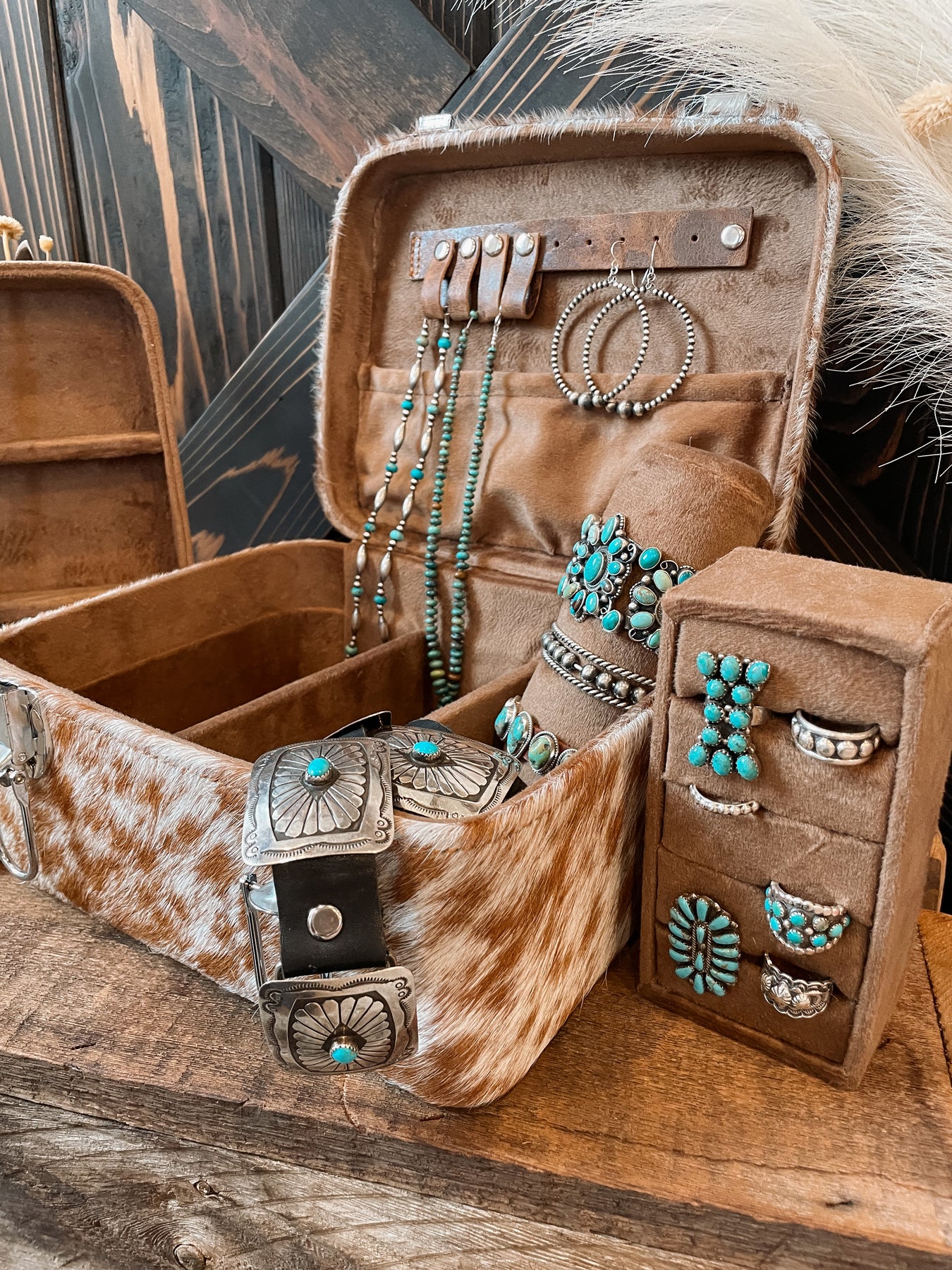 Cowhide travel set with buckle closure. Lined inside to protect your belongings. Features top holder for necklaces and fish hook earrings and double decker lower compartments to hold even more treasured pieces. A removable ring tray and cuff bar. Tooled leather detail on top with leather handle.