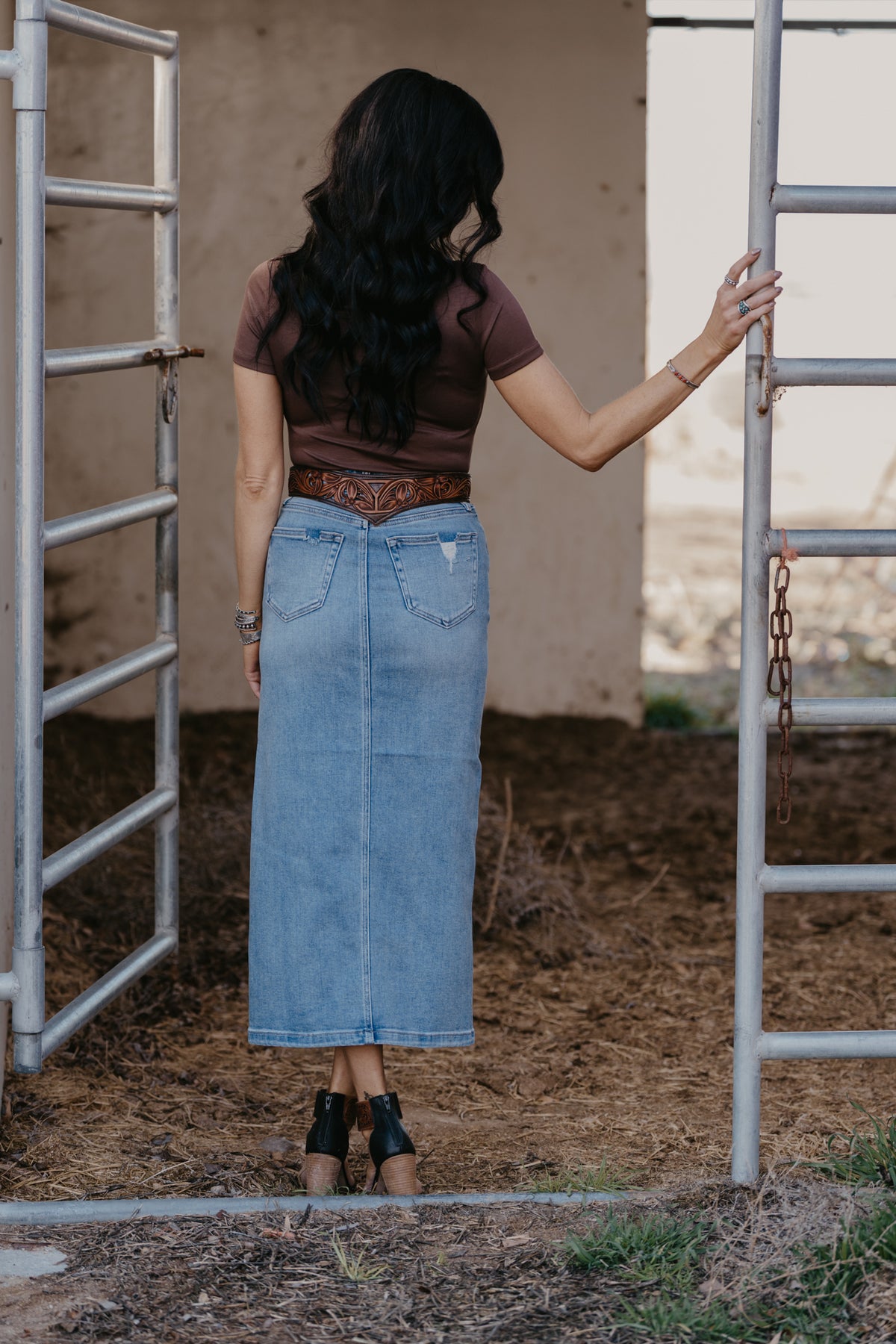 Part of our Red Dirt & Denim Collection, the Peyton Midi Denim Skirt is a staple piece made for rodeo nights, small town strolls, and everything in between.