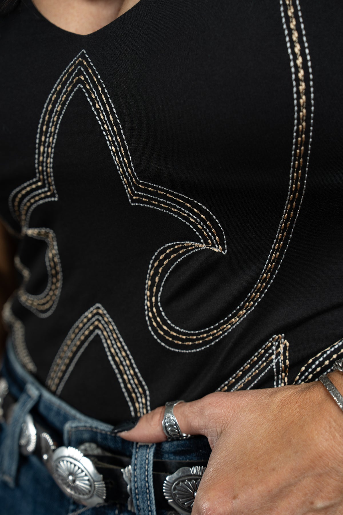 Black body suit with embroidered detail. Cheeky style bottom with double clasp closure. Has great stretch.