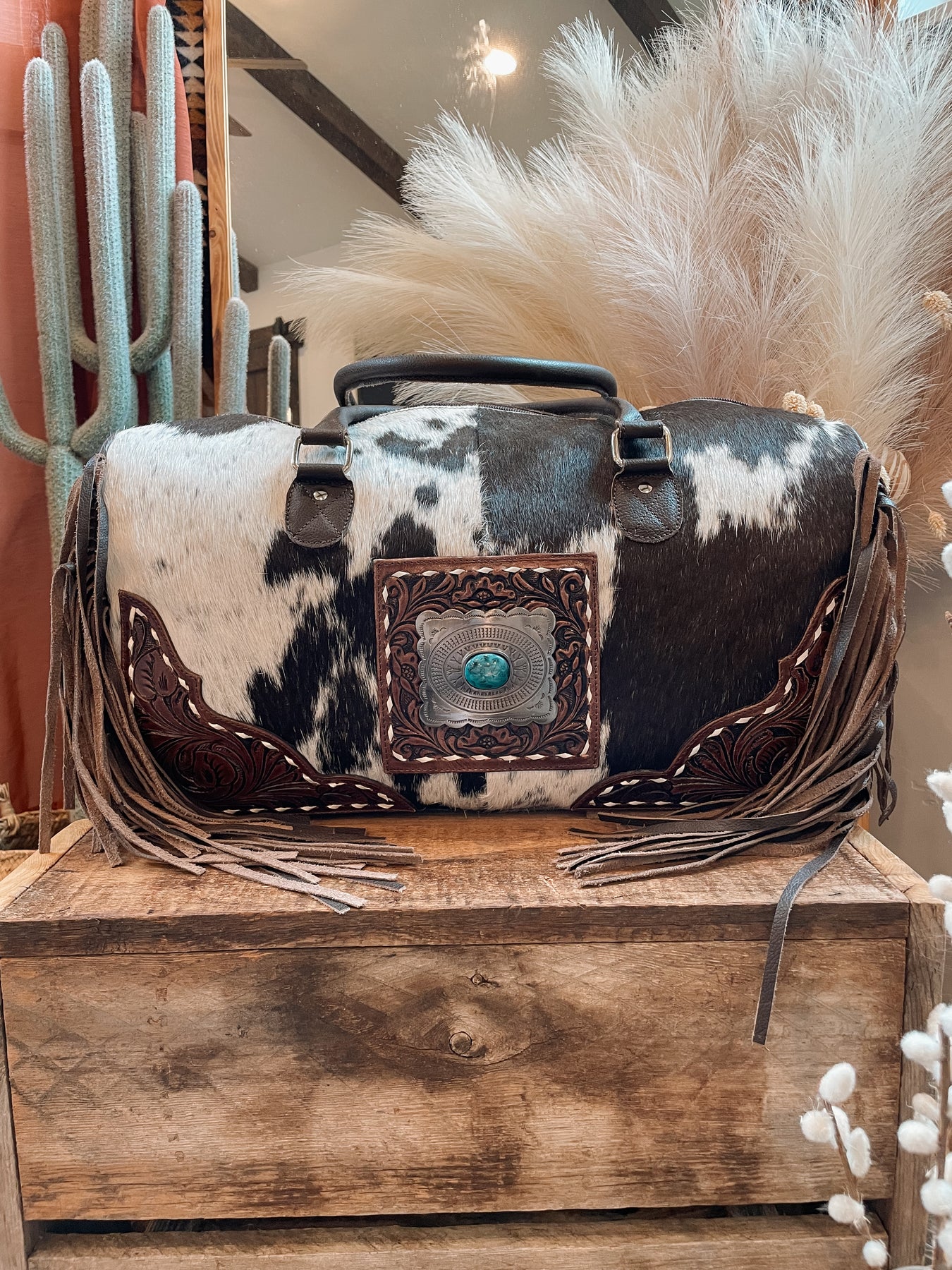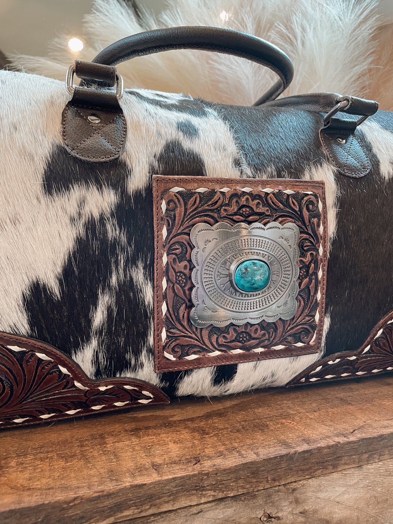Cowhide front panel leather duffle bag. Comes with optional crossbody adjustable carrying strap. Fully lined inside with inner zipper privacy pocket. Side front and concho piece on the front with tooled leather patch.