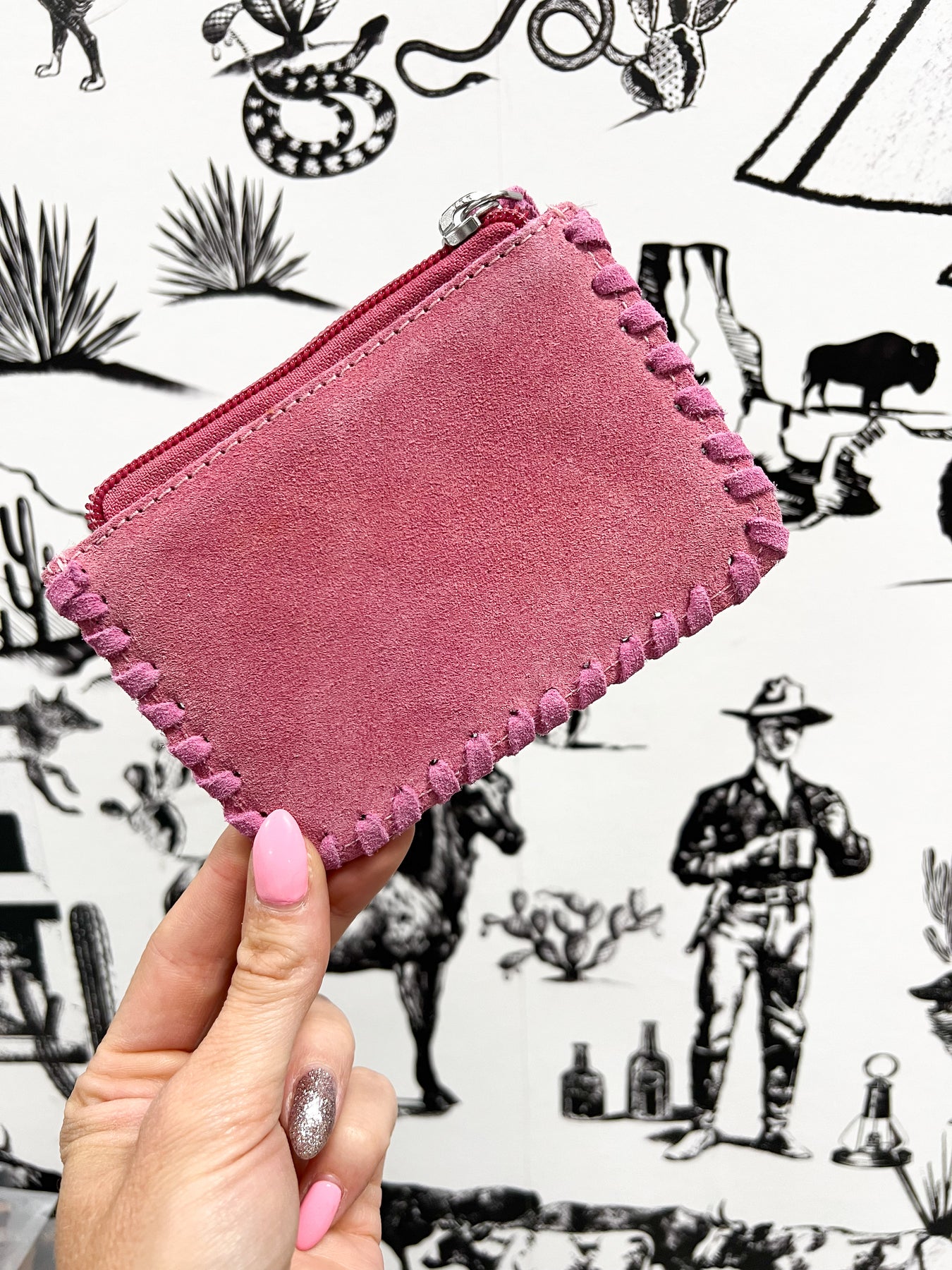 Suede leather with embroidered boot stitch pattern. Fully lined with zipper closure top.