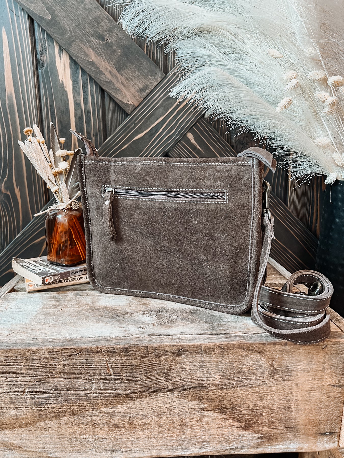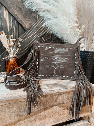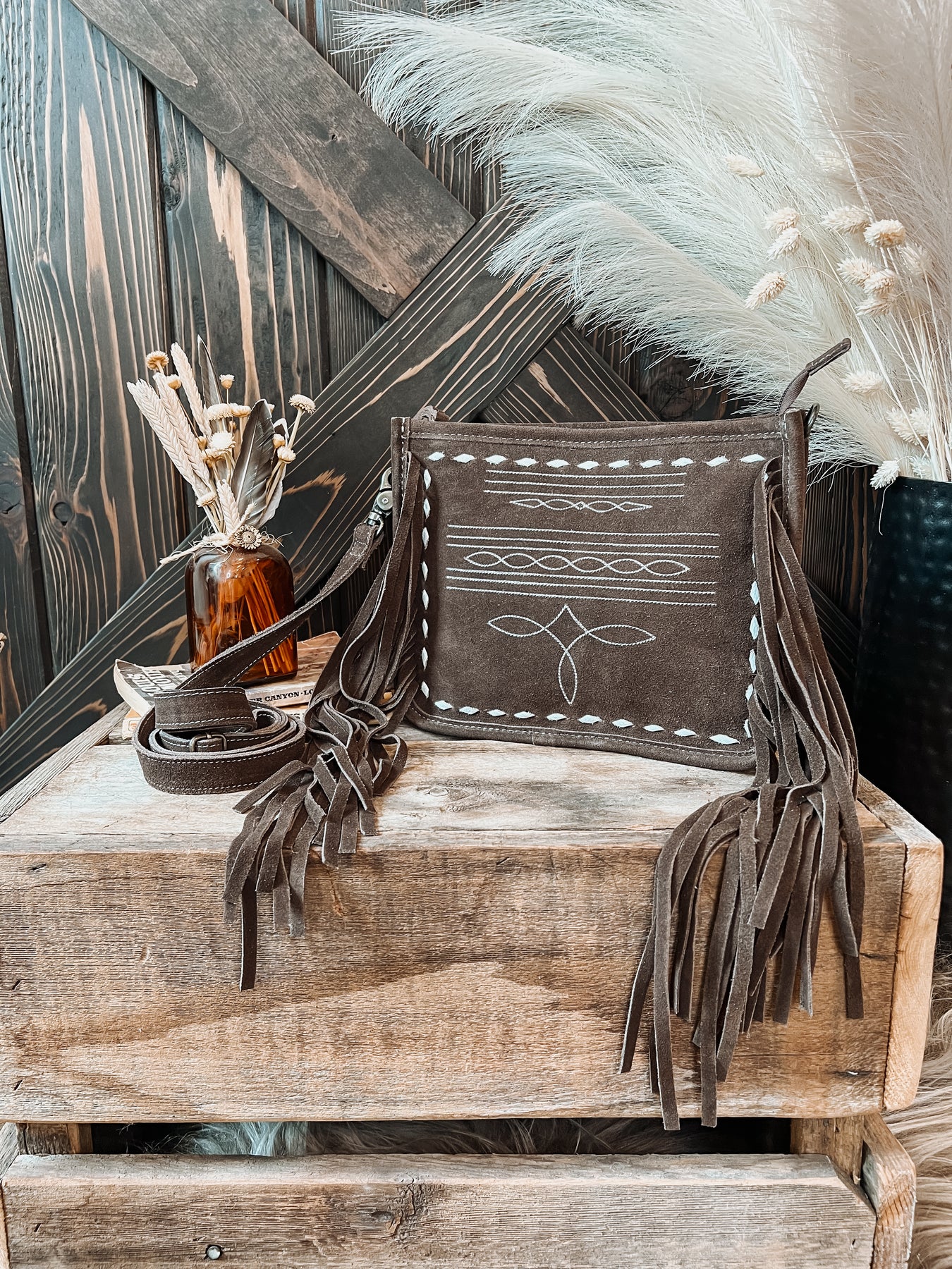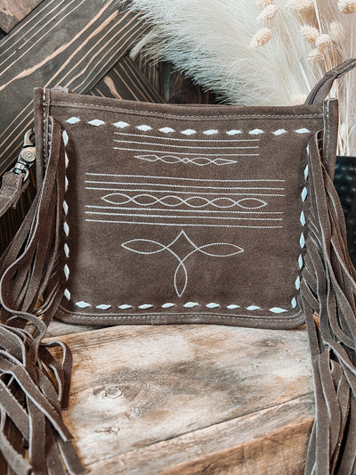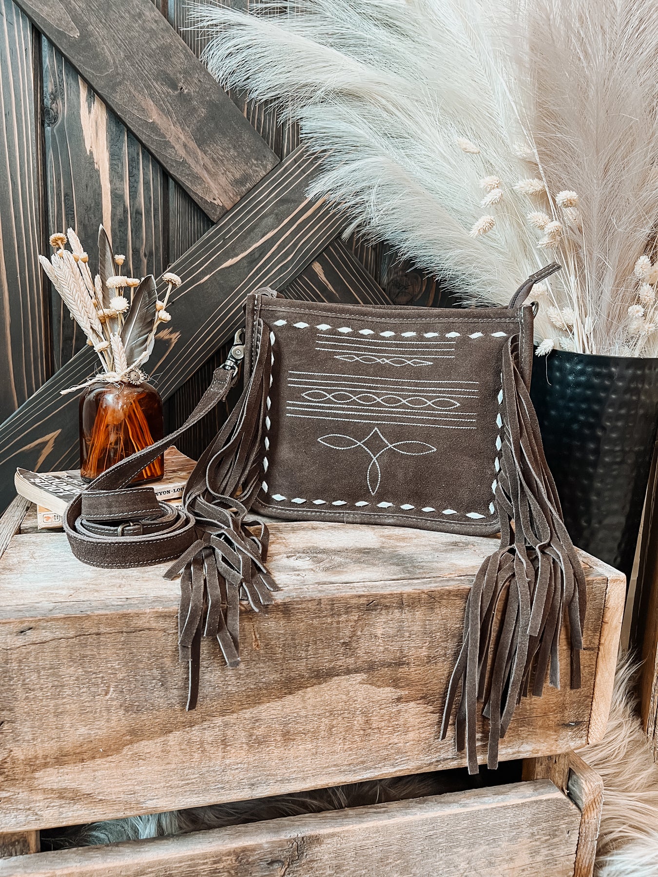 Suede leather purse with embroidered boot stitch design. Comes with optional crossbody adjustable carrying strap. Fully lined inside with inner zipper privacy pocket and side pocket. Zipper top closure with side fringe detail.