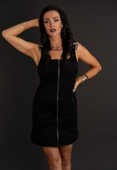 Buckle up buttercup! This suede dress is absolutely gorgeous. Has great stretch, two buckle straps to allow for adjustment, and front zipper detail. Two front pockets to hold all your things. Wear a lace top or your favorite mesh top underneath for added detail.