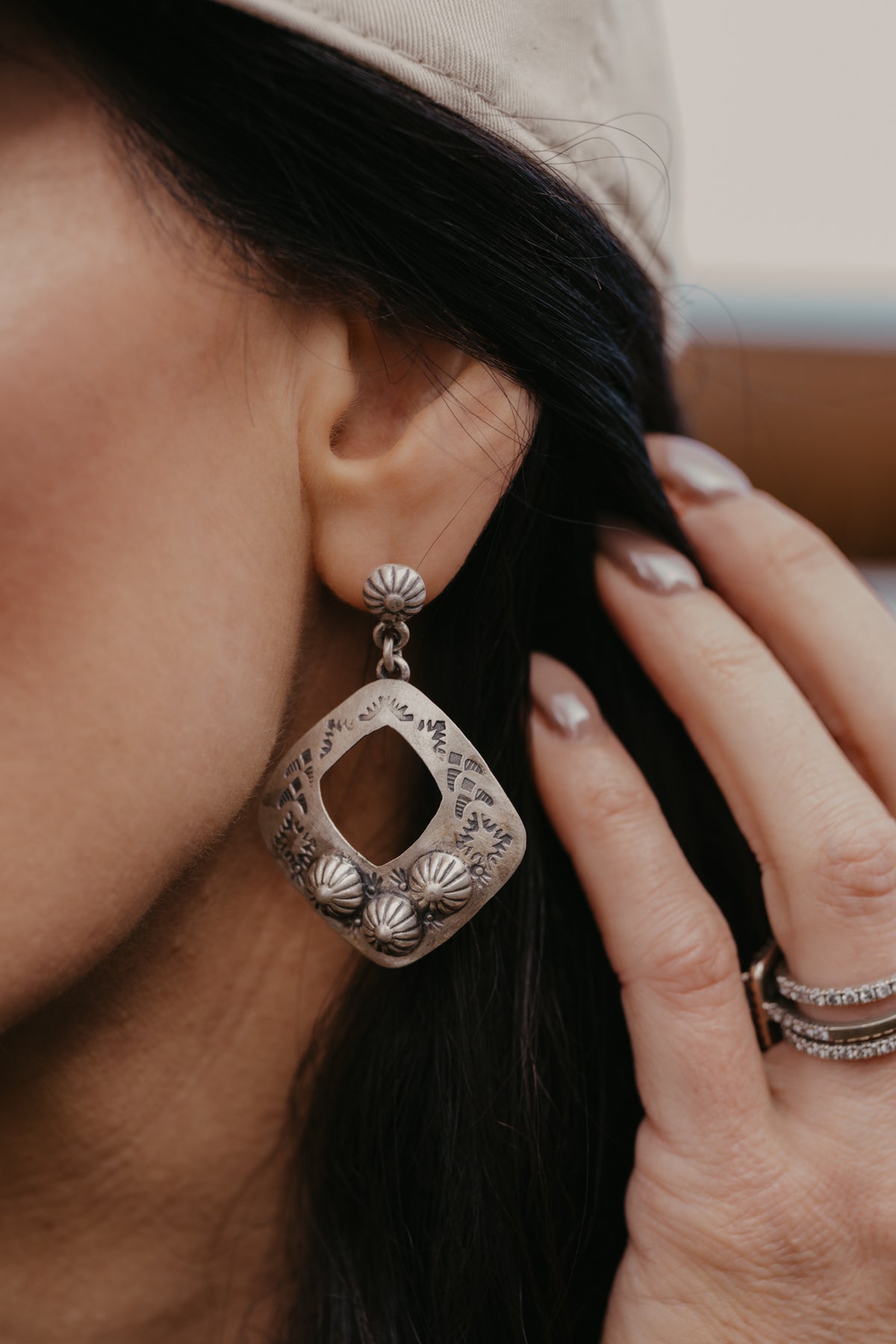 Crafted in sterling silver, these earrings feature a striking open diamond silhouette accented with classic concho detailing and hand-stamped patterns, giving them an authentic southwestern character. The vintage-inspired finish and sculpted silver elements add depth and texture, creating a piece that feels both rugged and refined.