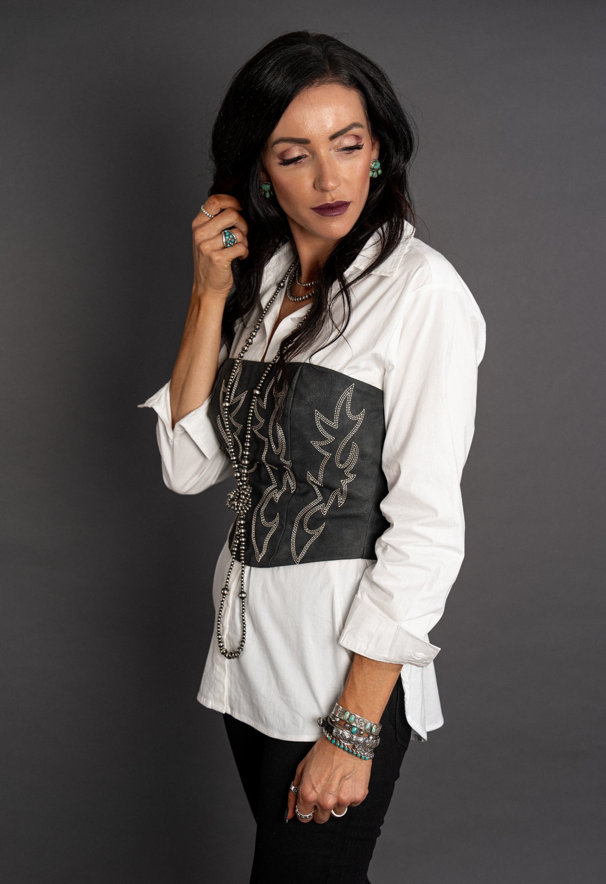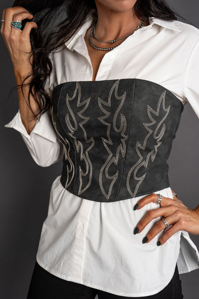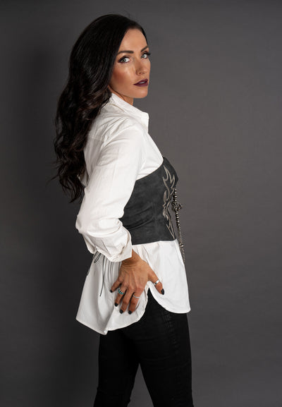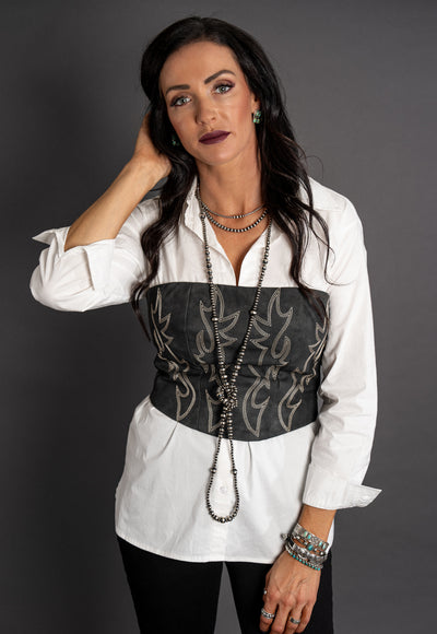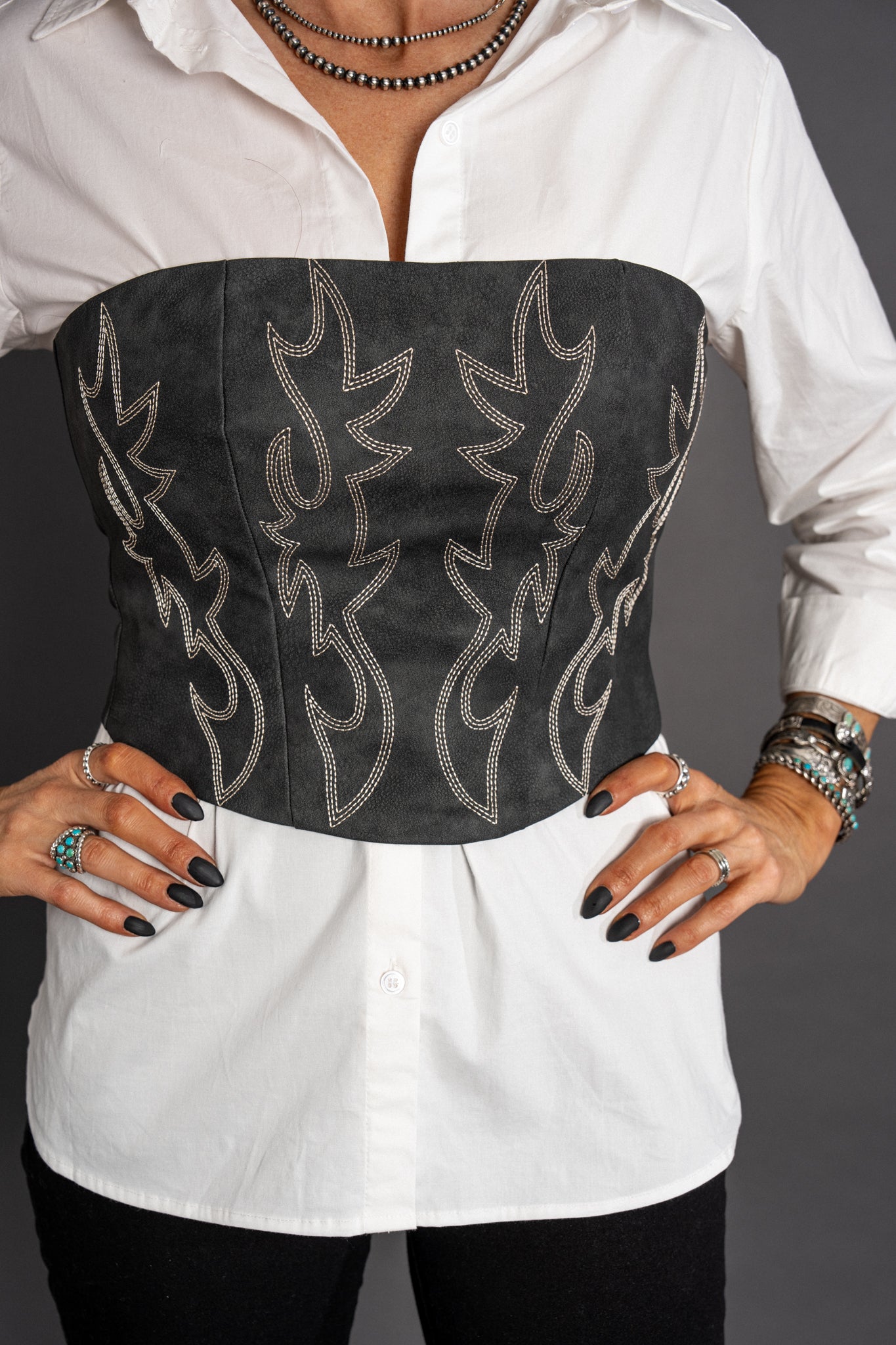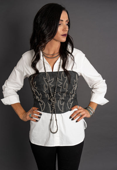 Corset style top with a western flair - peep that boot stitch detail. Full lace up back to ensure the best fit and comfort. Wear solo or pair over the top of your favorite blouse to create a layered look. Rodeos, music fests, and every event in between.