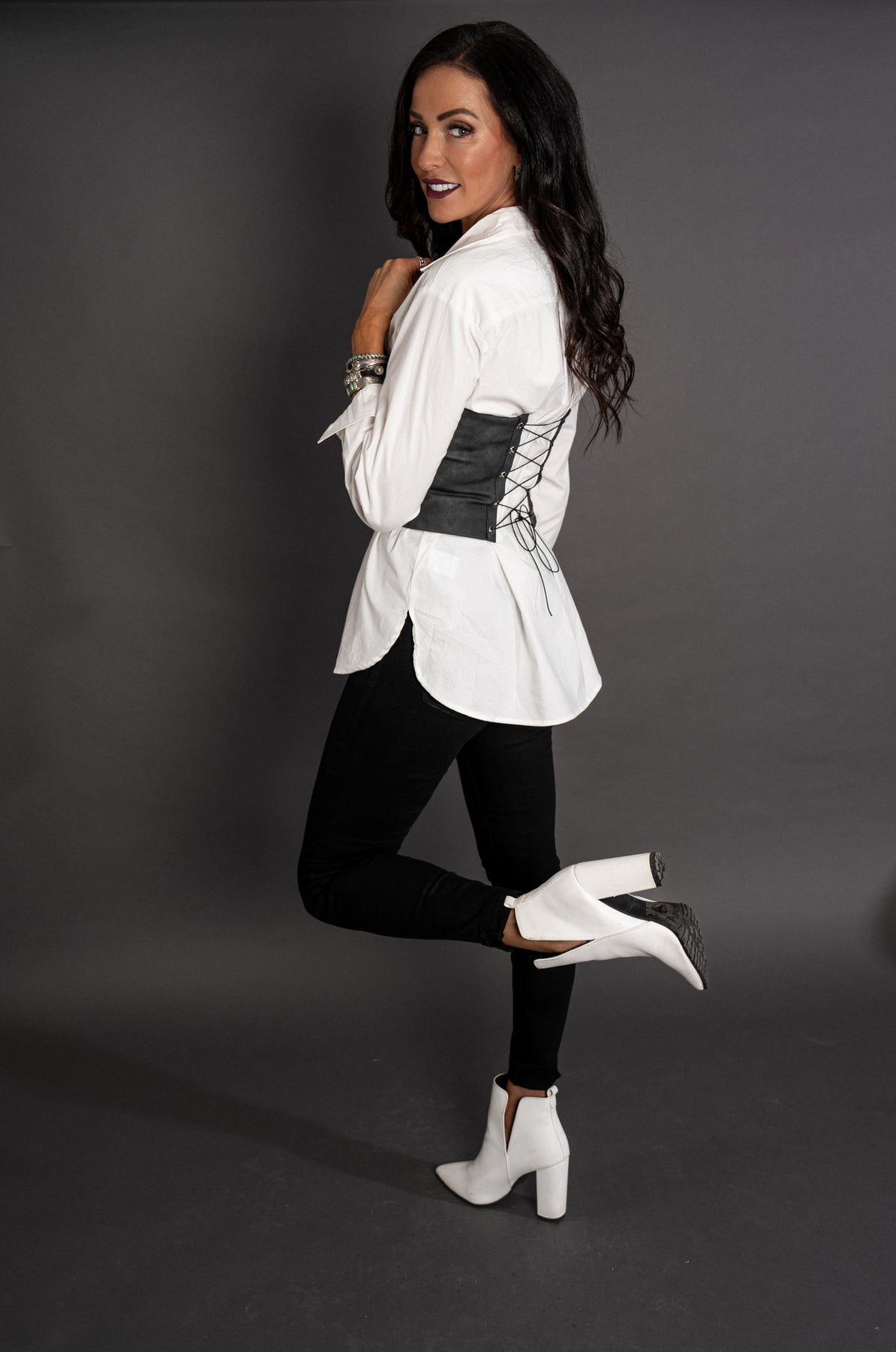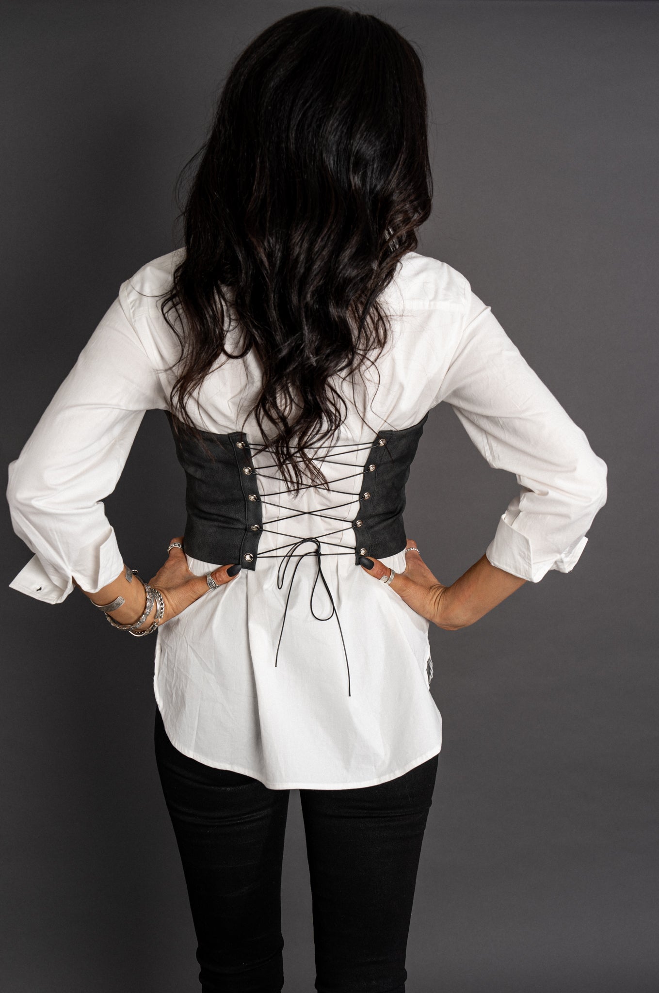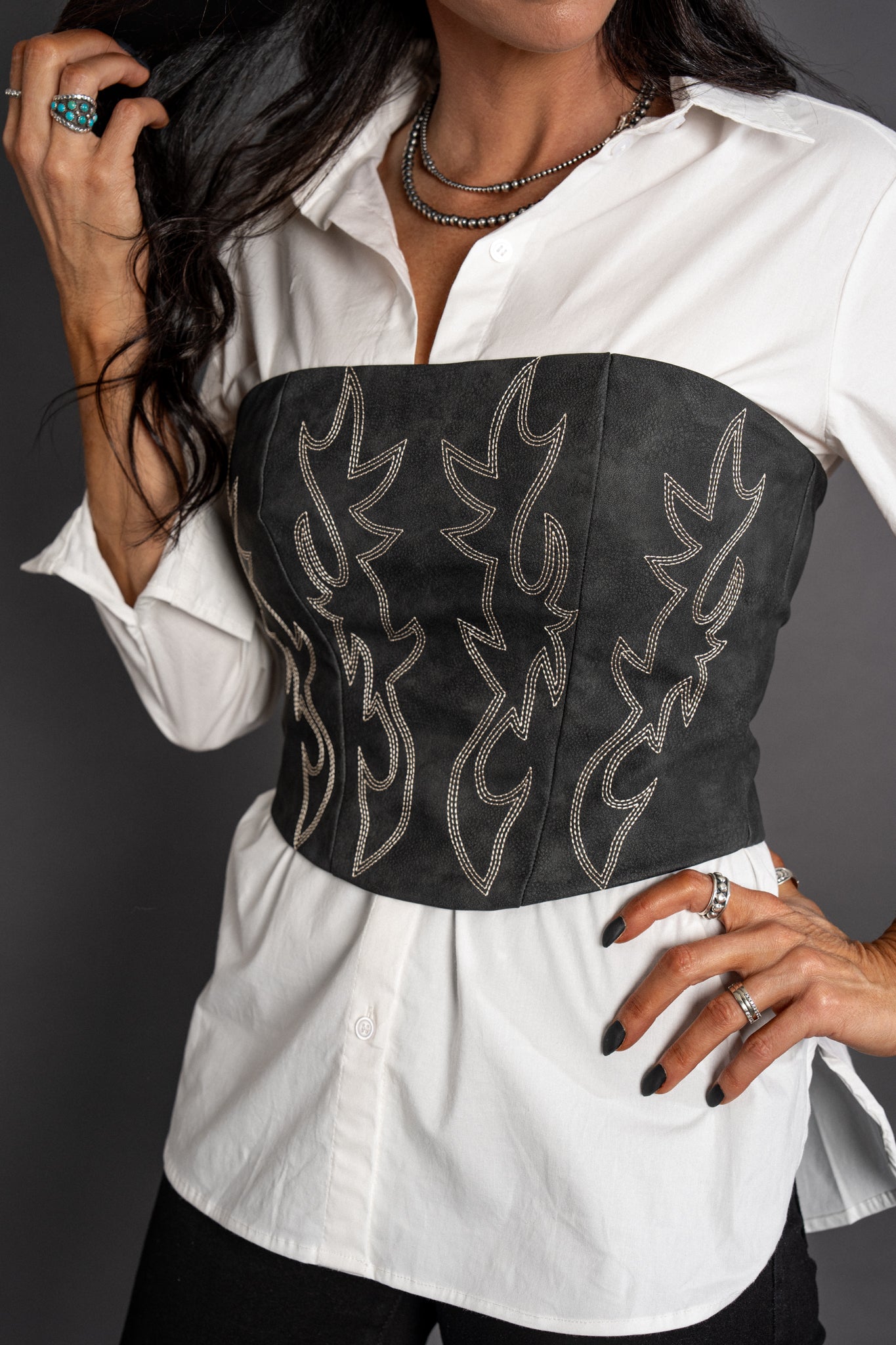 Corset style top with a western flair - peep that boot stitch detail. Full lace up back to ensure the best fit and comfort. Wear solo or pair over the top of your favorite blouse to create a layered look. Rodeos, music fests, and every event in between.
