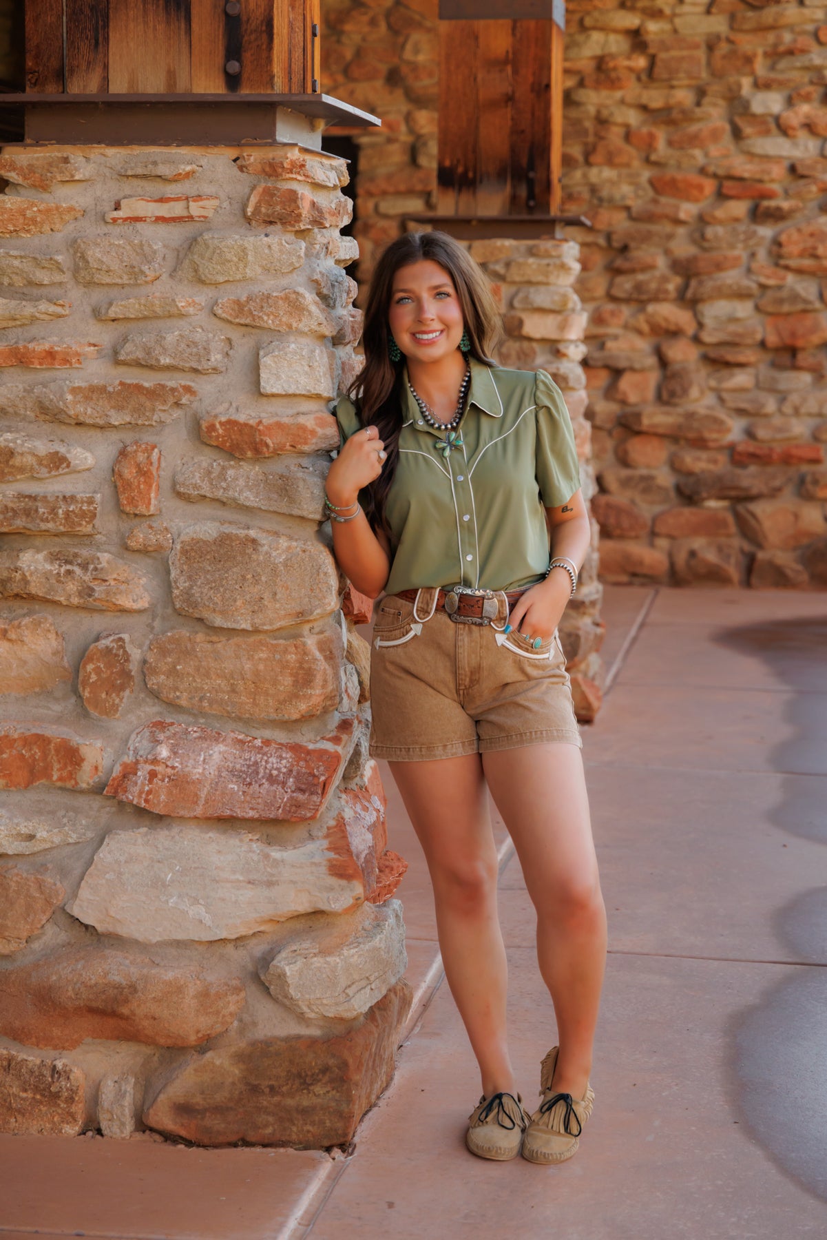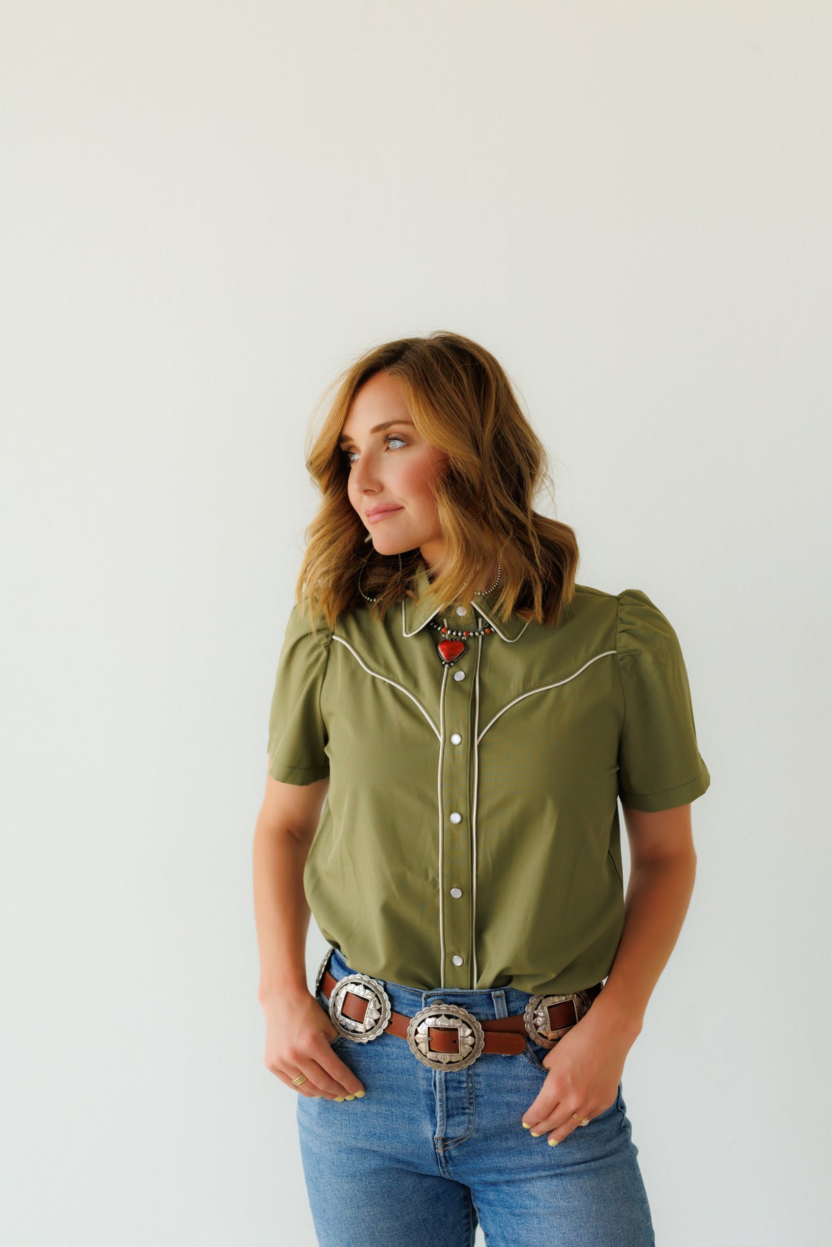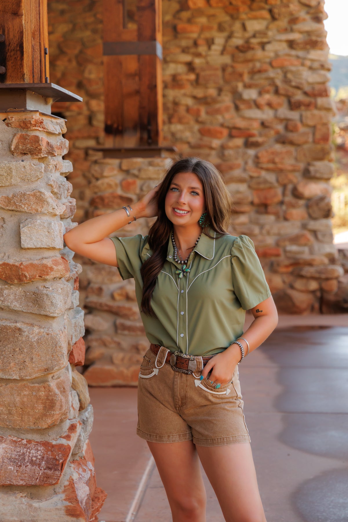 An adorable blouse with short sleeves and full pearl snap front.
