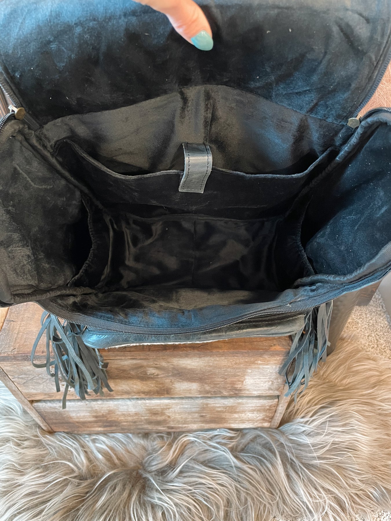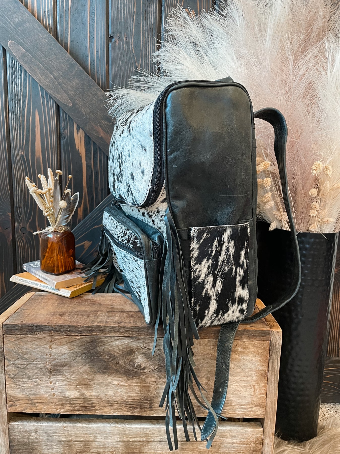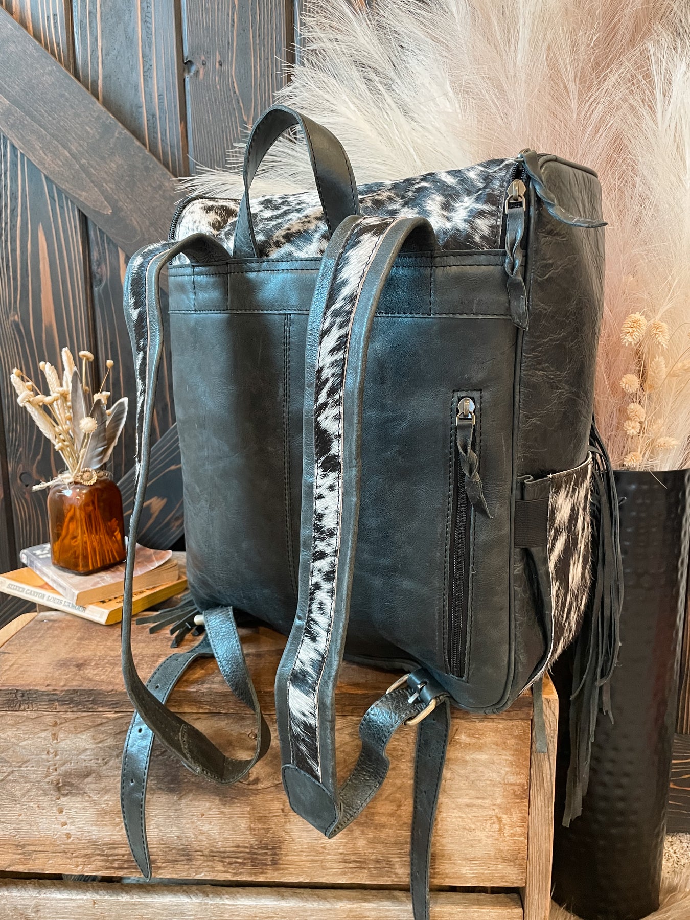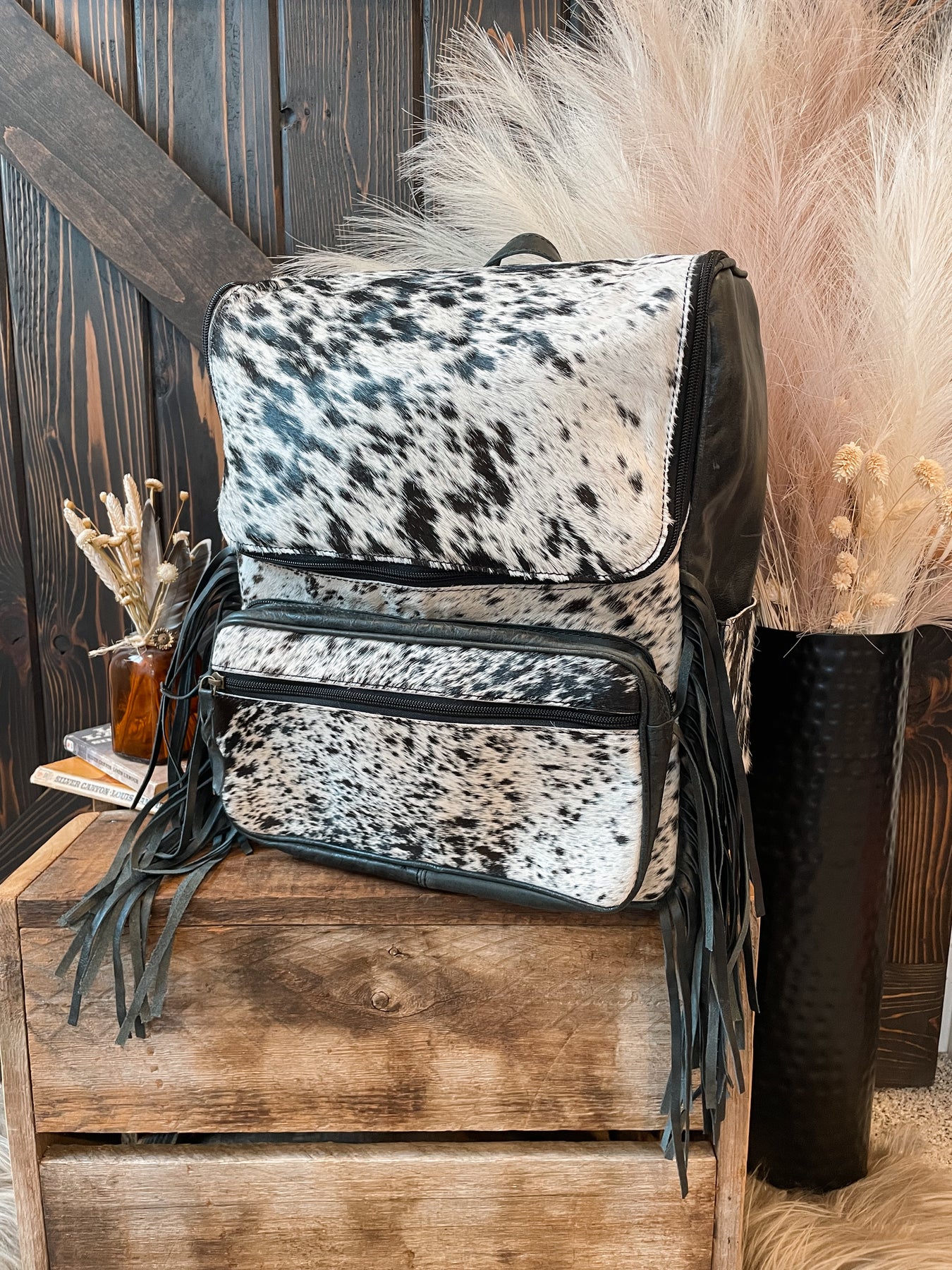 All over cowhide backpack with a back leather panel, adjustable straps with cowhide runner detail, and fully lined. The inside has a two elastic side bottle holders, electronic slide pocket, and is fully lined. . Front has a big front pocket with a smaller front pocket on this compartment as well as two side cinched pockets. Fringe detail. Zipper top closure.