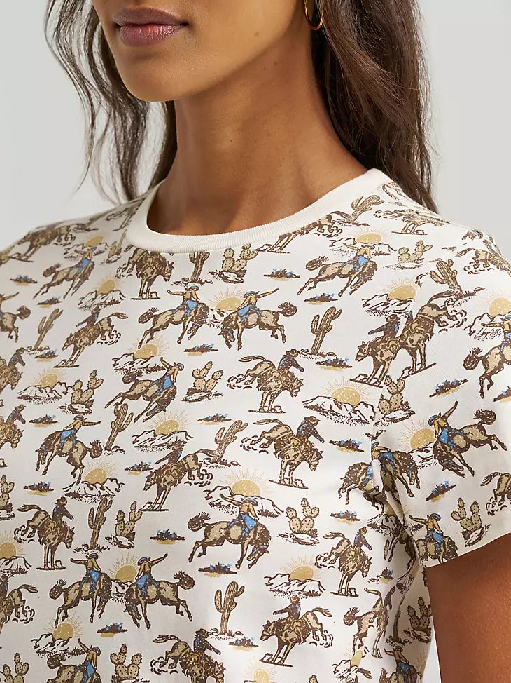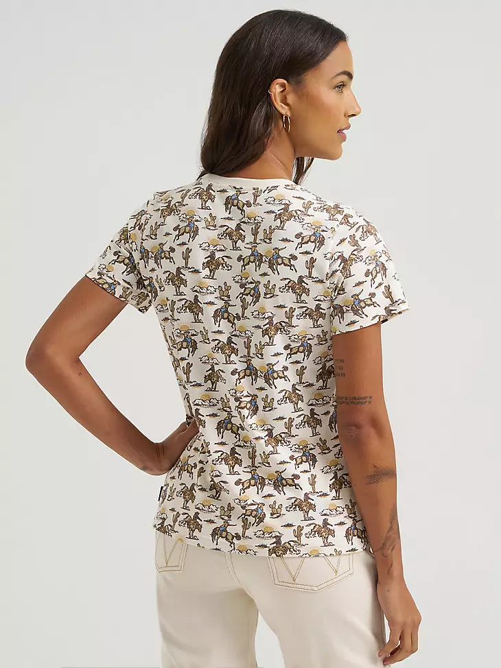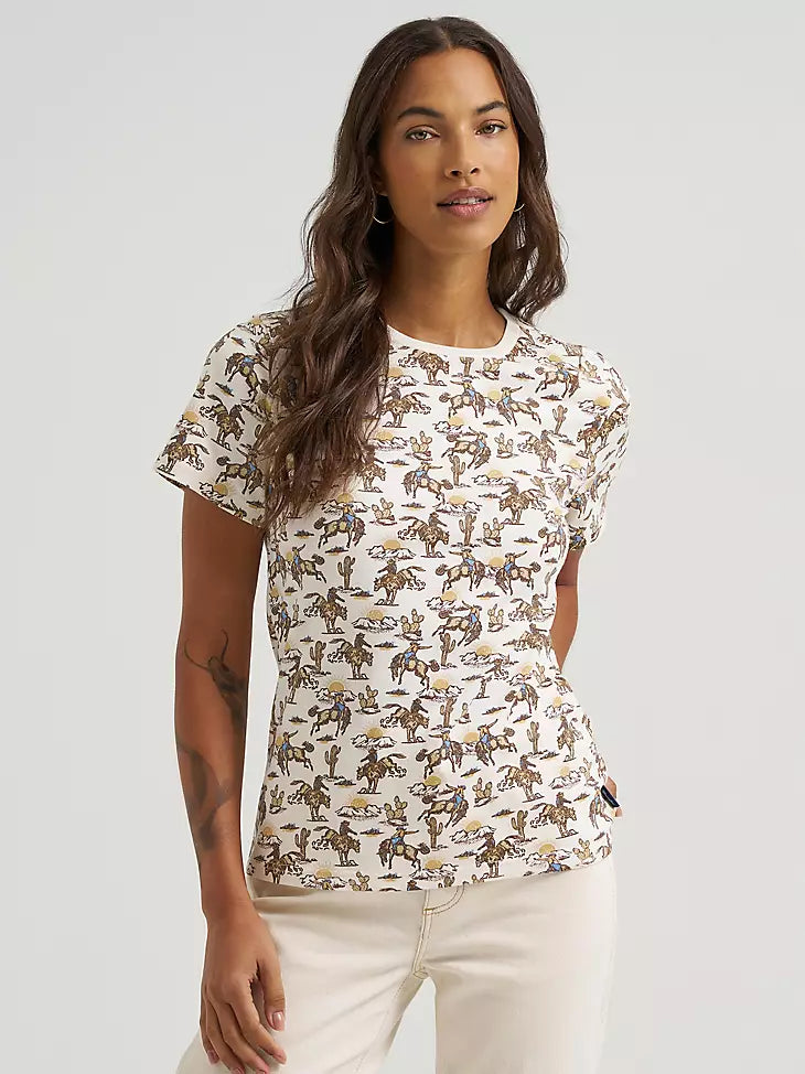 Embrace warmer days in style with our Women’s Wrangler Retro® Printed Slim Tee. It comes with a yarn-dyed jacquard patchwork print full of muted Americana tones and Western motifs to ground your outfits with a little cowgirl authenticity. This classic crewneck shirt is cut with a slim fit that hugs your shape. Plus, it’s crafted from cotton for comfort from sunup to sundown.