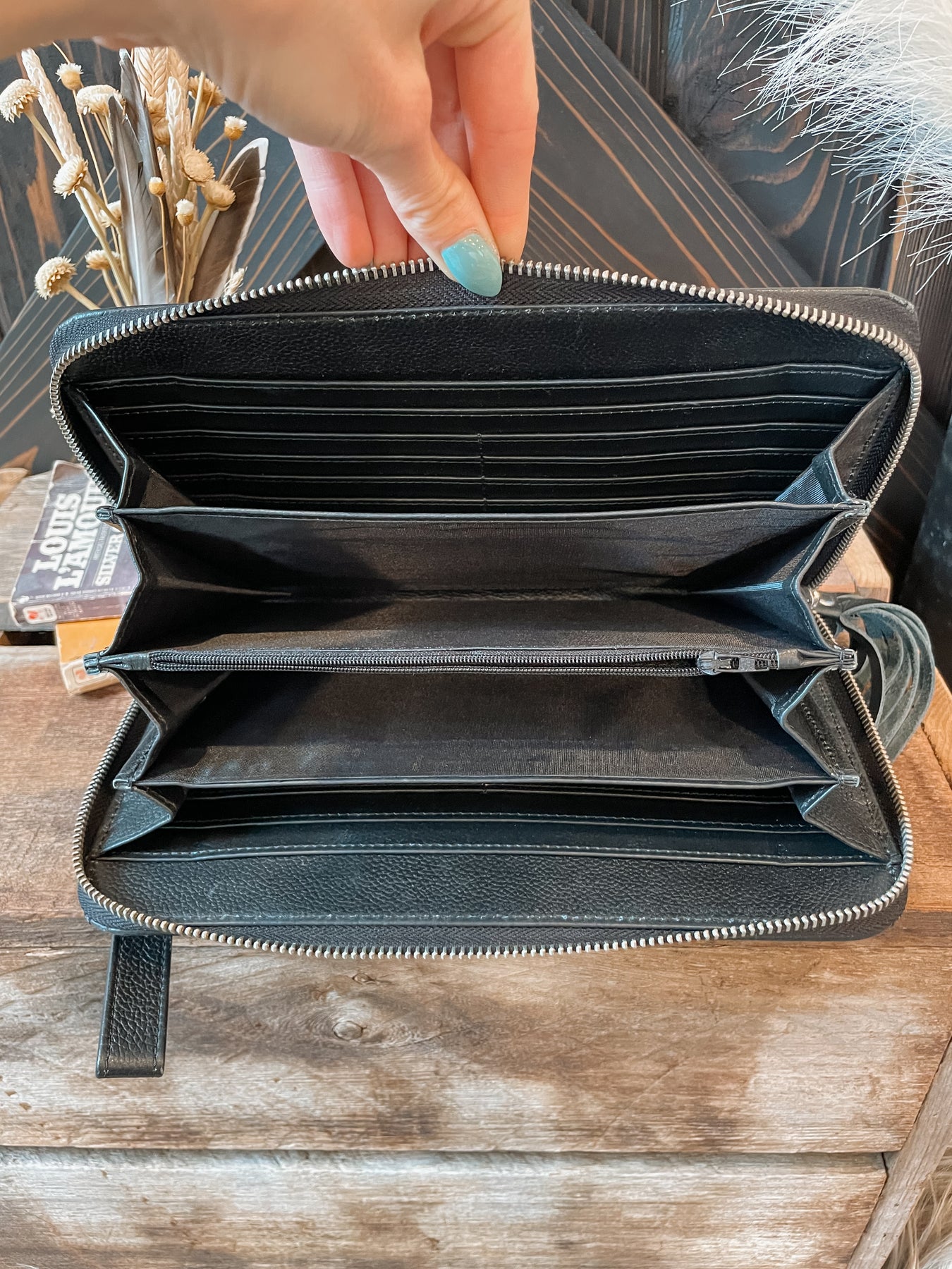Use it as a wallet or just as a means to keep yourself organized. All over cowhide with zipper closure. Comes with optional/removable wristlet strap. Features: 16 card holders, coin zipper pouch, checkbook holder, and various slots for other items.