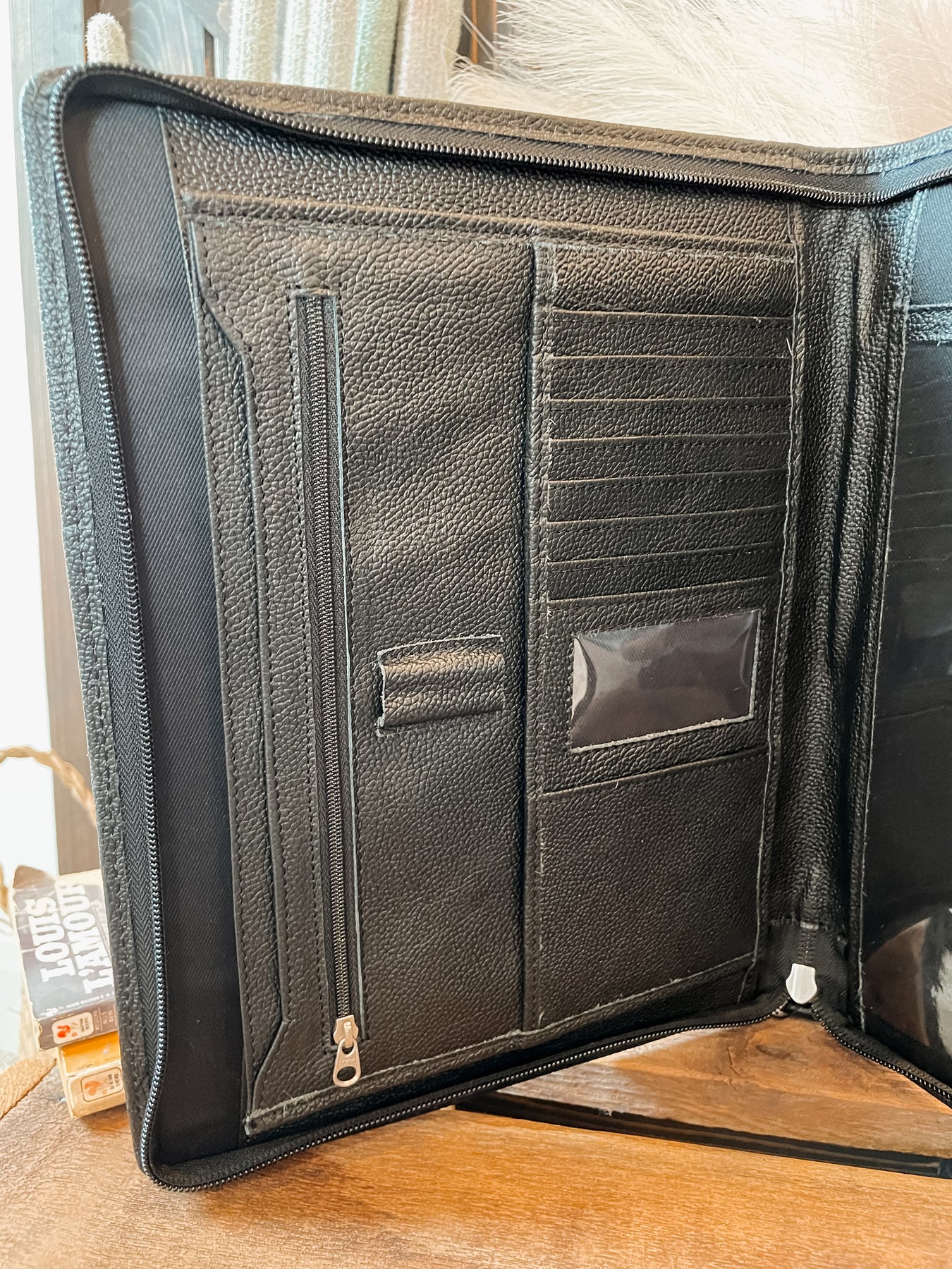 Cowhide zipper planner. Put your planner or your appointment book in here. Has compartments for papers, notebooks, business cards, pends, and a zipper pocket.