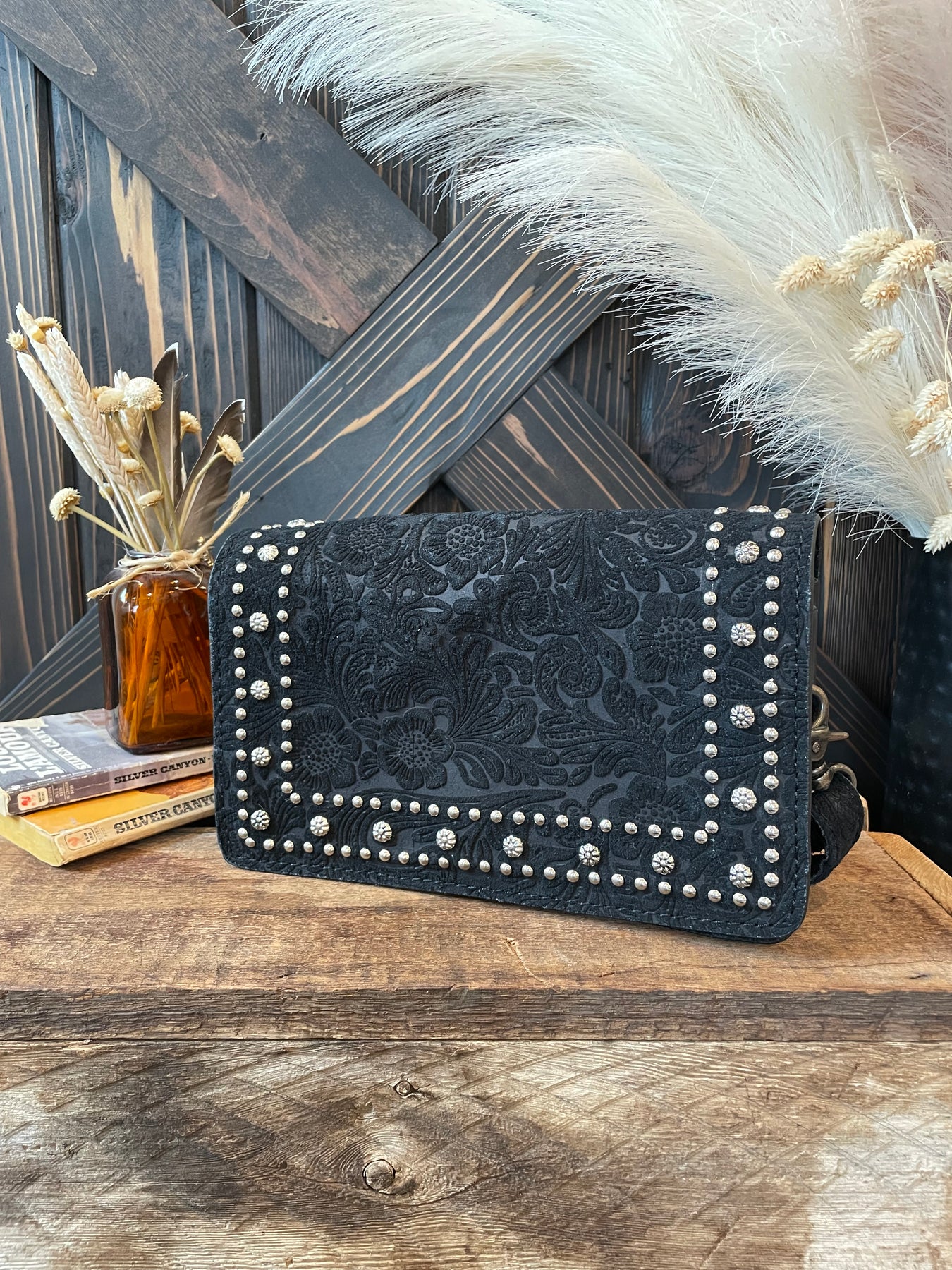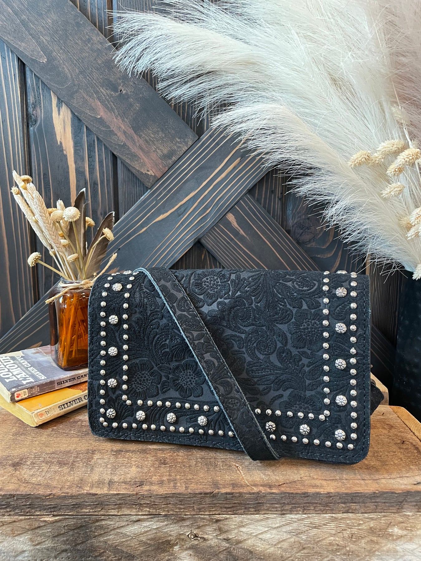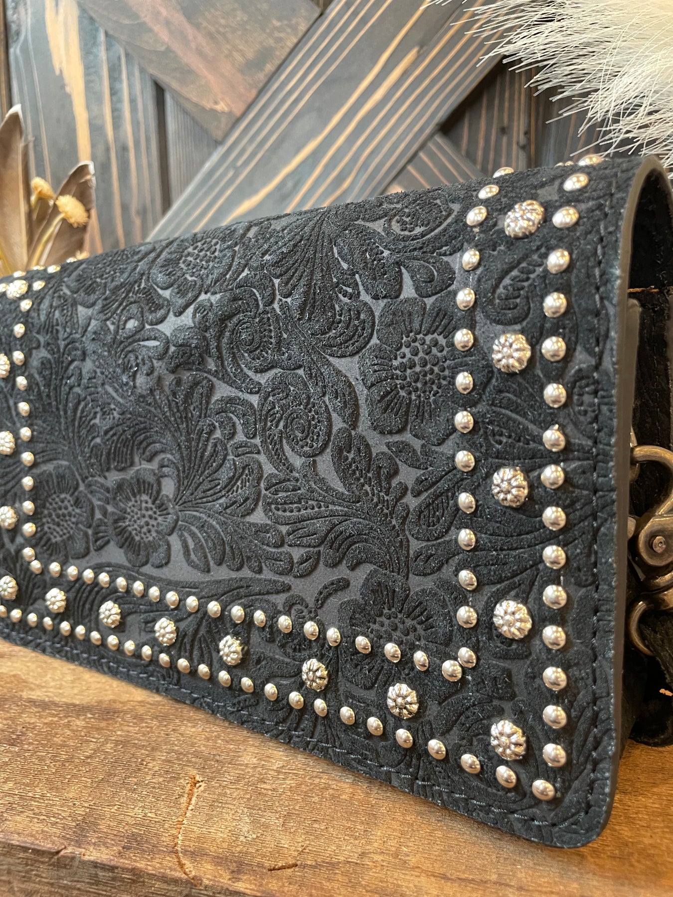 Western glam and couture - this purse is simply gorgeous. Concho details throughout, black sleek embossed leather all over. Fold over top magnetic closure with zipper back privacy pocket. Inside is fully lined with inner zipper privacy pocket.