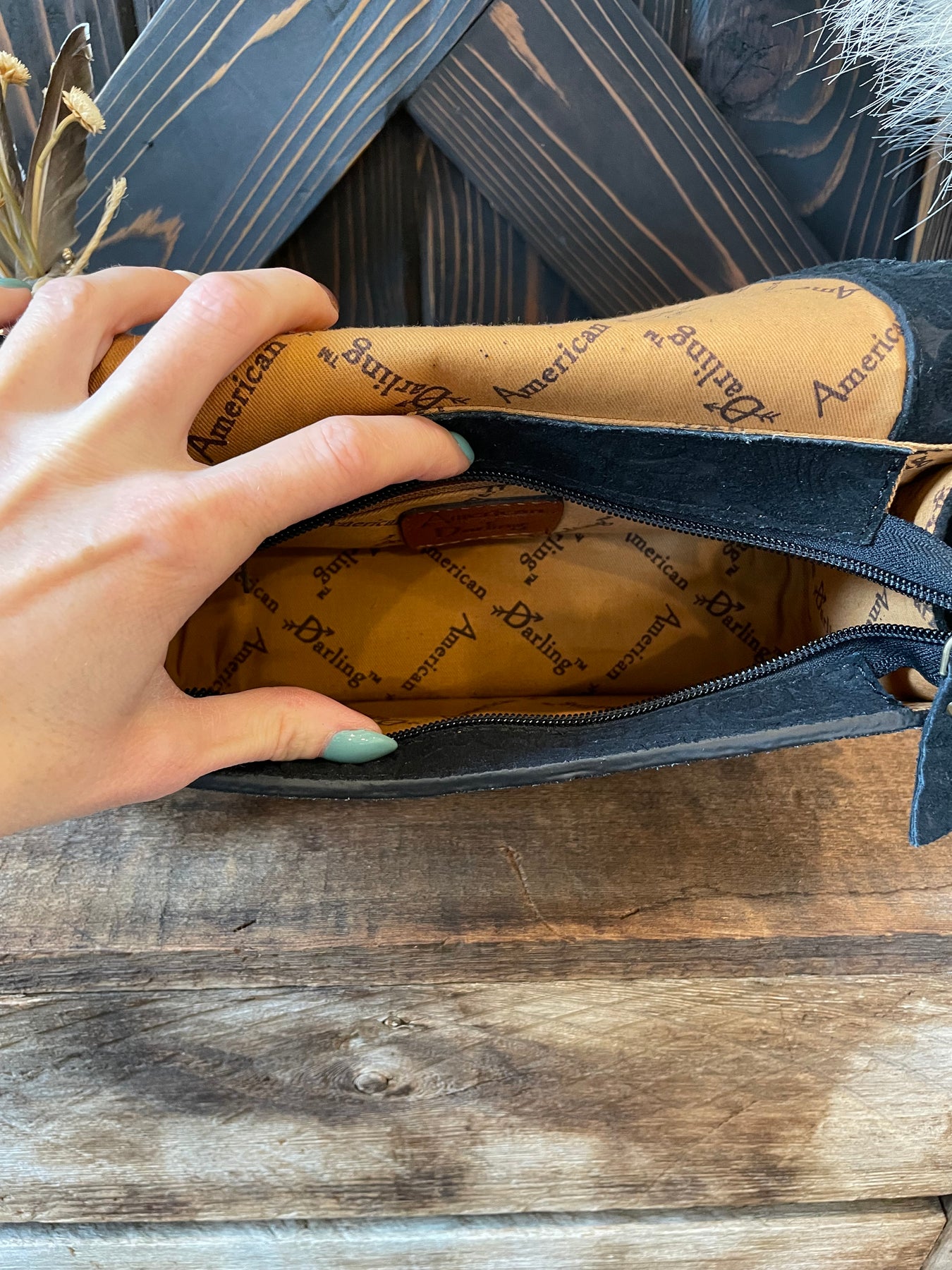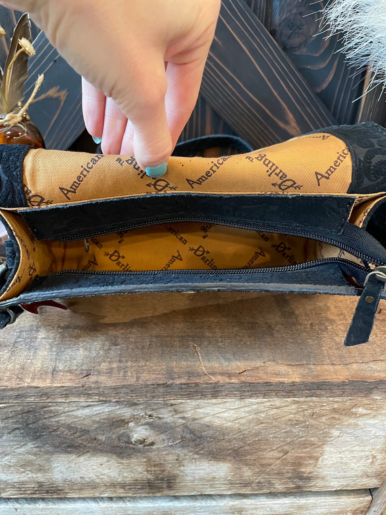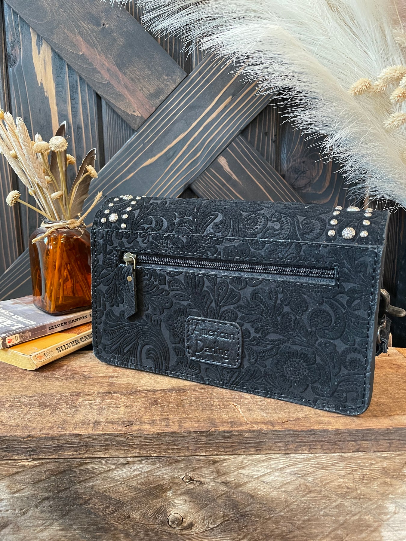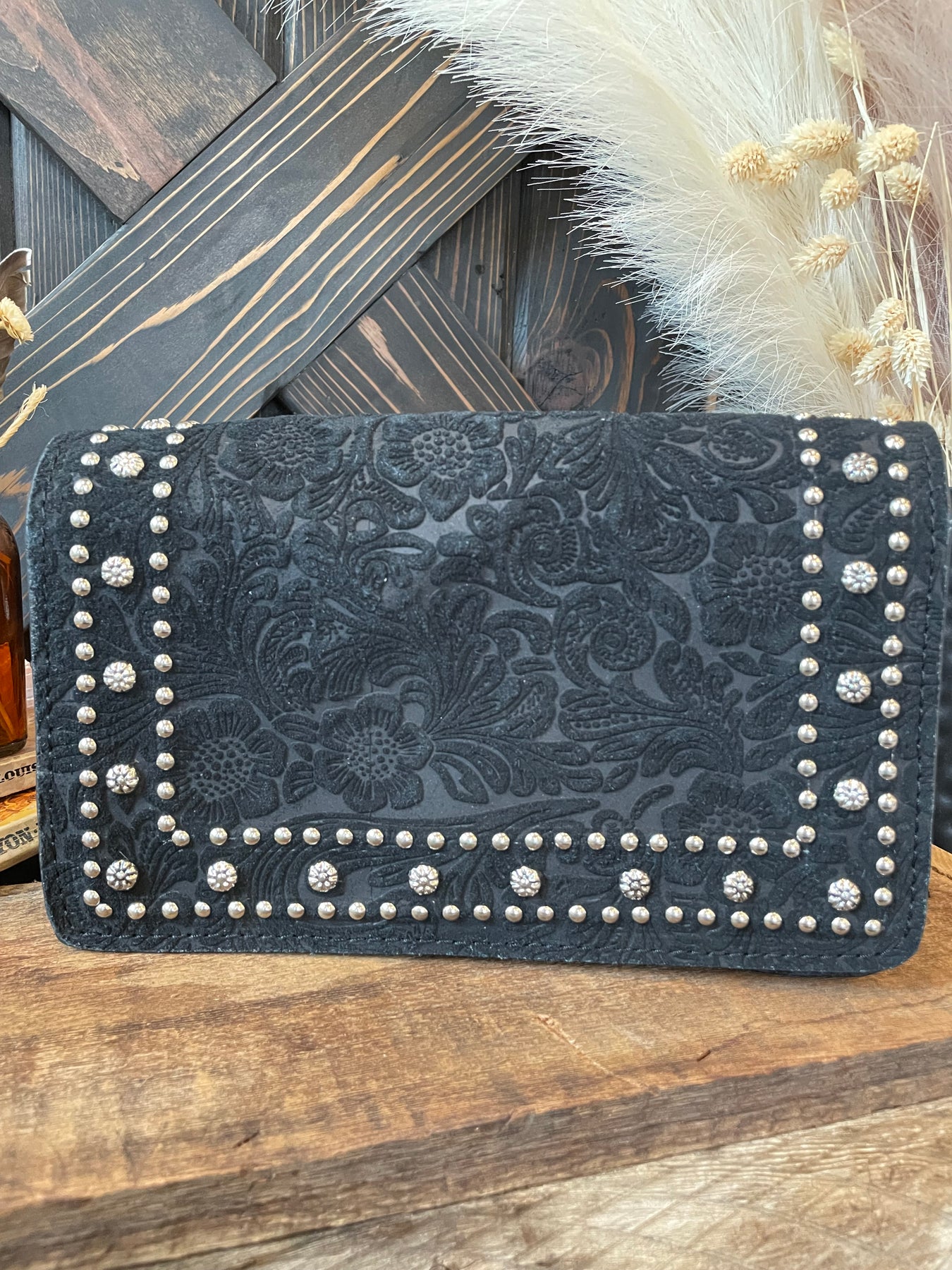 Western glam and couture - this purse is simply gorgeous. Concho details throughout, black sleek embossed leather all over. Fold over top magnetic closure with zipper back privacy pocket. Inside is fully lined with inner zipper privacy pocket.